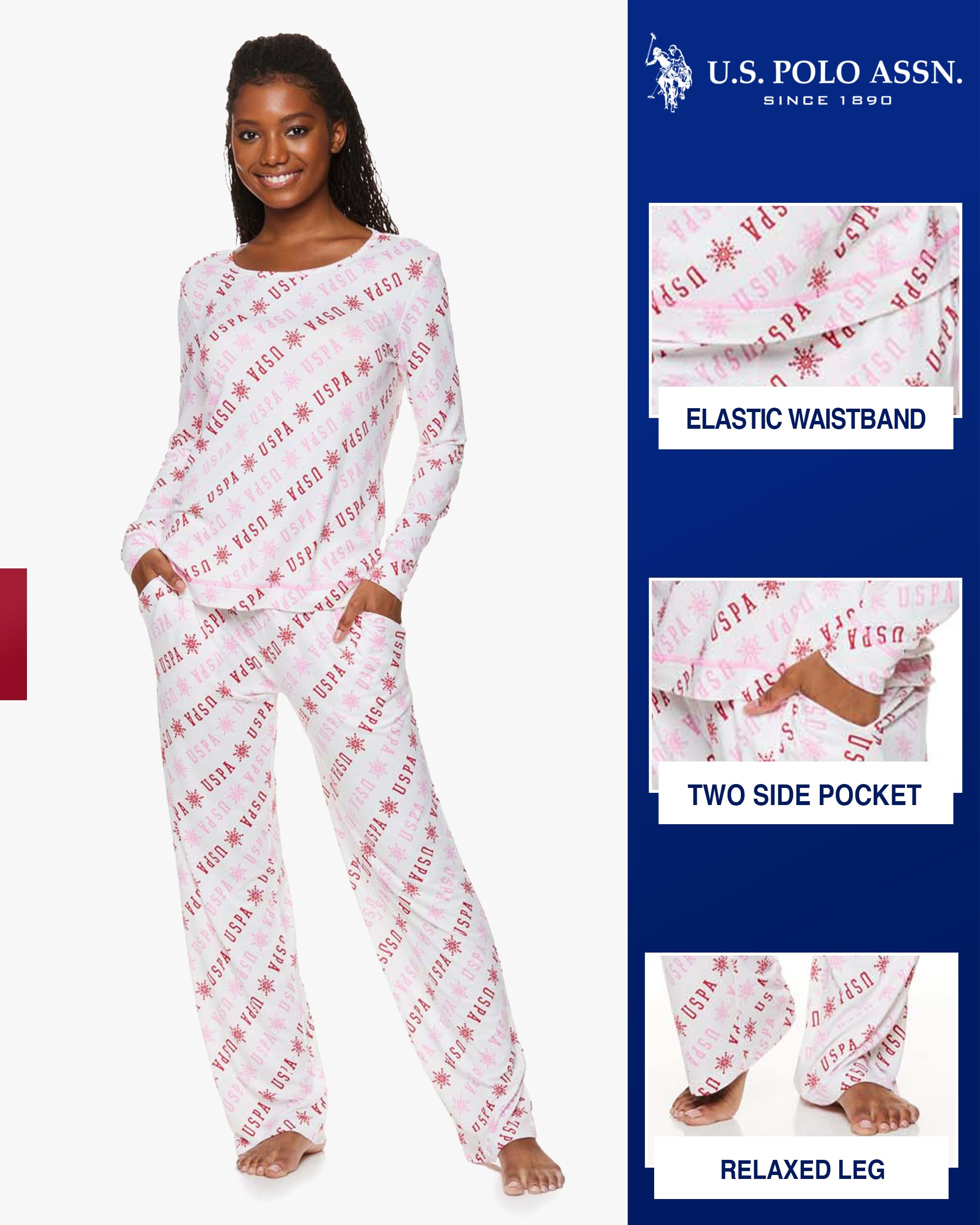 Description The U.S. Polo Assn. Ladies Pajamas Set is a stylish and comfortable choice for lounging, resting, or sleeping, making it a perfect womens sleepwear gift for yourself or someone special. This 2-piece pajama set for women includes a cozy, long-sleeve pullover top featuring the iconic U.S. Polo Assn. logo, along with full-length pajama pants that come with or without pockets. Designed for ultimate comfort, the pajama pants feature an elastic waistband and a relaxed leg fit. Made from machine-washable fabric, these pajamas are easy to care for, and their comfort and style make them an ideal gift for the holiday season, whether for mom or any woman on your list.
