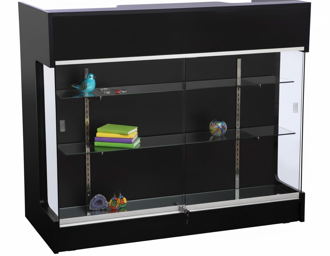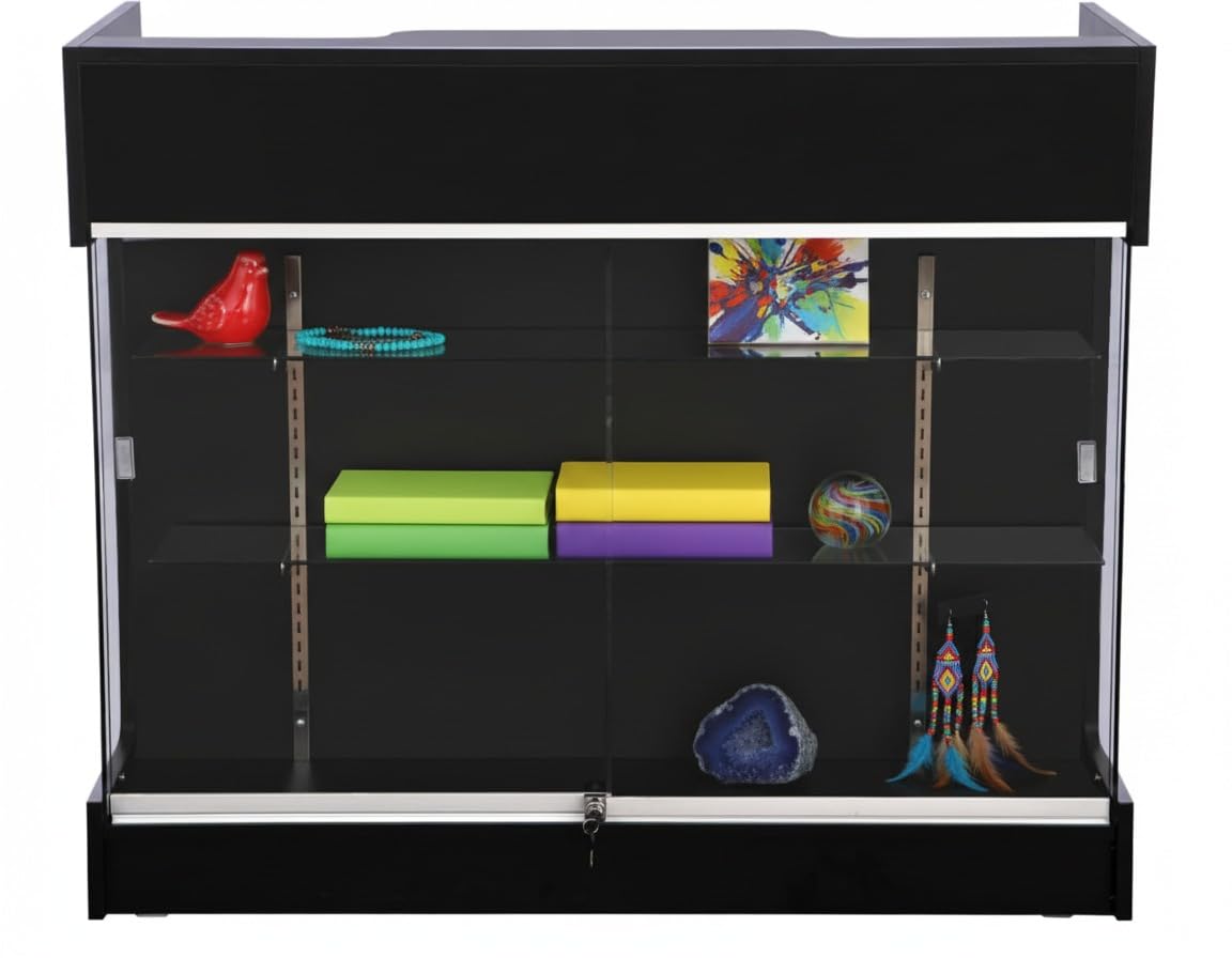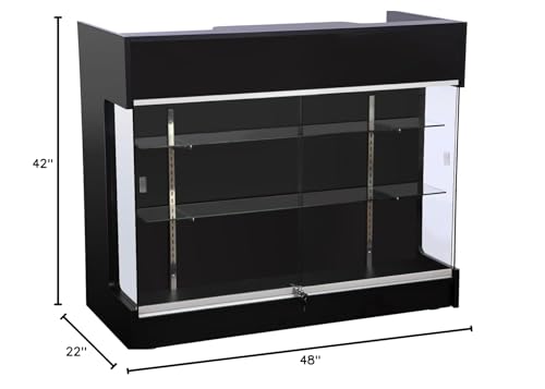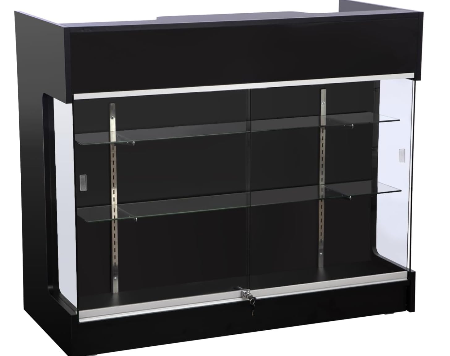 Give your store a professional upgrade with this 4ft Ledge Top Counter with Showcase, designed for maximum functionality, storage, and security. Featuring a tempered glass display area, sliding glass doors, and a locking front, this cabinet is perfect for showcasing jewelry, collectibles, electronics, or accessories while keeping them safe from dust and unauthorized handling. The counter includes 2 built-in locking drawers, offering extra security for cash, small valuables, or important supplies. With adjustable shelves inside the display case, you can easily organize products for the best presentation. Finished in sleek black, this counter blends seamlessly into retail shops, boutiques, smoke shops, trade shows, and showrooms. Built with durable tempered glass and a sturdy frame, this showcase counter is a long-lasting investment that combines elegance, storage, and protection all in one.