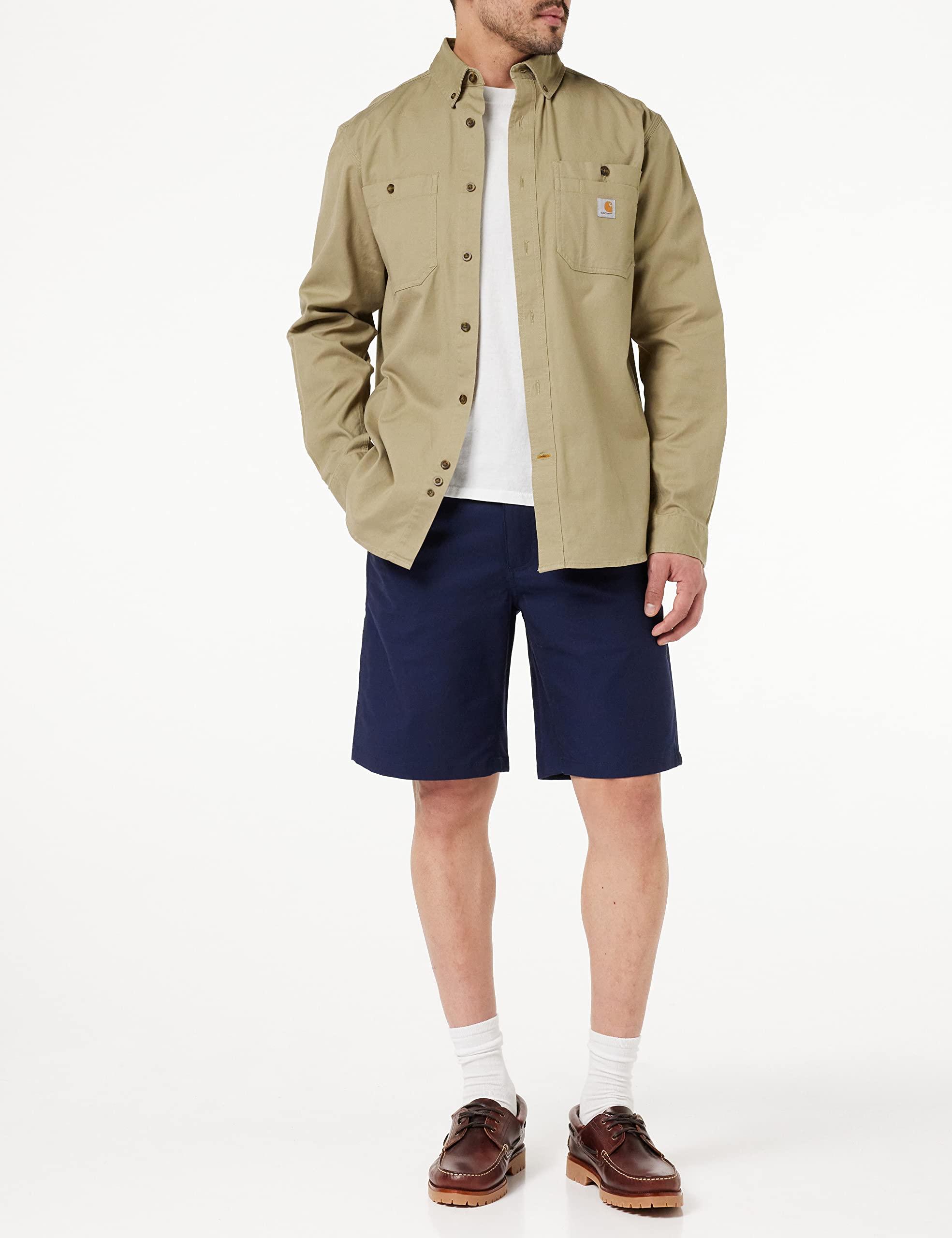 Description This durable work shirt comes standard with built-in stretch, so whatever you're doing, it's easier to do. Relaxed fit 6.5-Ounce, 98% cotton/2% Spandex rugged flex technology for ease of movement two chest pockets with additional left-chest pocket panel for added storage button-down collar two-button adjustable cuffs with extended plackets faux horn buttons drop-tail hem for additional coverage Carhartt-strong triple-stitched main seams imported