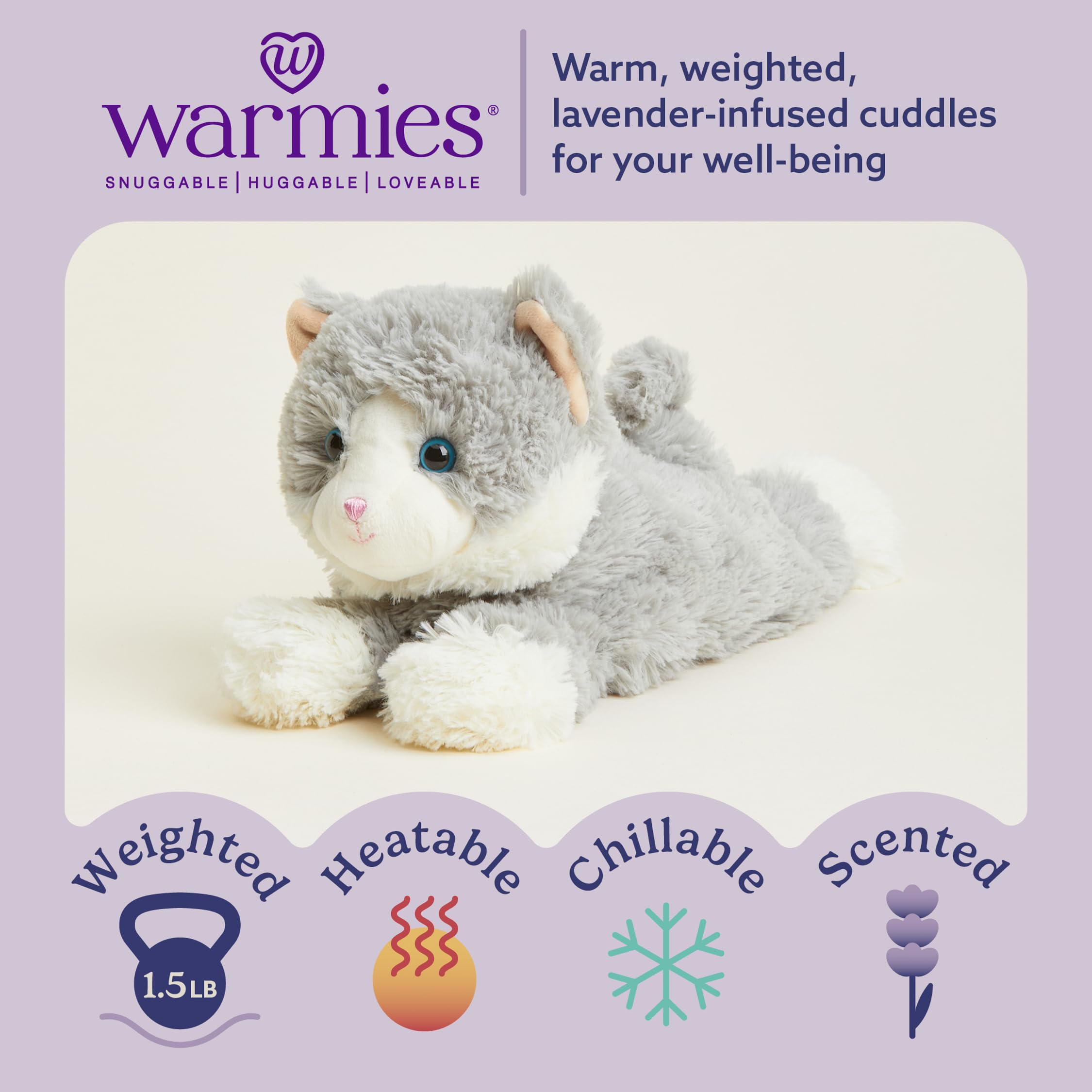 Warmies Microwavable Stuffed Animal: Laying Down Gray Cat is a snuggable, huggable, lovable weighted plush toy for all ages that can be easily heated to provide hours of soothing warmth or chill in the freezer for a refreshing cool touch. Perfect for comfort and snuggles. 13 inches tall, 1.5 lbs.