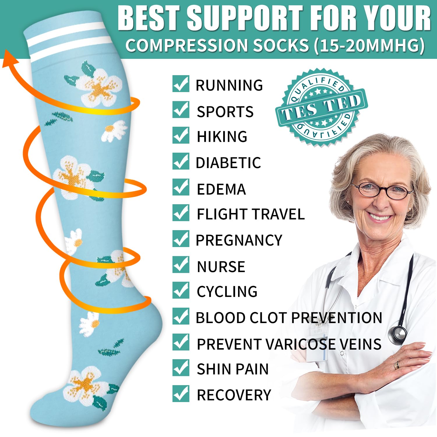 PERFECT FOR EVERYONE-Ours premium compression socks for all your favorite activities.These socks will keep doing their job while you focus on your daily routine,whether you're driving the kids,running around for meetings at work,doing chores at home,or doing anything else at all. everyone can benefit from the power of compression to feel their best and conquer their day, every day.Our socks perfect for everyone regardless of age,gender and location!