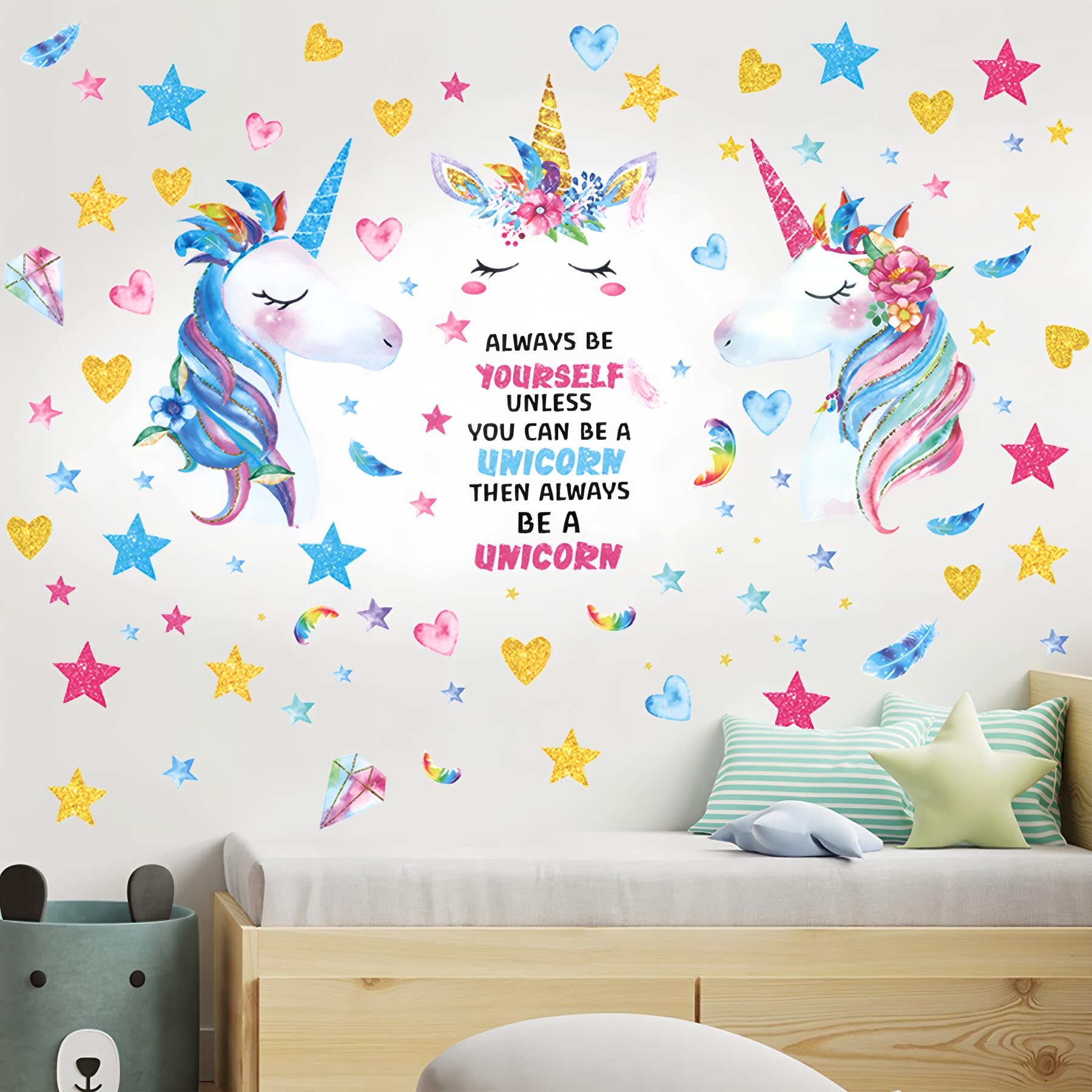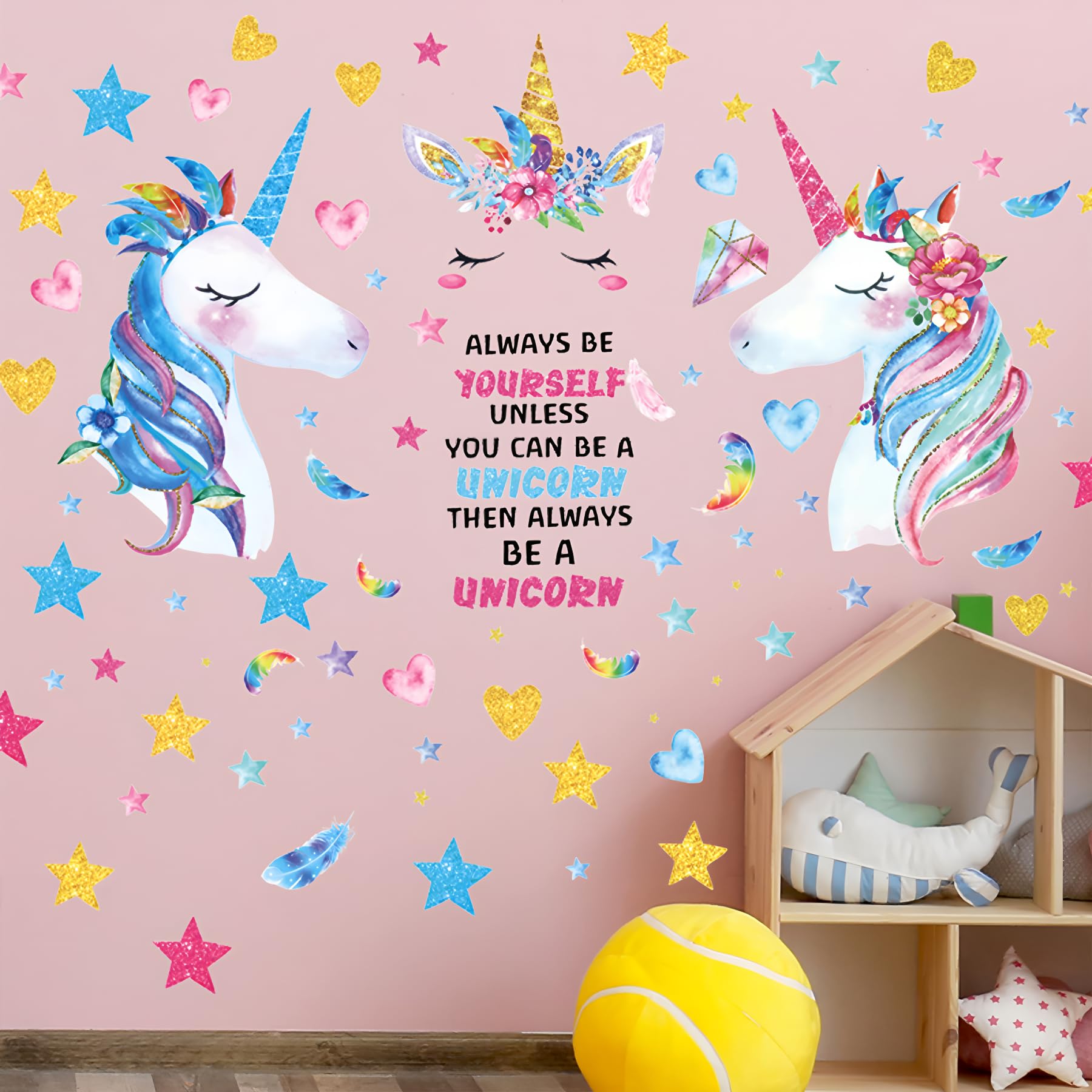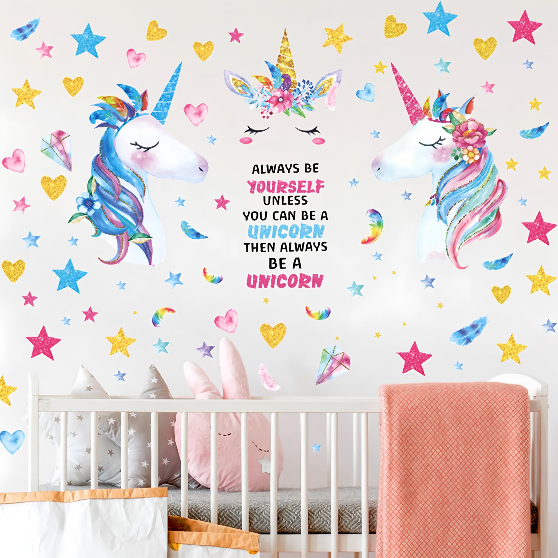 🦄【PERFECT GIFT for GIRLS KIDS】-- Whether you are looking for your daughter's bedroom decoration ideas, Birthday gifts, Festival Gifts or just looking for girl wall decoration or merchandise, ,Your girls can put every part anywhere they want. This colorful Unicorn decals are perfect for girls'rooms, game rooms, living rooms, nurseries or places that want to be lovely