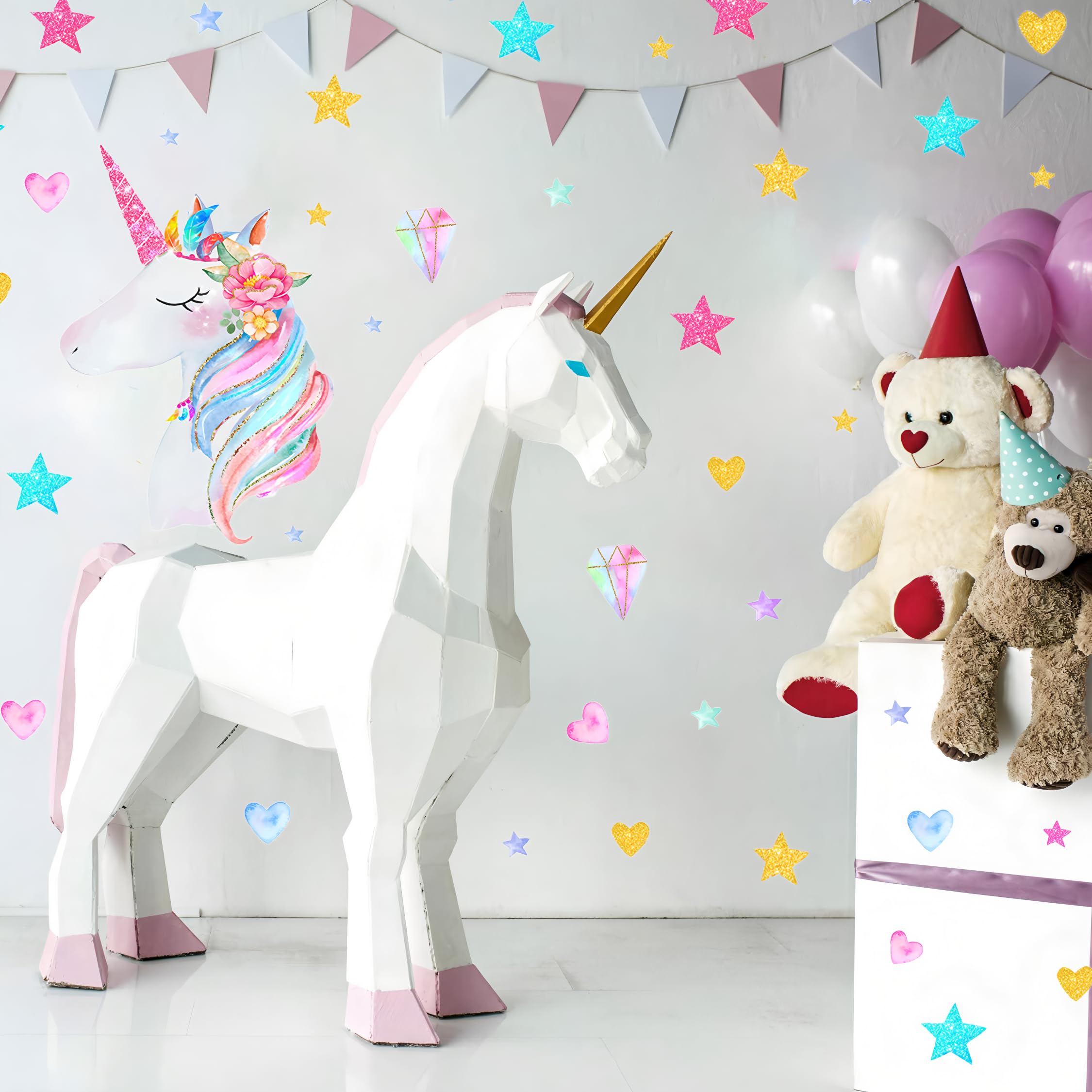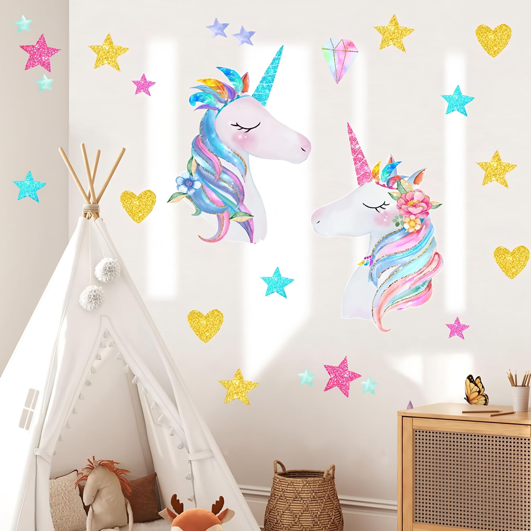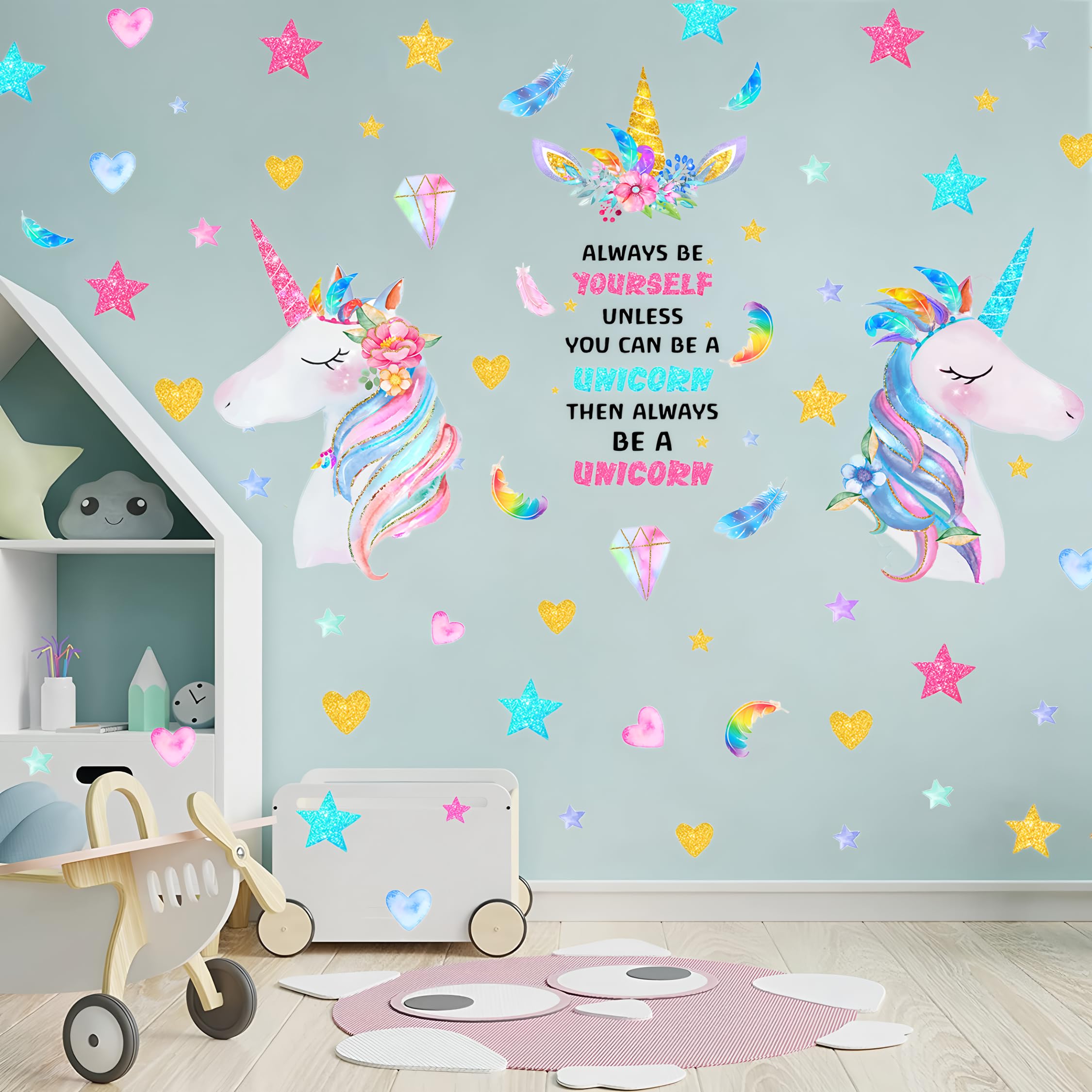 🦄【PERFECT GIFT for GIRLS KIDS】-- Whether you are looking for your daughter's bedroom decoration ideas, Birthday gifts, Festival Gifts or just looking for girl wall decoration or merchandise, ,Your girls can put every part anywhere they want. This colorful Unicorn decals are perfect for girls'rooms, game rooms, living rooms, nurseries or places that want to be lovely