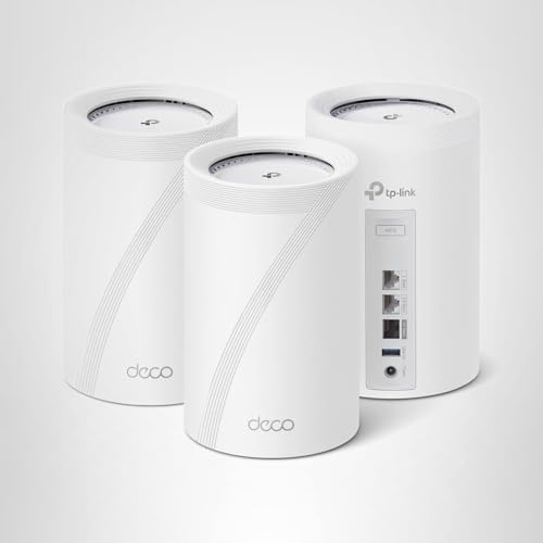 Wi-Fi 7 Mesh Runs your Entire Home at Full Speed Step Up to Next-Gen Wi-Fi with the Deco 7 Pro BE67 (3-Pack) Tri-Band Whole-Home Mesh System. Built on cutting-edge Wi-Fi 7 technology, it delivers 14 Gbps of total bandwidth - perfect for streaming, gaming, video calls, and more. Enjoy smooth, uninterrupted connections throughout your home with AI-driven roaming and coverage up to 8,100 sq. ft. With advanced features like Multi-Link Operation, 4K-QAM, and an enhanced 6 GHz band, the Deco BE67 keeps up to 200 devices connected with exceptional speed and stabilityโno more buffering or dropped connections. Designed for busy, connected homes, this powerful system includes a 10G WAN/LAN port, a 2.5G WAN/LAN port, and a USB 3.0 port for lightning-fast downloads, uploads, and file sharing. Set up your network in minutes with the Deco app, and stay protected with built-in security from TP-Link HomeShield. This purchase includes three Deco BE67 units, one quick installation guide, one RJ45 ethernet cable, and one power adapter. The dimensions for this product are 4.23x 4.23x 6.93 inches.