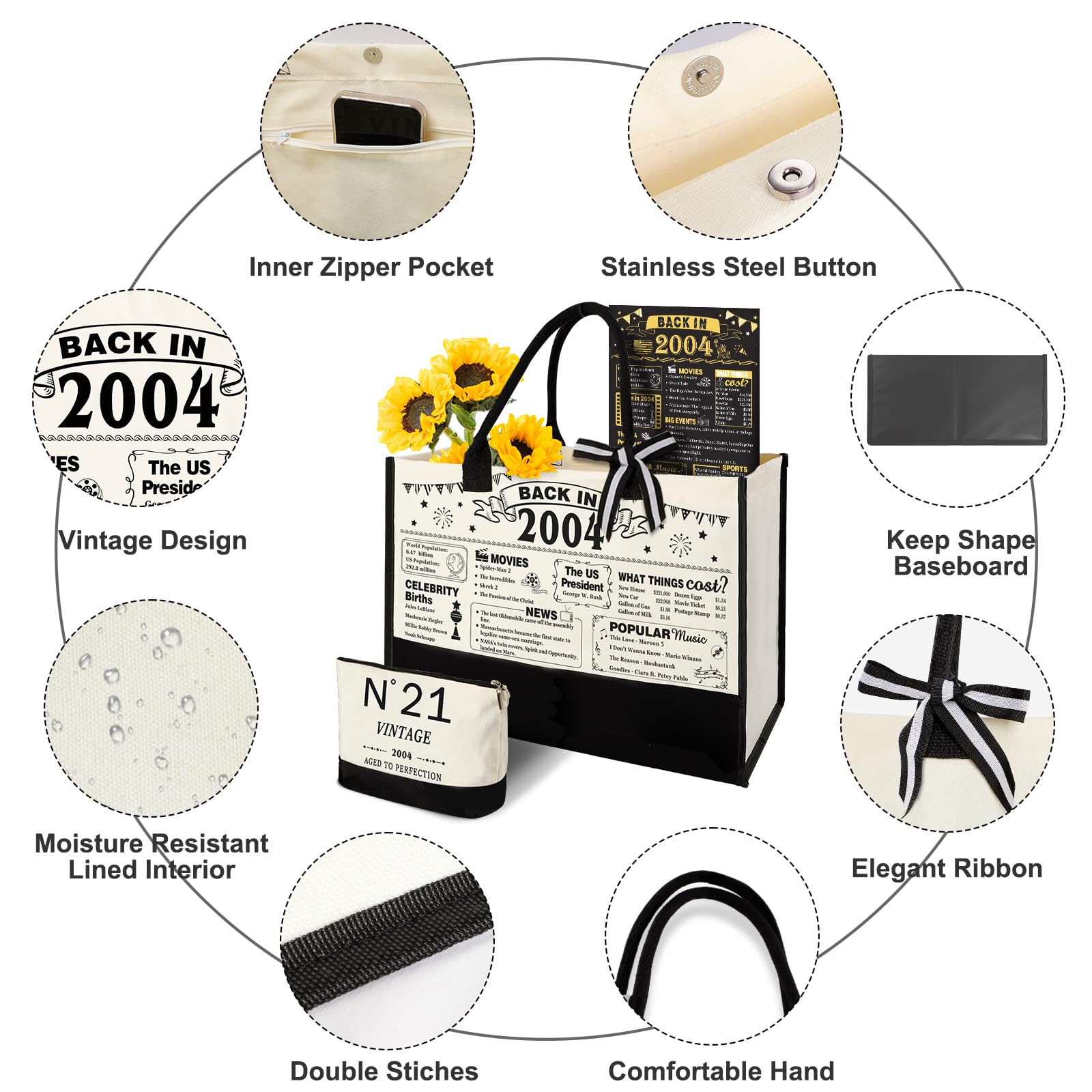Great Gift for Her 21st Birthday: This gifts set for 21st birthday women contains: 1 X 2004 beach bag, 1 X makeup bag, 1 X back in 2004 poster, 1 X greeting card. Unique canvas tote bag gifts set will be a adorable gift for women's 21st birthday. This birthday 21 gifts themed idea makes the perfect choice for putting a smile on her face on their special day.