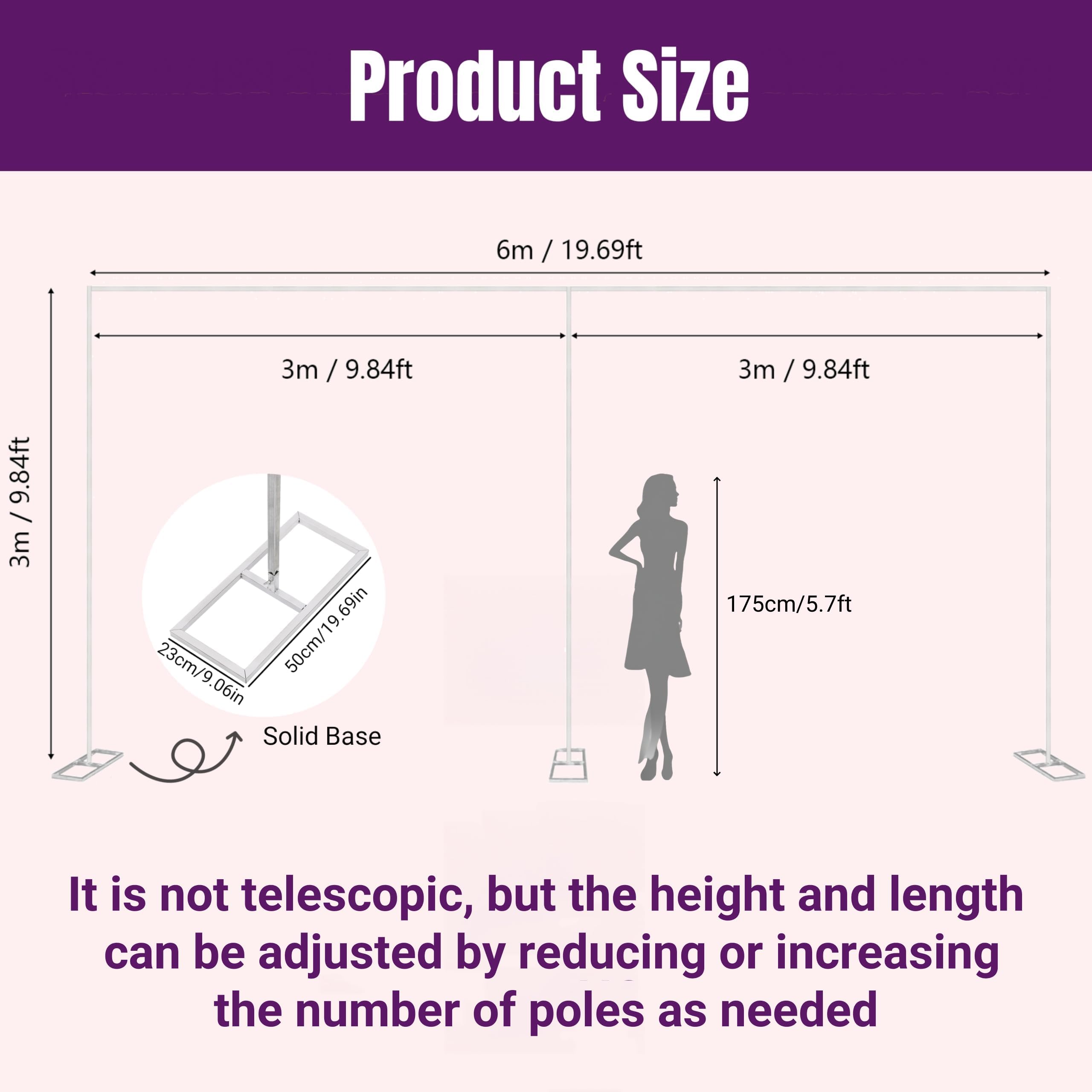 Large Dimension & Adjustable Size: The dimesion of this wedding arch stand is 20 FT long and 10 FT wide. Adjustable width and height by adding or removing pipes, non-telescopic