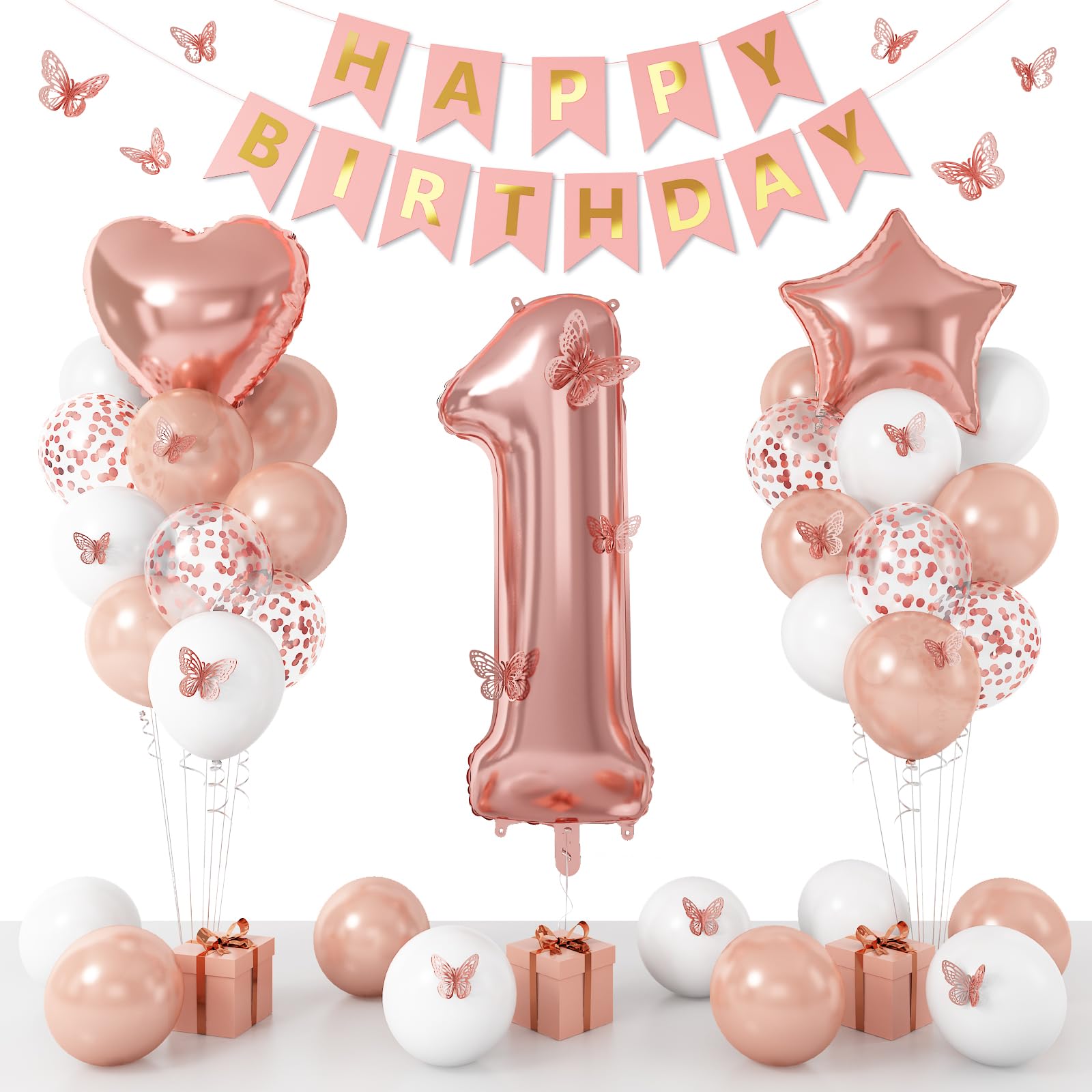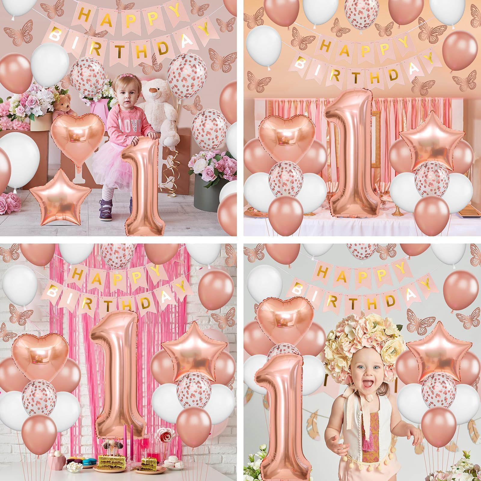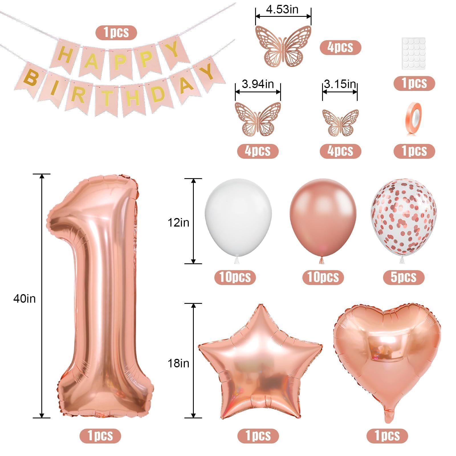 Rose Gold 1st Birthday Decorations - You will get 1pc Rose Gold HAPPY BIRTHDAY banner, 1pcs 40 inch number 1 foil balloon, 1pcs Rose Gold star foil balloon, 1pcs Rose Gold heart foil balloon, 8pcs 12 inch Rose Gold balloons, 6pcs 12 inch white party balloons, 4pcs 12 inch Rose Gold confetti helium balloons, 1pc Rose Gold ribbon.