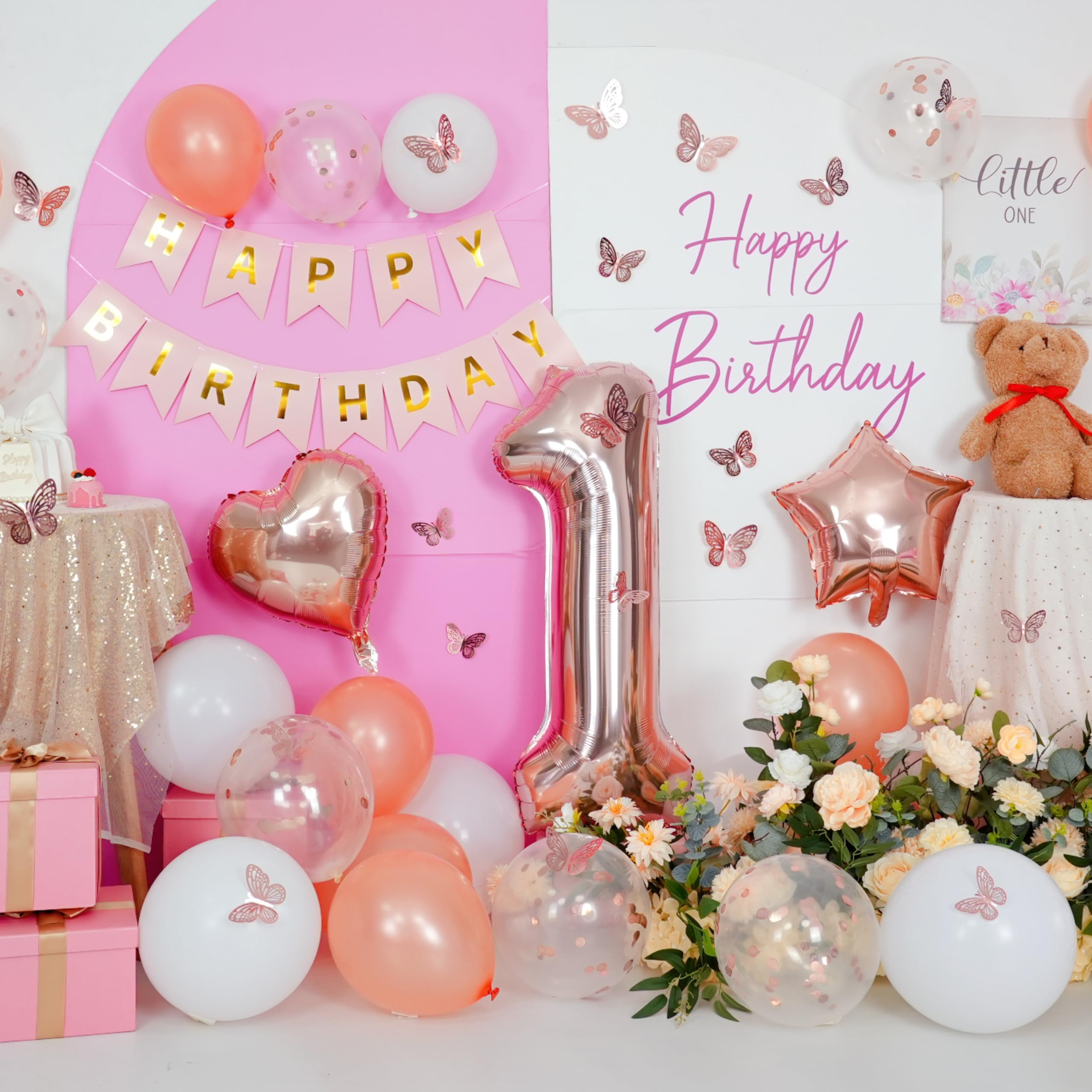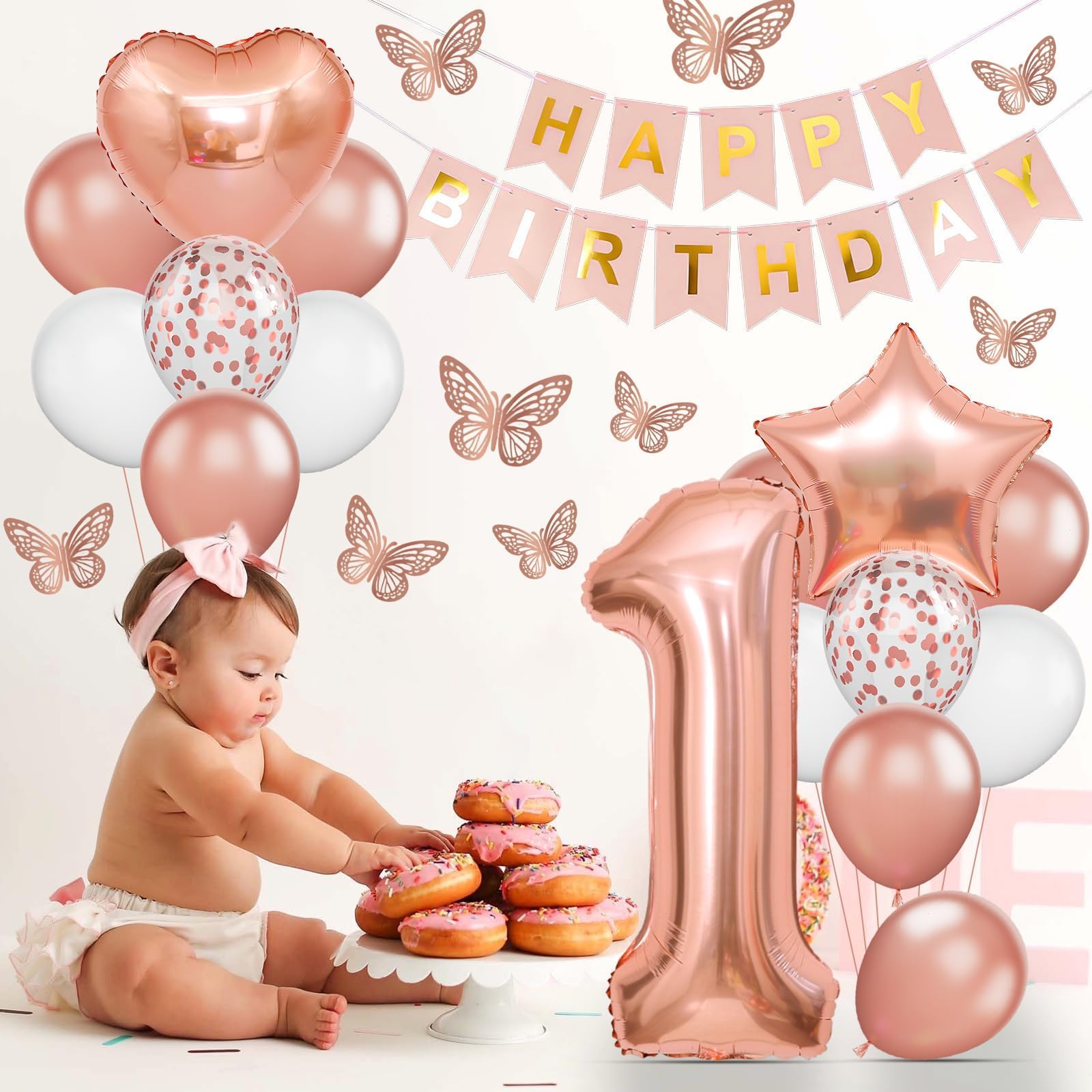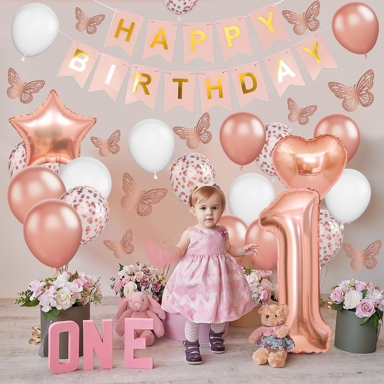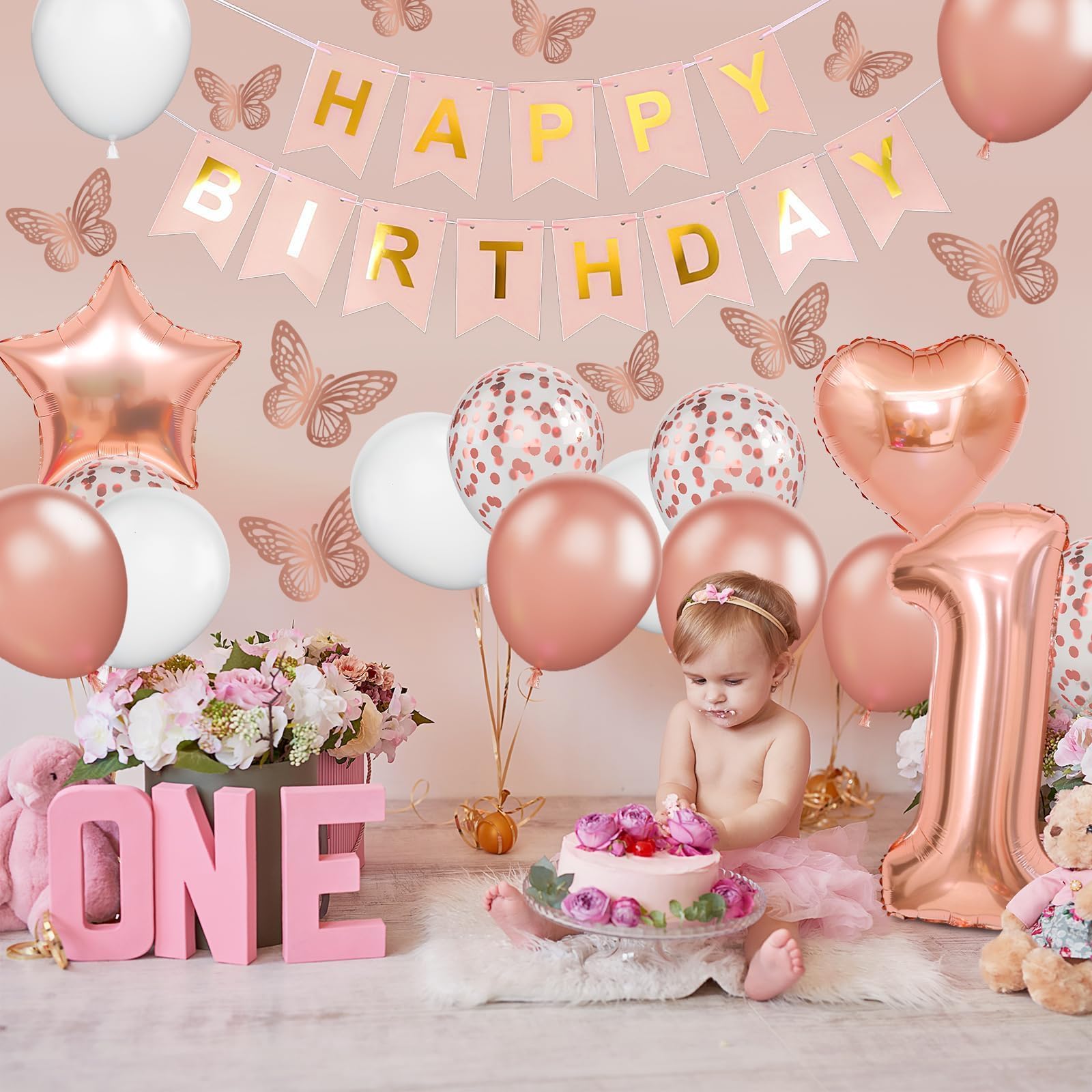 Rose Gold 1st Birthday Decorations - You will get 1pc Rose Gold HAPPY BIRTHDAY banner, 1pcs 40 inch number 1 foil balloon, 1pcs Rose Gold star foil balloon, 1pcs Rose Gold heart foil balloon, 8pcs 12 inch Rose Gold balloons, 6pcs 12 inch white party balloons, 4pcs 12 inch Rose Gold confetti helium balloons, 1pc Rose Gold ribbon.