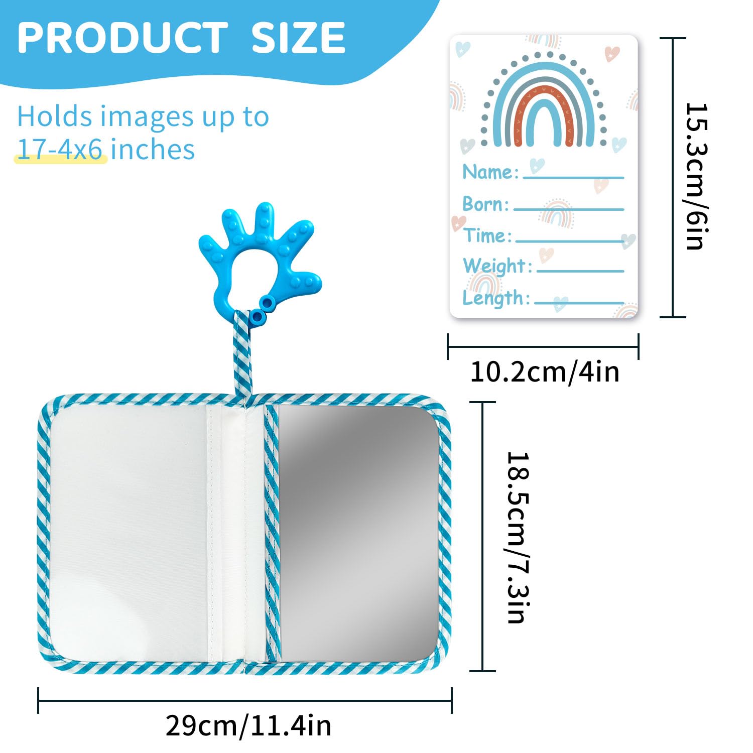 High Quality - Baby photo album of premium soft fabric can hold up to 17 4x6"photos, comes with a bonus large (7x5") baby-safe mirror, milestone and name tag paper. You can put all family members photos inside for your baby to check every day. Compact and thick pockets prevent baby from drooling and tearing. Plastic clips can easily attach it to a stroller, rocking chair or other items without losing it