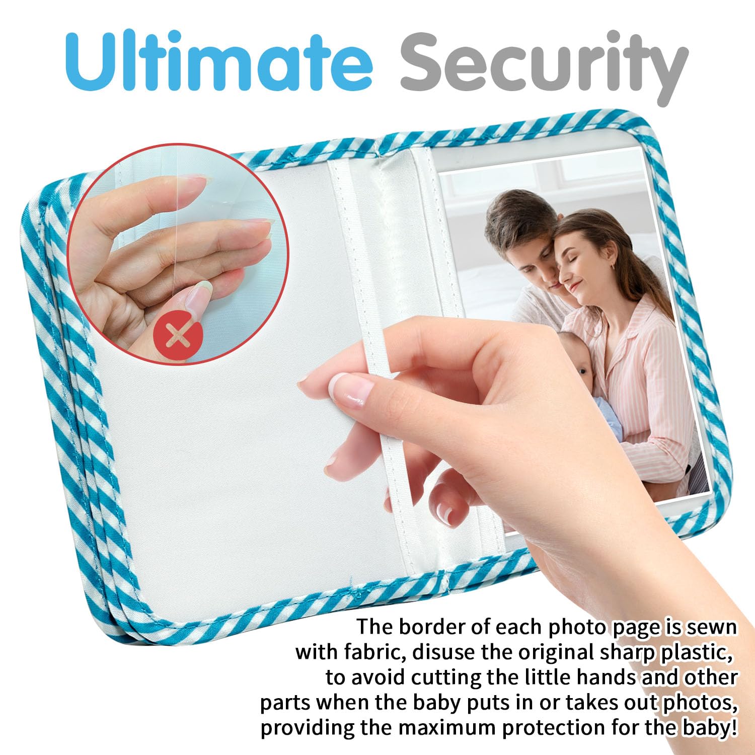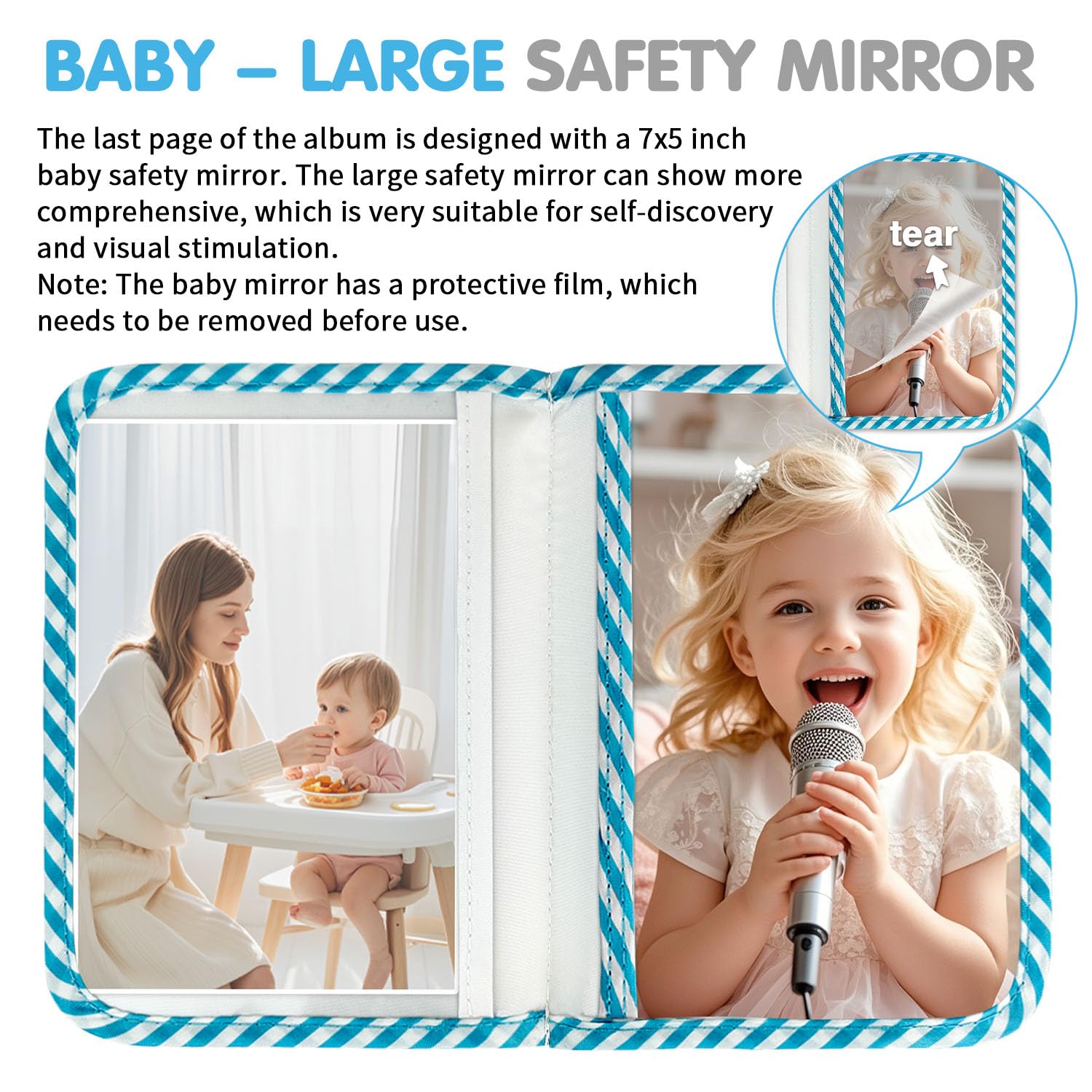 Child Safe Design - This soft baby photo book is made of child-safe and environmentally friendly fabric, the cute cover pattern will not fade. The border of the photo page is sewn with textile fabric, which can easily prevent the baby from cutting his hands when inserting or removing photos, providing maximum protection for the baby! The safety mirror embedded in the fabric is also very safe (please note: the protective film needs to be removed before use)