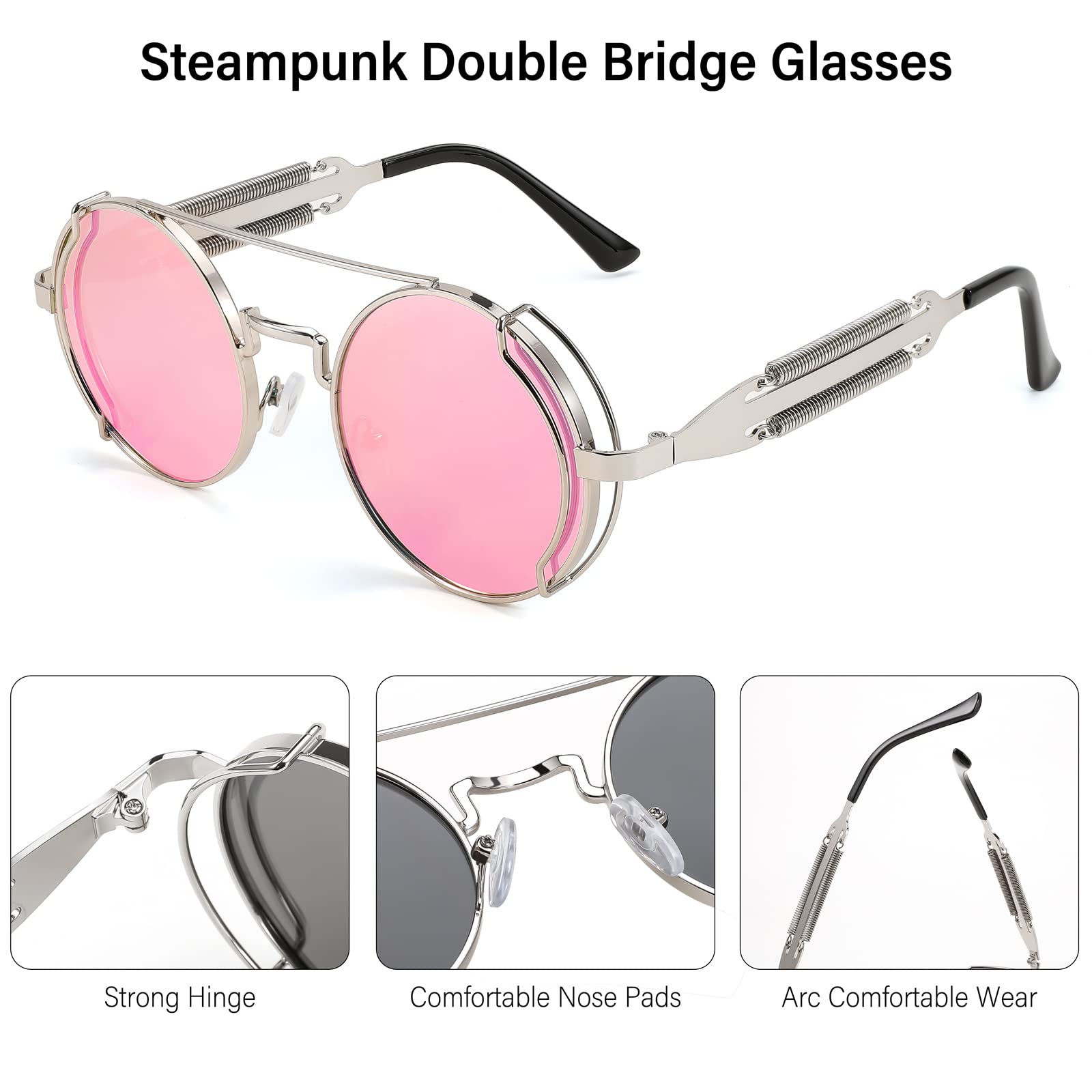 FEISEDY Round Aviator Steampunk Sunglasses Design: The retro steampunk sunglasses are designed with a round metal frame, classic and elegant. With double bridge design, enhances the luxurious and textured feeling of the glasses. With a creative metal frame, retro, and rock.