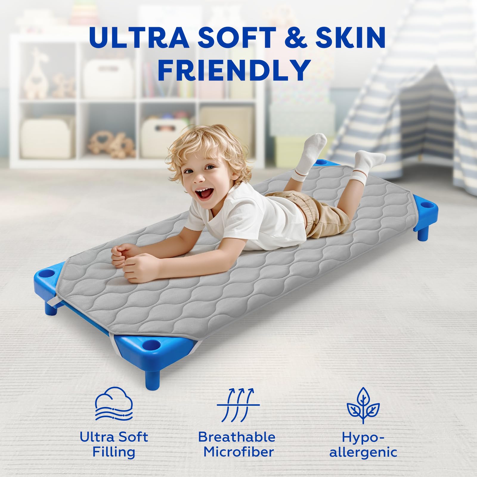 Soft & Breathable: Our cot mat made of brushed microfiber fabric, soft, breathable & hypoallergenic surface gentle on kids sensitive skin, prevents sleep marks on face or arms during nap, provides a comfortable napping experience