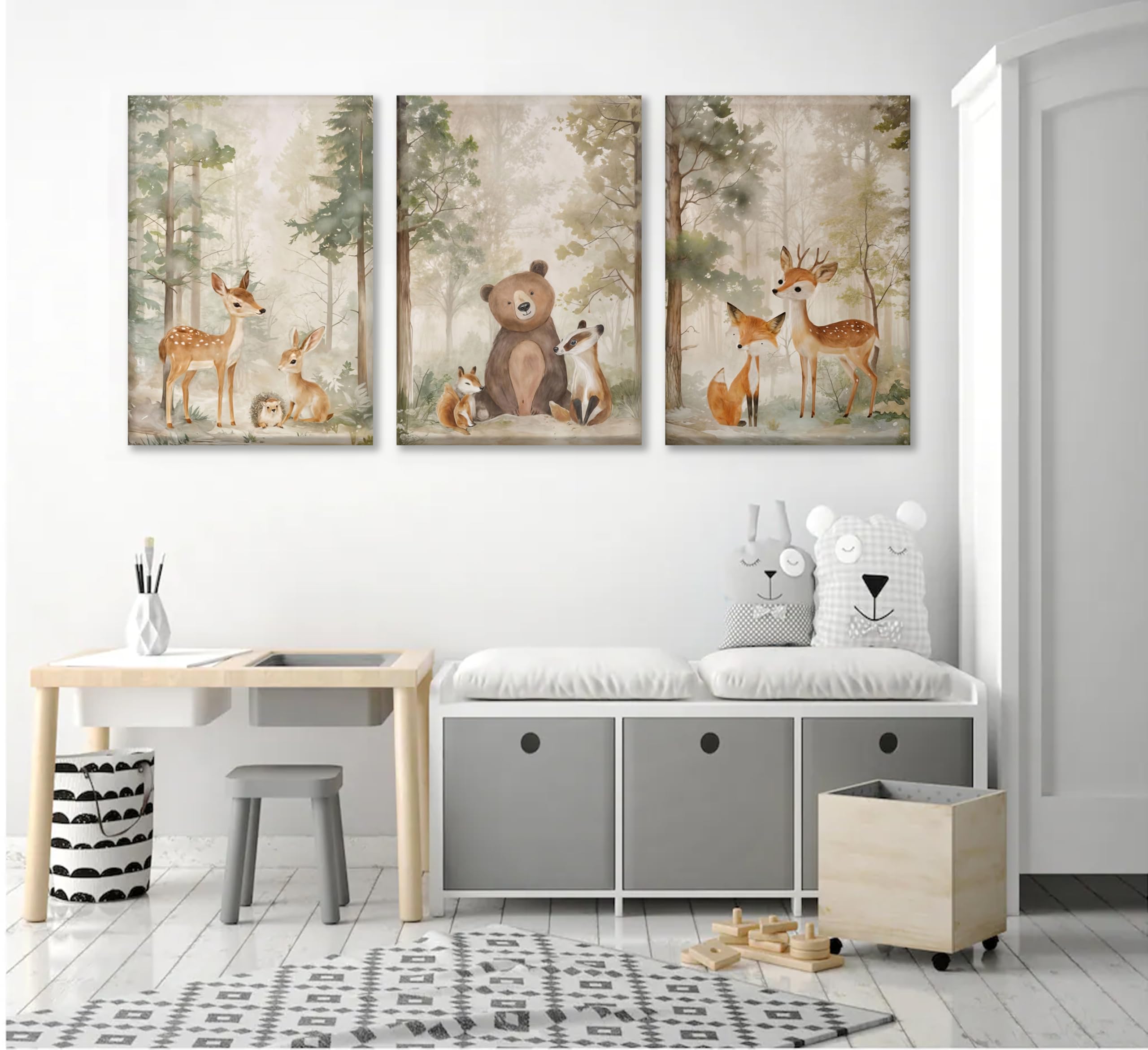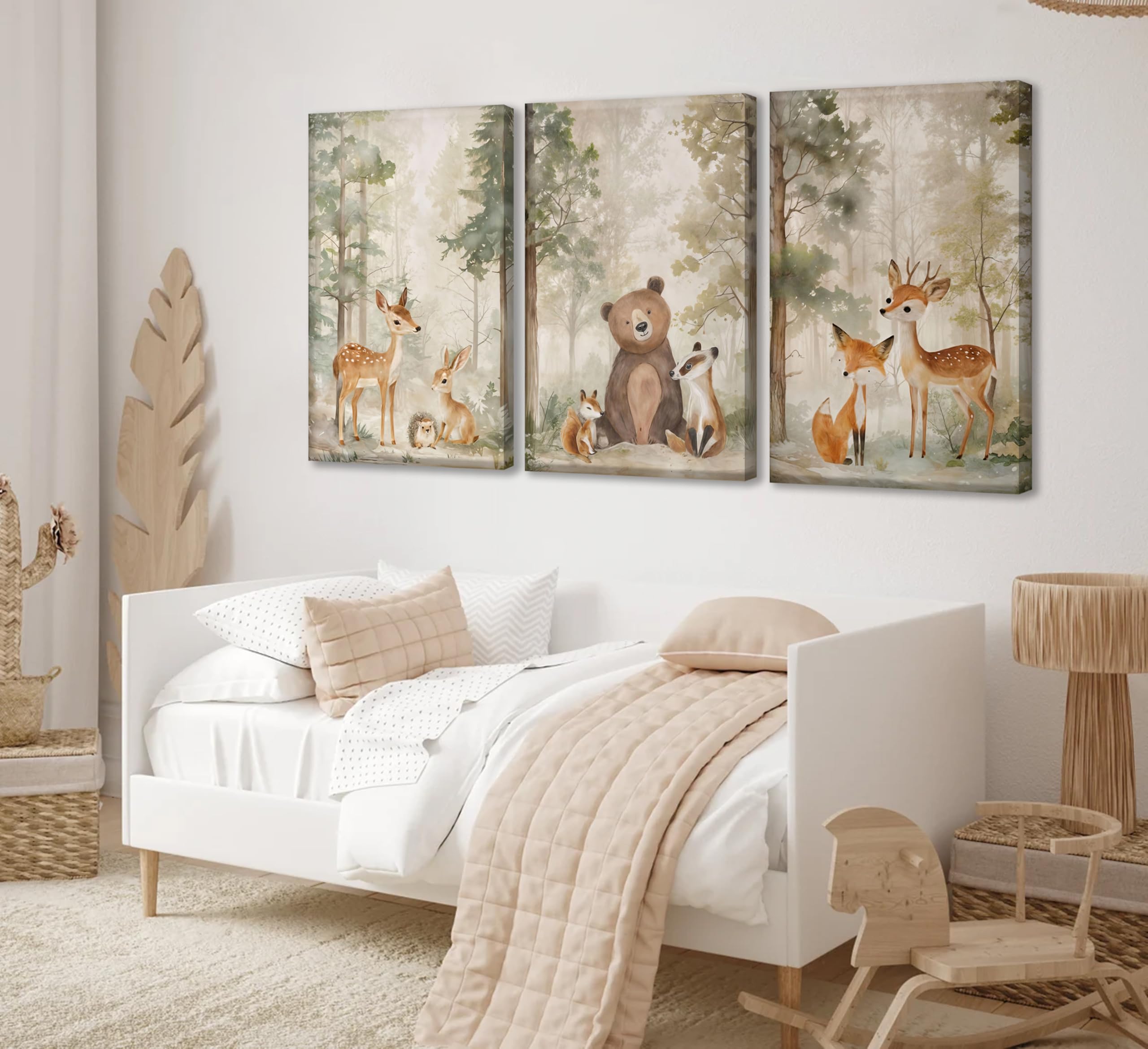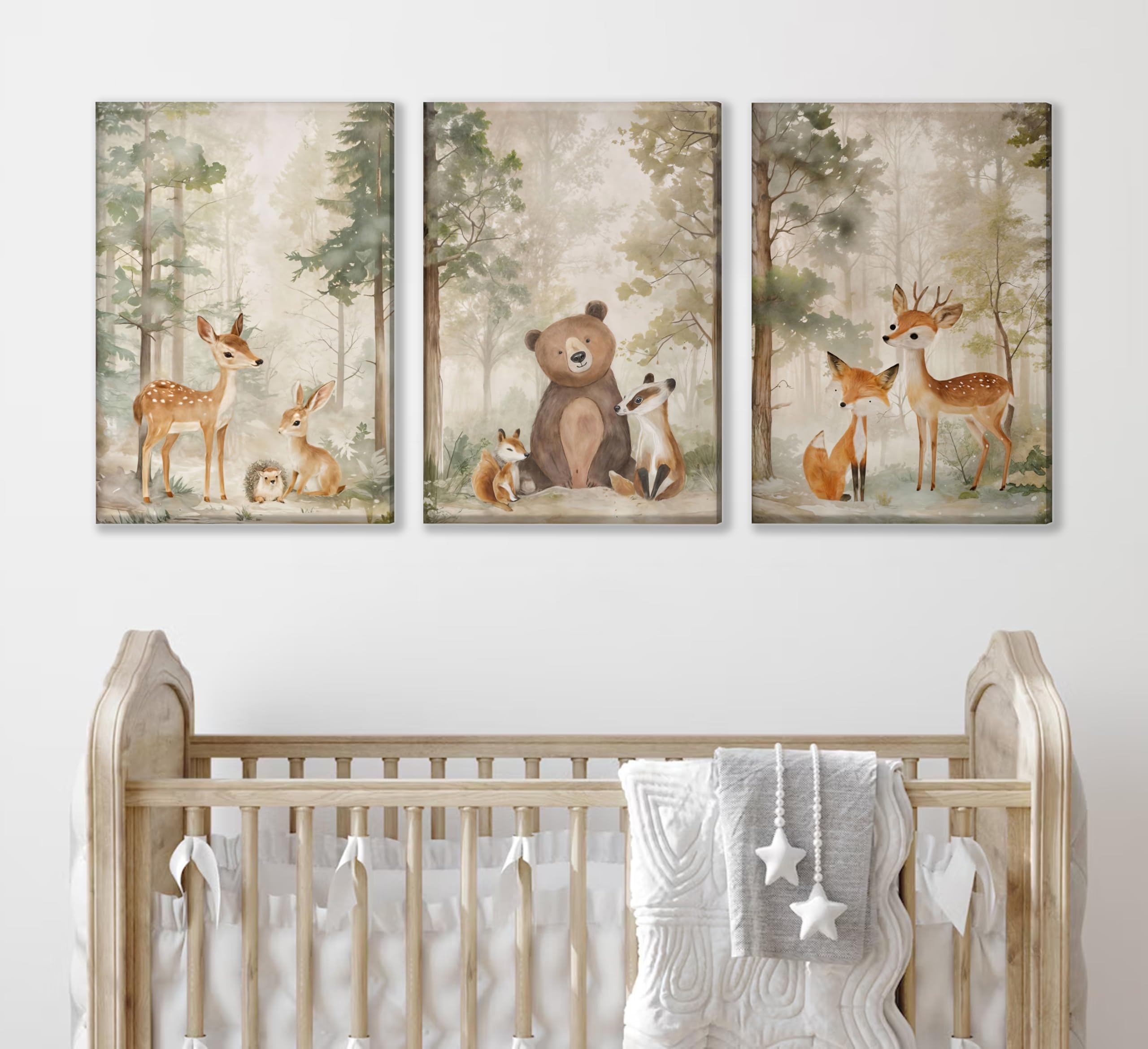 Woodland Animal Nursery wall art: This Woodland Animal nursery wall decor for boys girls, beige and green bedroom wall art nursery decor is perfect for babyboy/babygirl. The nursery animal wall art includes Deer, fox and bear, a completely wild woodland theme nursery decor