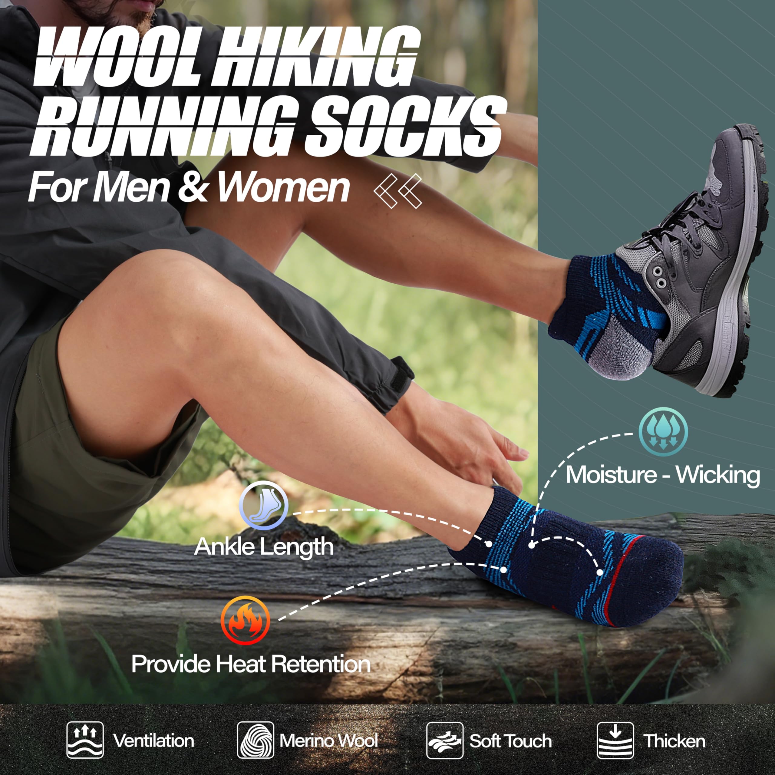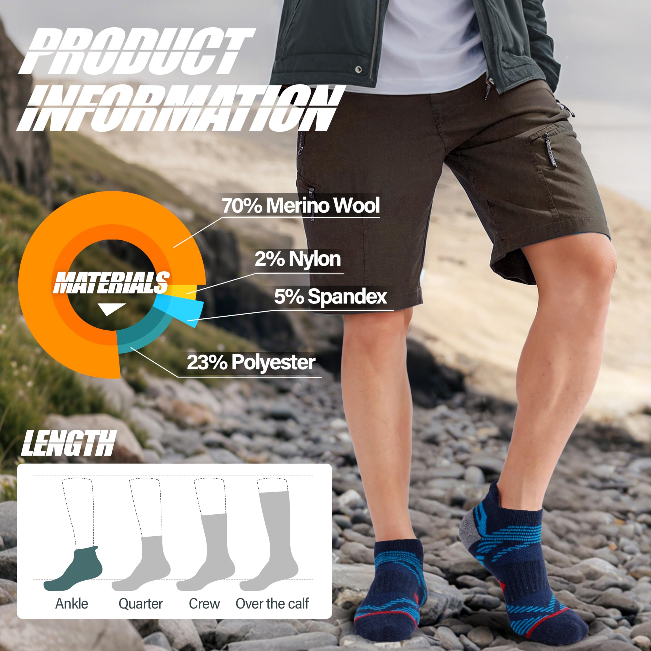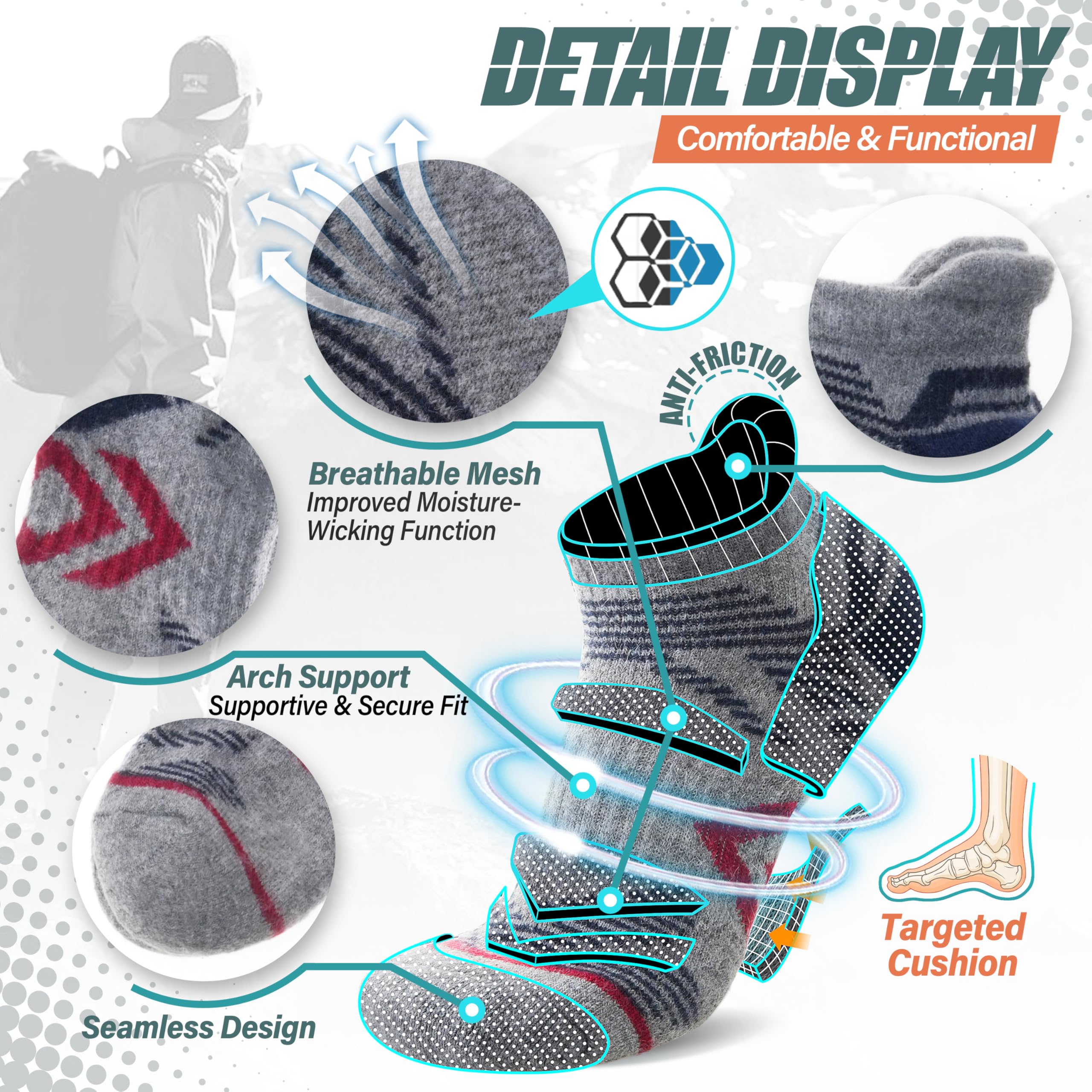 š GENTLE COMPRESSION SUPPORT ļ¼The hiking wool socks incorporates a gentle compression support technology (8-10mmHg), and a compression stripe is designed on the calf and the arch , so that the socks can fit the feet snugly and keep the socks in place,It can also enhance blood circulation , relieve symptoms varicose , reduce fatigue and help in muscle recovery. They are perfect socks for hiking , climbing , running , walking or other outdoor activities.