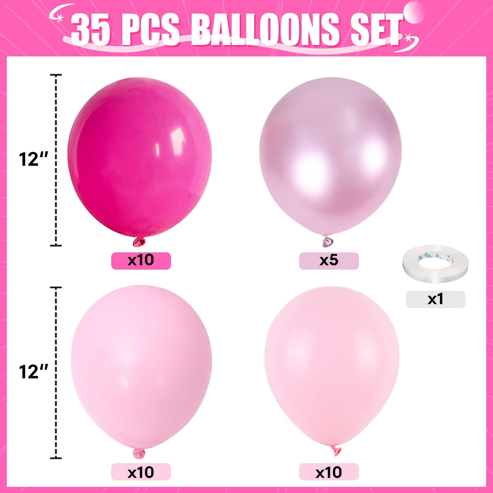 Pink Balloons Set:You will receive this 35pcs 12-inch shades of pink balloons, which includes 4 pink colors. 10pcs matte hot pink balloons, 10pcs matte pink balloons, 10pcs pastel pink balloons, 5pcs metallic pink balloons. Accompanying by a 10M ribbon. Hot pink colored decoration will embellish your theme party!