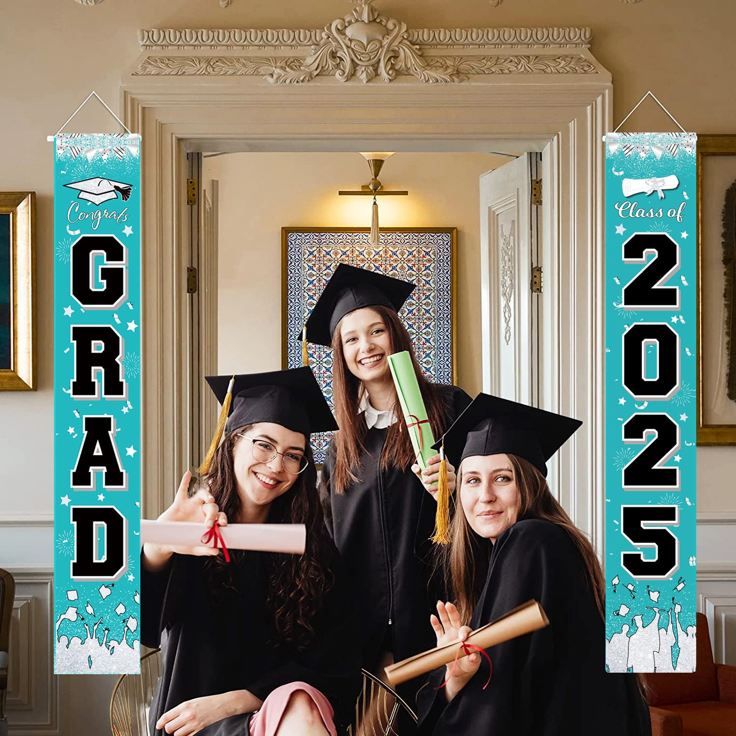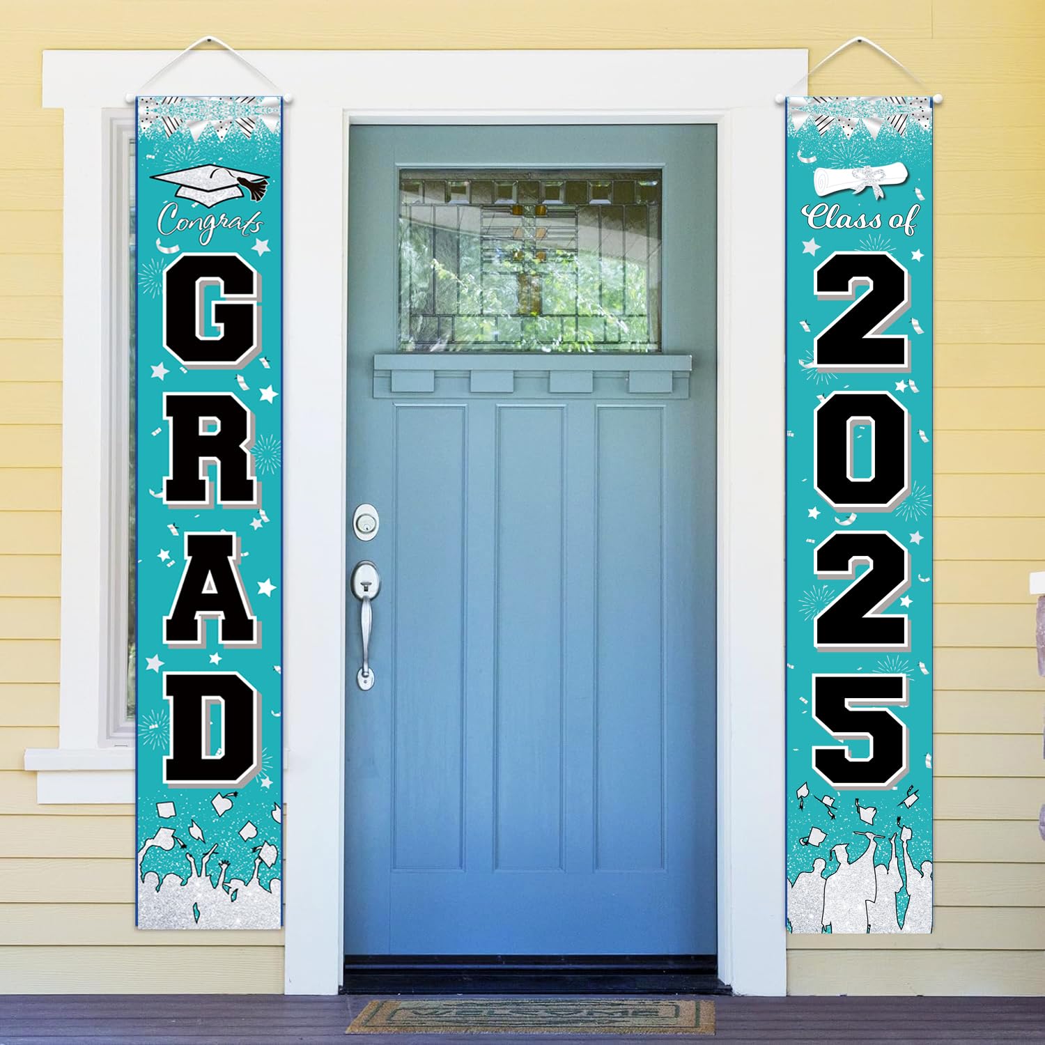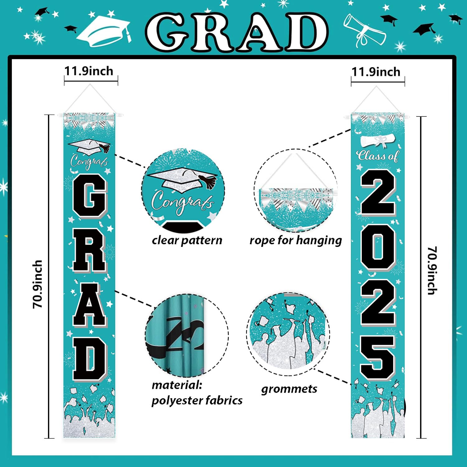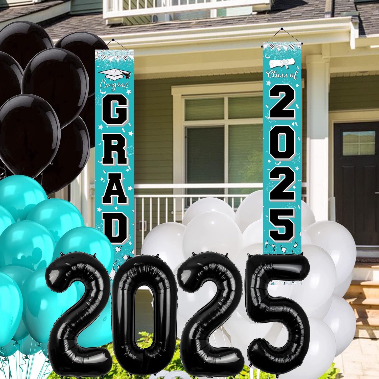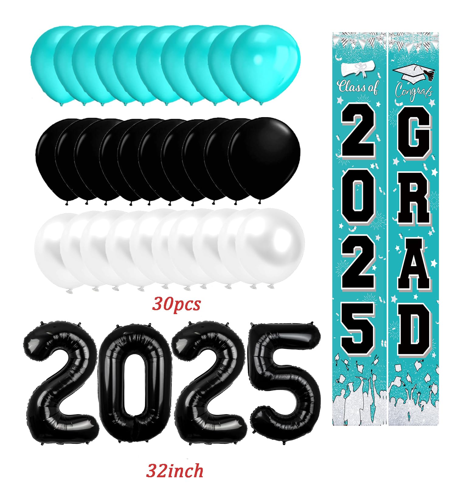 ✔️Turquoise Teal Graduation Decorations 2025 Package list:2 Pack Graduation Banners:Suitable size: both "CONGRATS Grad" and "2025" banners measure approx. 70.8 x 11.8 inches/ 180 x 30 cm;1 pcs of 32inch black 2025 balloons; 30pcs balloons of 12inch:10*turquoise+10pcs*white+10pcs *black balloons.
