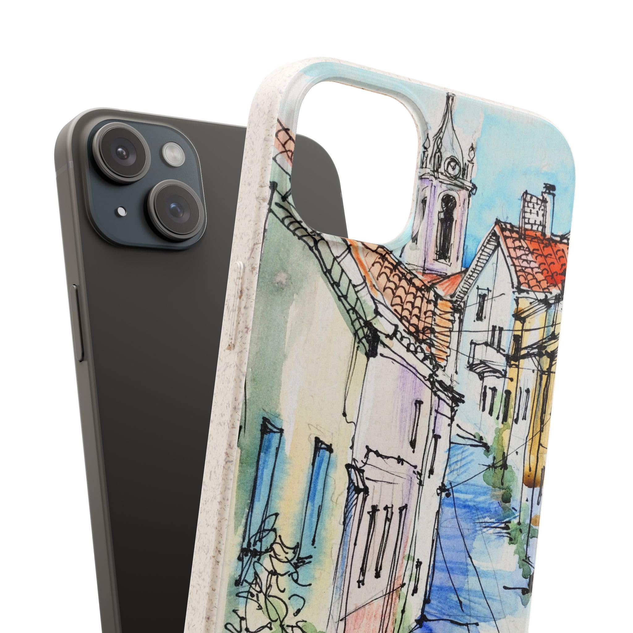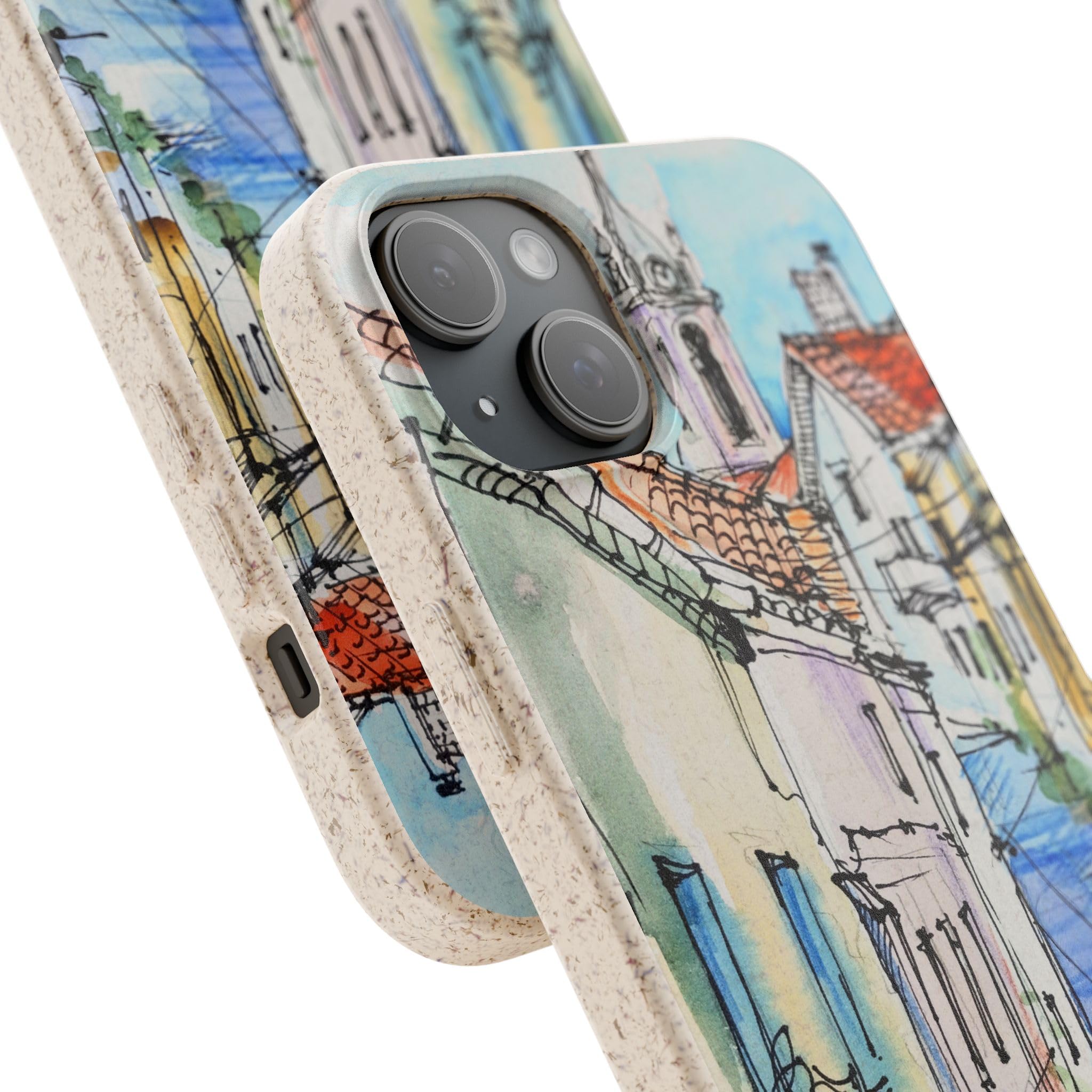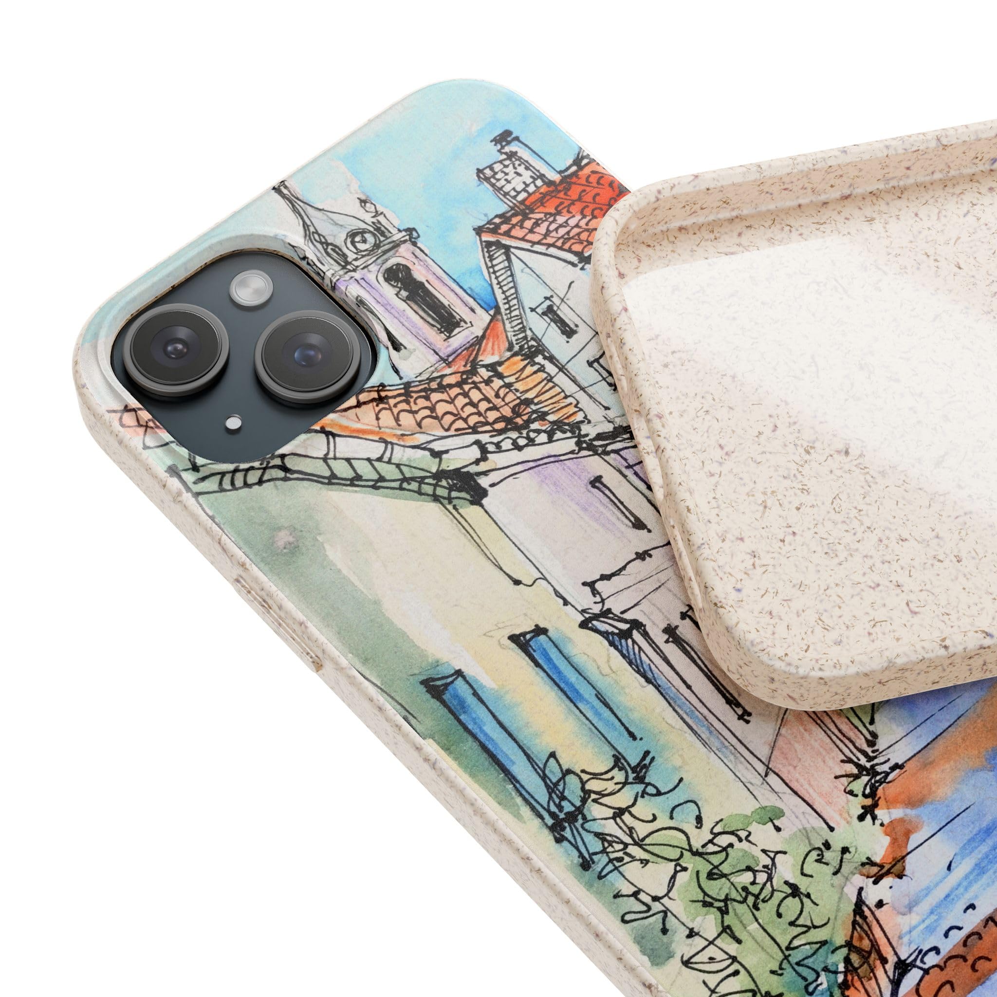 Protect your phone in style while protecting the planet! Embrace nature with our European Town Art Biodegradable Phone Case, featuring a charming illustration of a colorful European street scene. The design showcases quaint cobblestone roads, vibrant historic homes, and a picturesque chapel, all beautifully rendered in watercolor and fine pen detail. Perfect for lovers of travel-inspired art, European architecture, and the warm, nostalgic feel of hand-painted urban landscapes. Crafted from eco-friendly, compostable materials, this sustainable phone case not only protects your device but also supports a greener planet — naturally biodegrading within 160 days of disposal. It’s lightweight, durable, and fully supports wireless charging for effortless everyday use. Available for multiple phone models. Order yours today and carry the beauty of nature wherever you go! Details: .: Materials: PLA and PBAT polymers, bamboo fibre .: Matte finish .: Wireless charging compatible .: Precise cut outs for connectivity .: Might have a natural scent