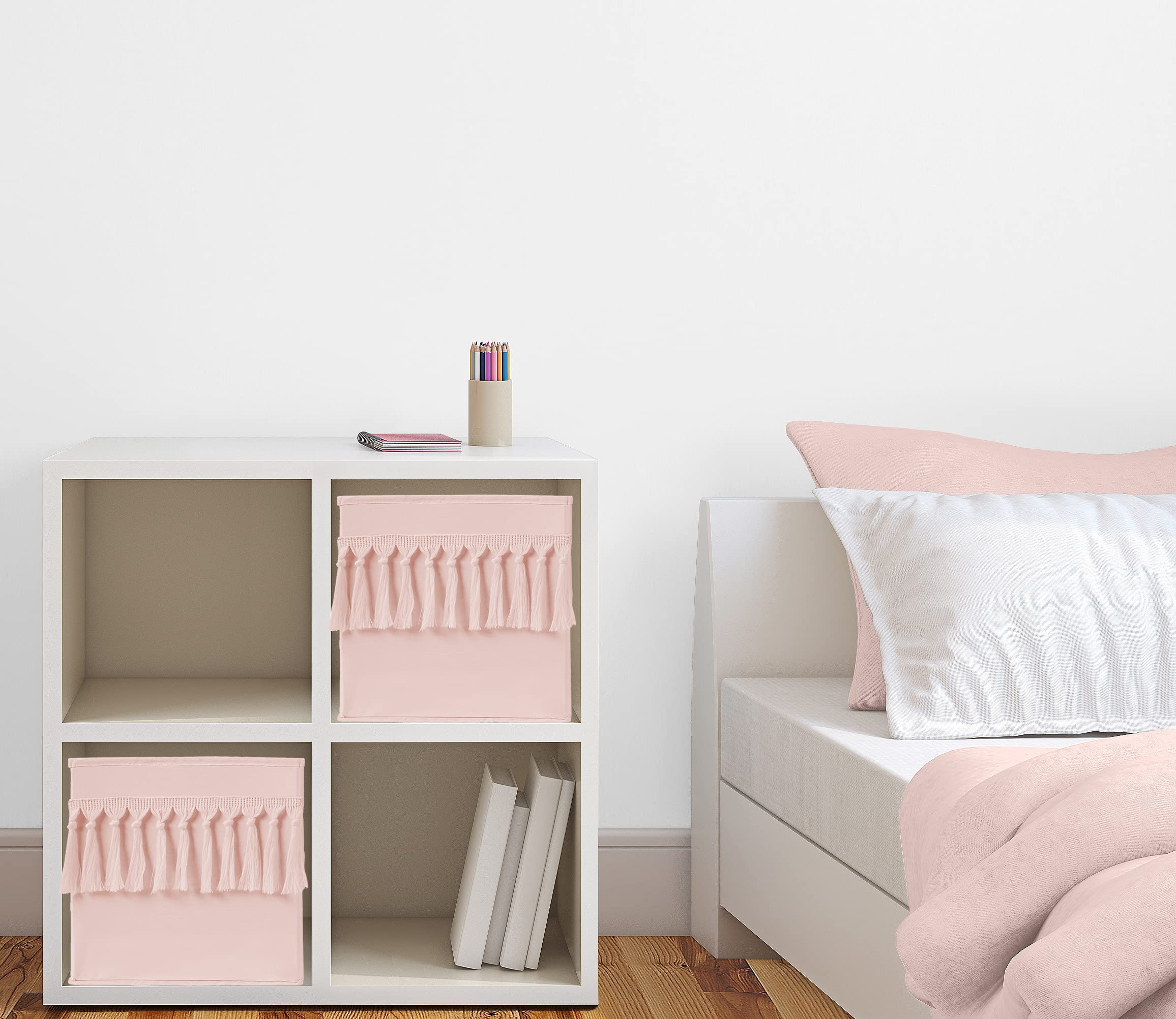 Reinforced fabric handles allow bins to easily slide in and out of most standard cube shelving