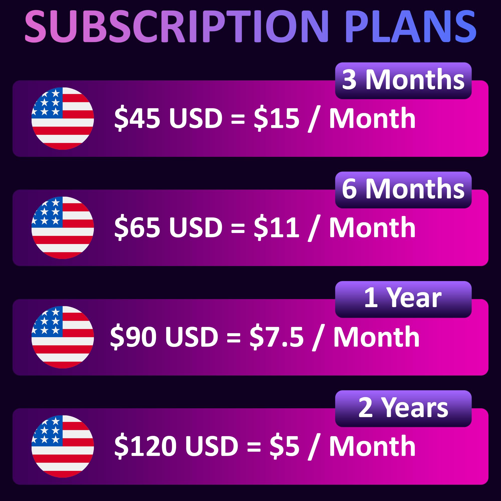 Affordable Plans & Transparent Pricing | Our subscription plans start at $5.00 USD per month. We offer 3 months ($45 USD = $15/month), 6 months ($65 USD, equals to $11/month) , 1 year ($90 USD, equals to $7.5/month) or 2 years ($120 USD, equals to $5.00/month). No long-term contracts, no activation fees and no hidden fees.