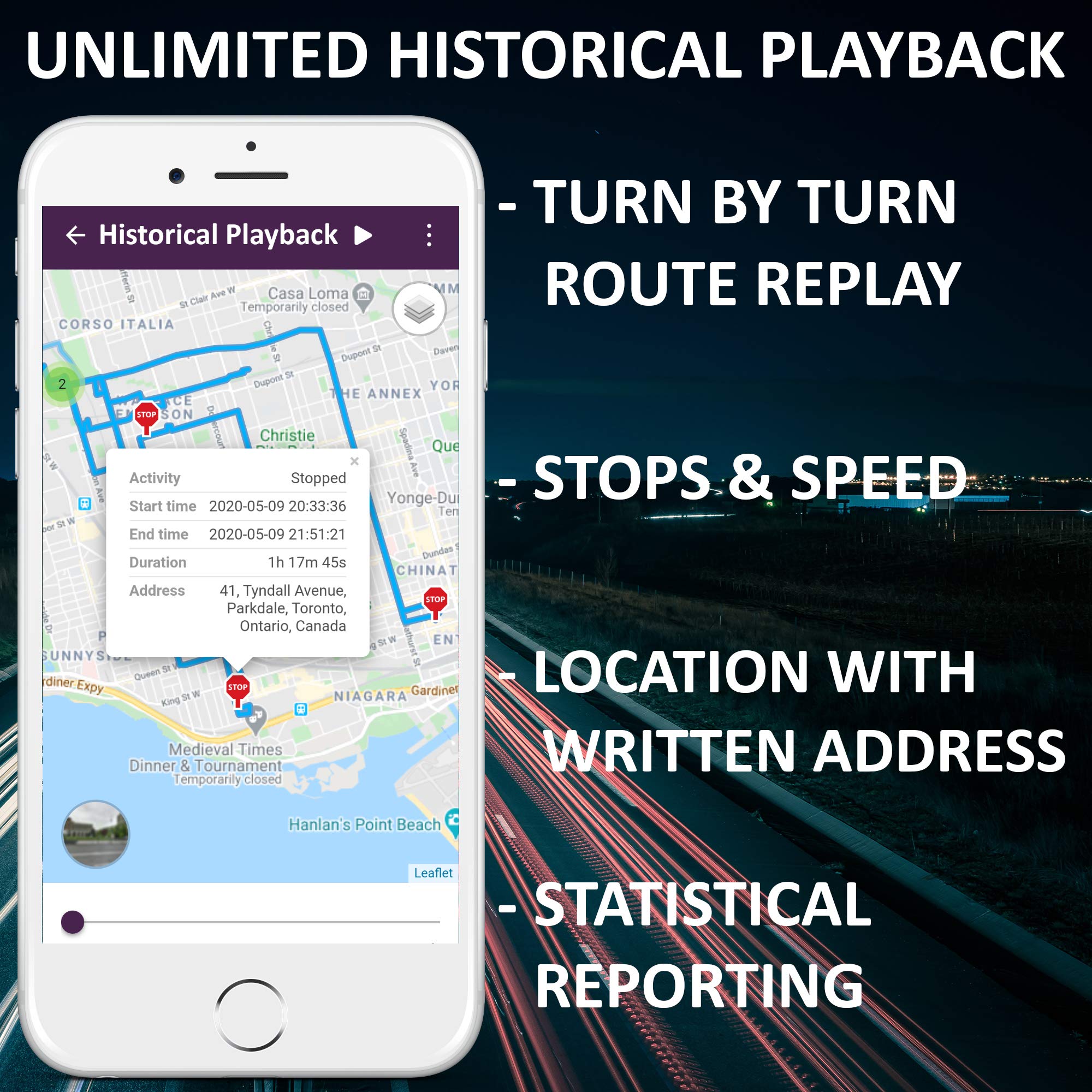 Instant Notifications | Speeding Alerts: Get notified when your GPS tracker exceeds a speed limit you set | Unlimited Geo-fencing: Set geo-fences so you get alerted when your GPS tracker enters or leaves a zone | Driving Behaviour Alerts (Rapid Acceleration, Harsh Breaking, Sharp Cornering) | Power Disconnection Warning | Movement Alerts | Ignition ON and OFF | Turn-By-Turn Historical Route Playback | Unlimited Users (Multi-User Access)