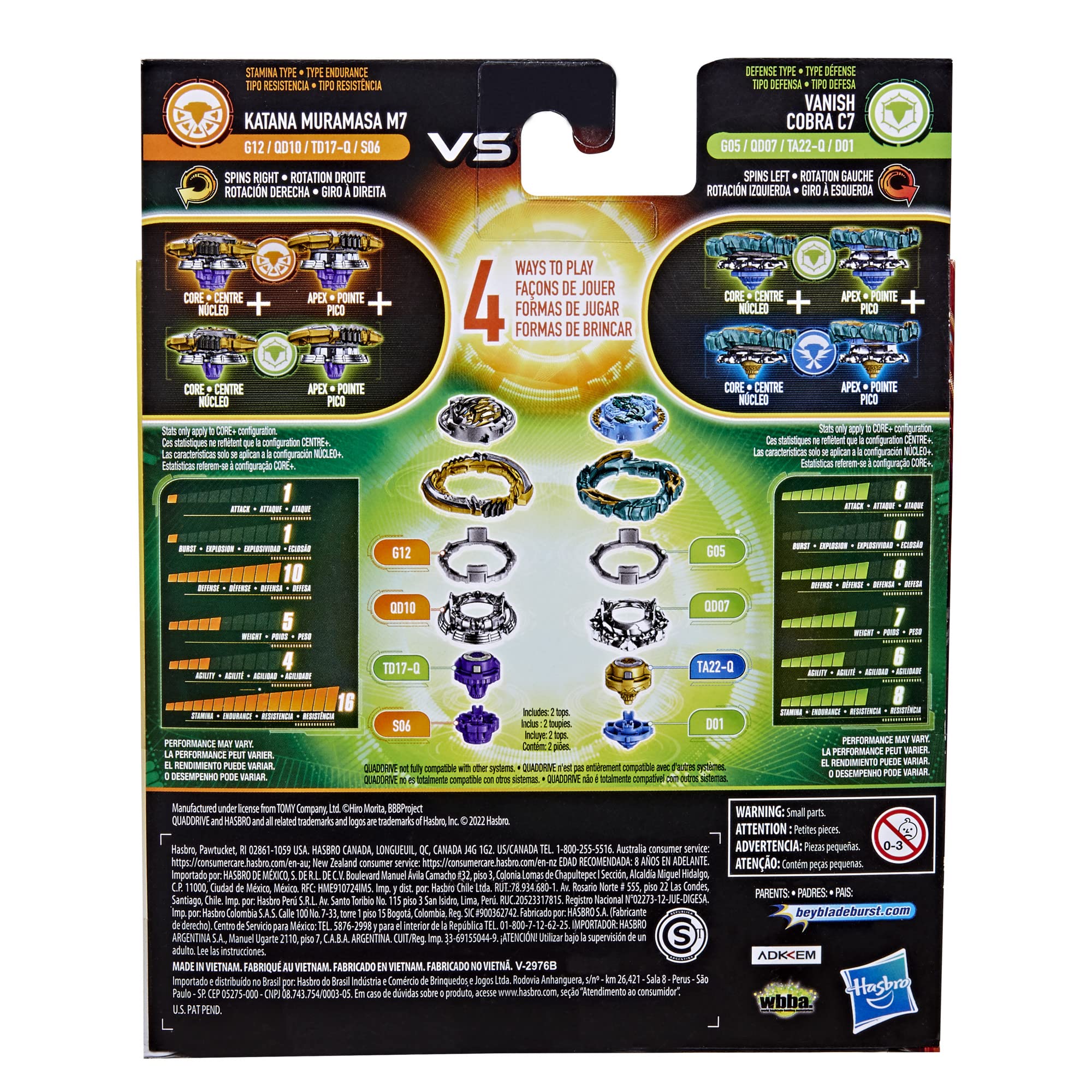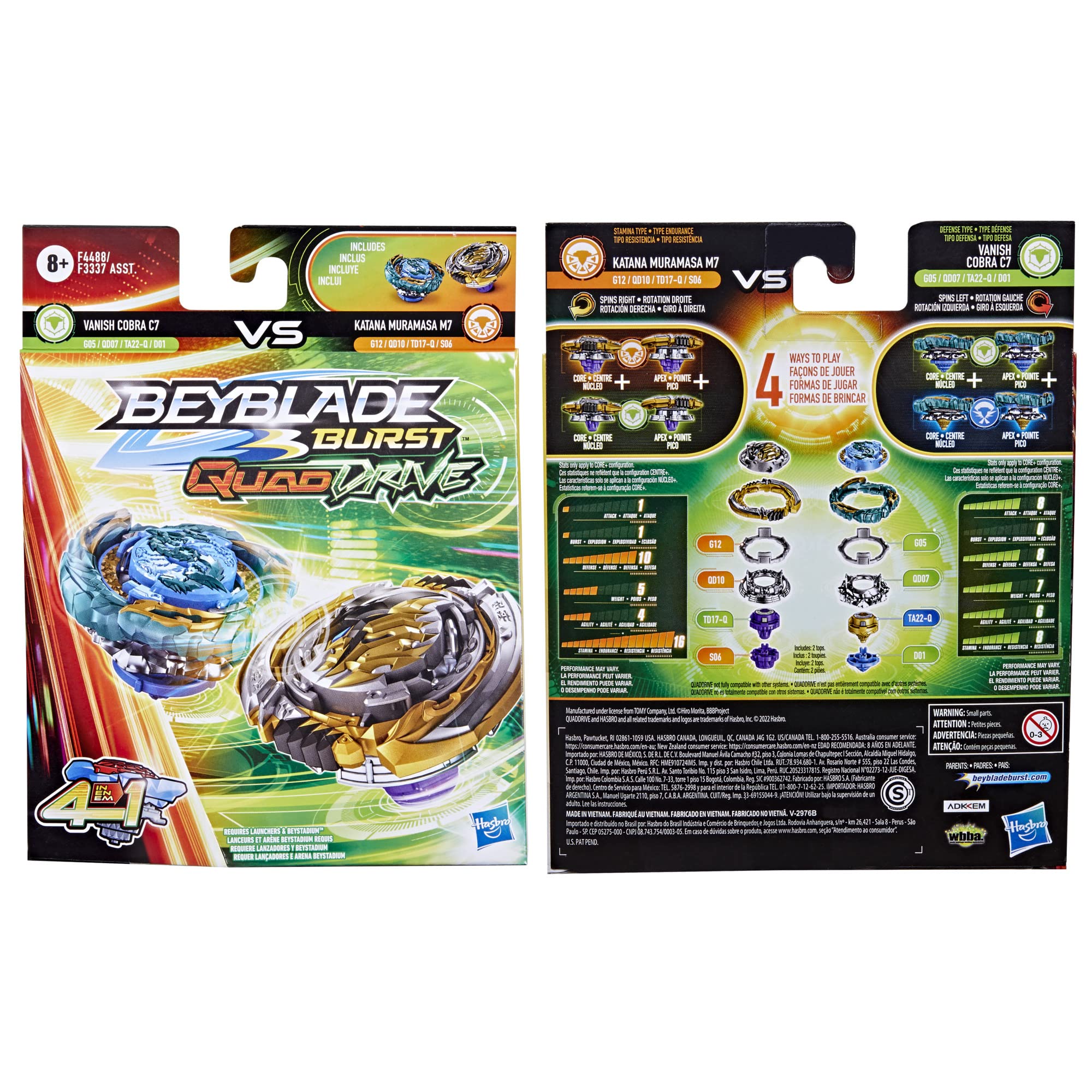 2 CUSTOMIZABLE TOPS: Includes Beyblade Burst QuadDrive right-spin Katana Muramasa M7 G12 QD10 TD17-Q S06 and left-spin Vanish Cobra C7 G05 QD07 TA22-Q D01 tops. Customize to Core and Apex mode, then Core+ and Apex+ mode to change top type