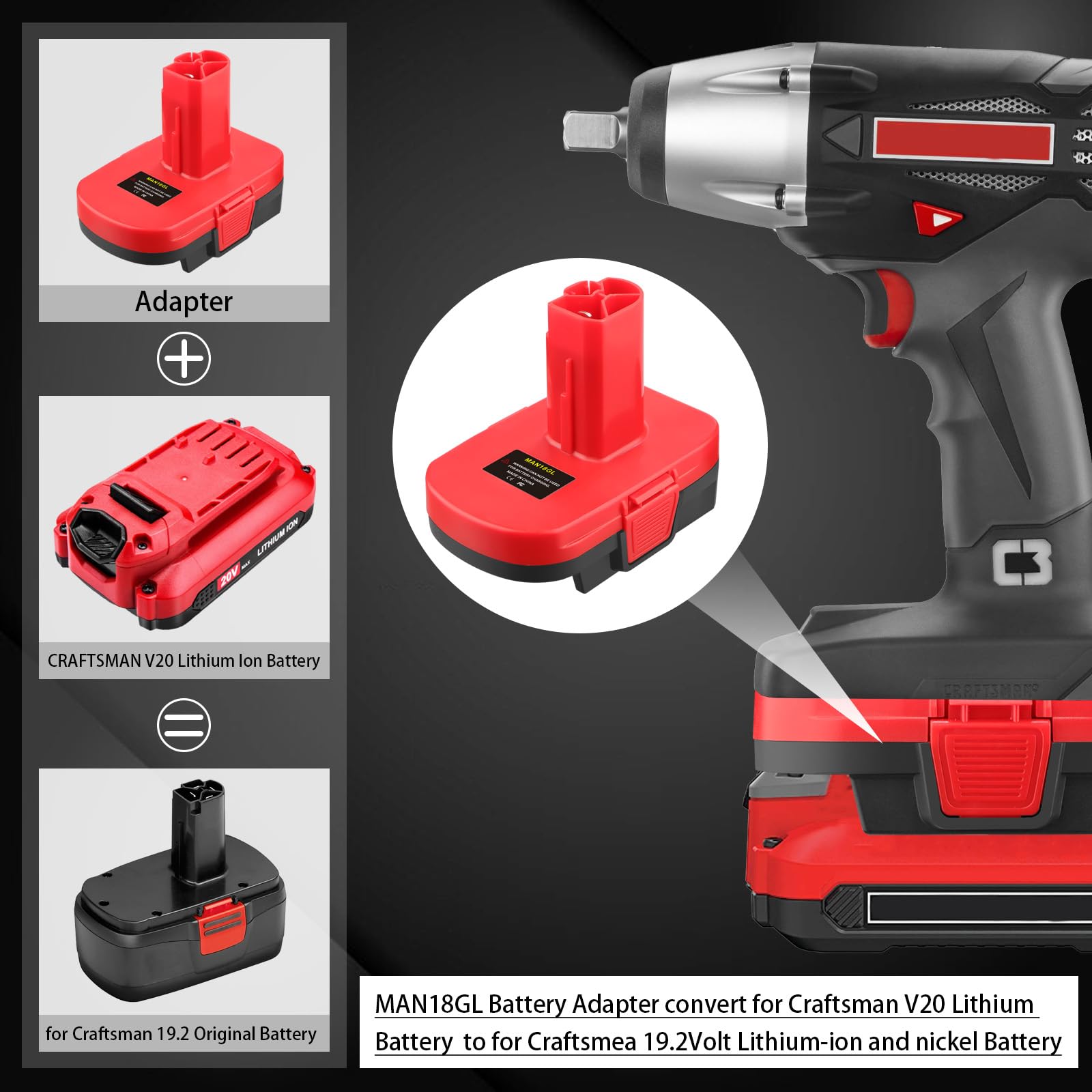 【Adapter Converter Feature】This adapter can make listed lithium batteries use on for craftsman 19.2V Cordless Tool 315.115410, 10126, 11541, 11543, 11570, 11576, 11578, 11580, 11586, 17338, 17339, CRS1000. and let you Enjoy the benefits of extended run-time of Li-Ion Batteries on your existing 19.2V power tools. (Tips: NOT 20v & V20 tools)