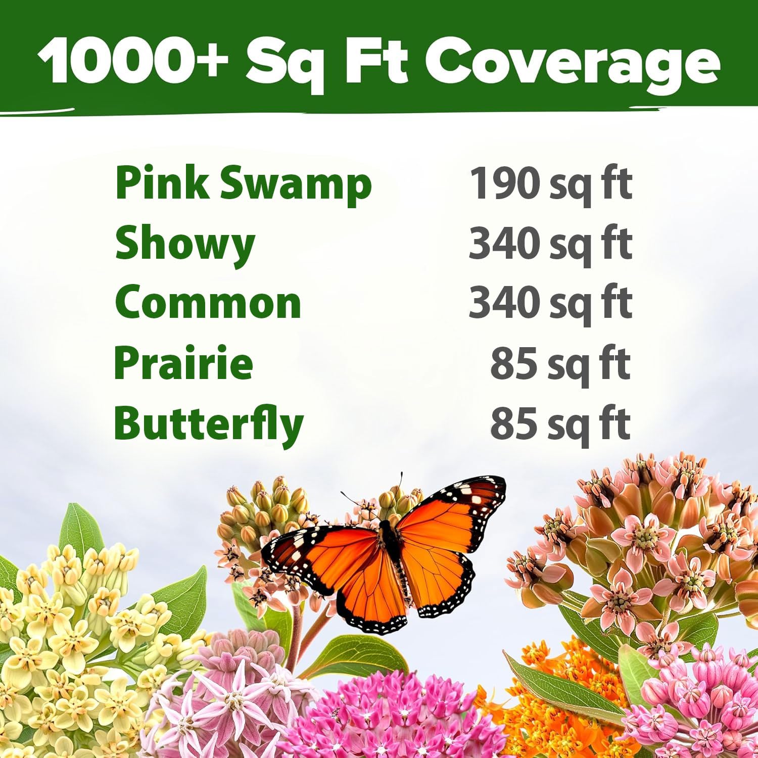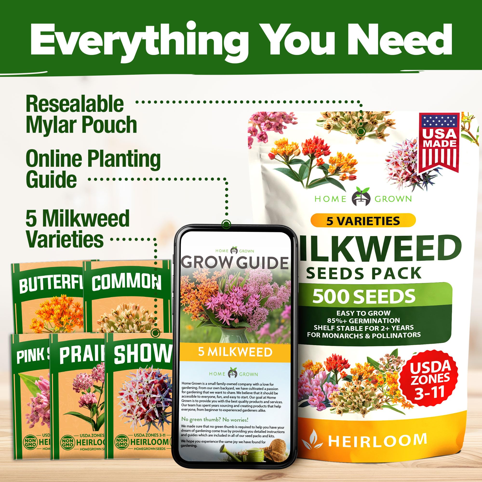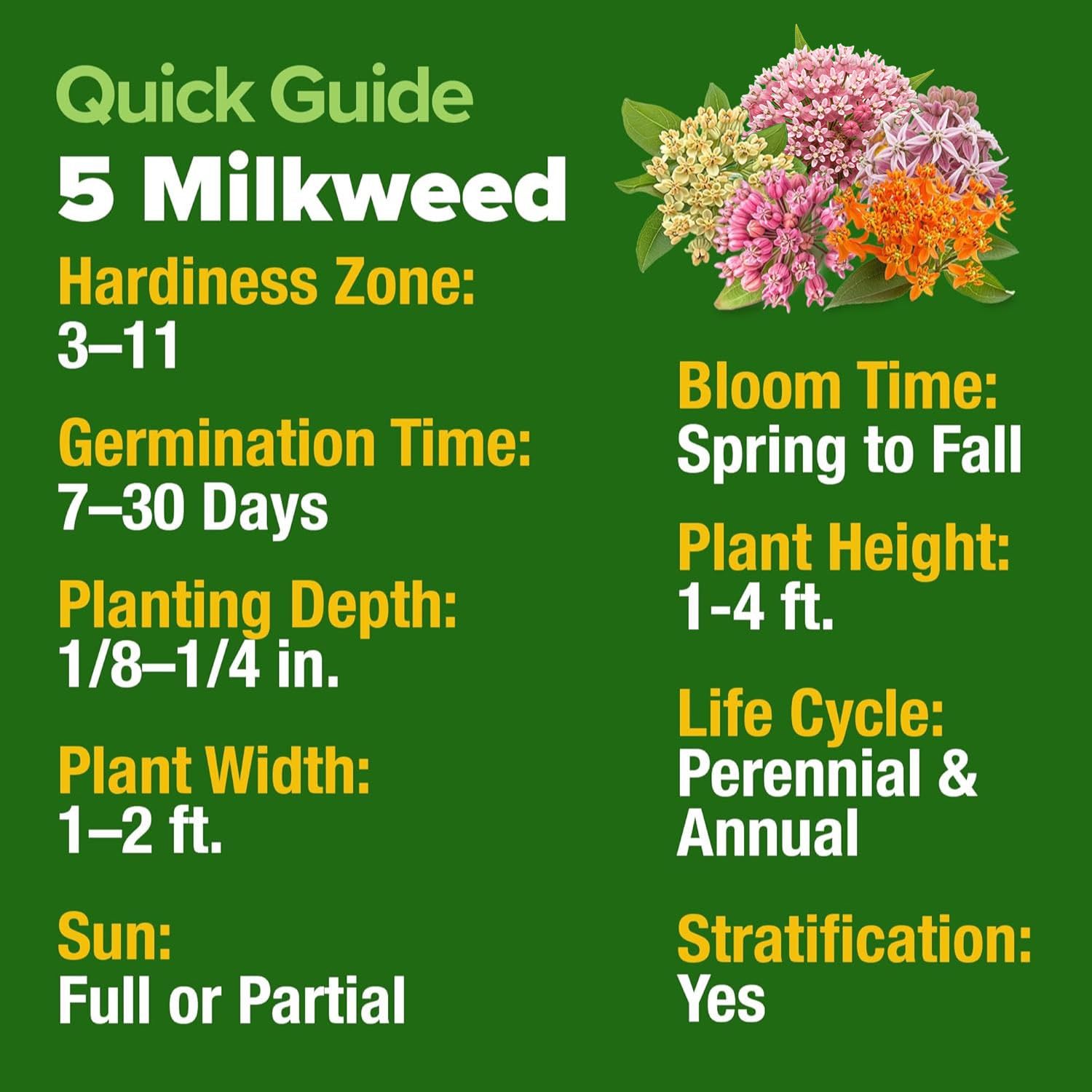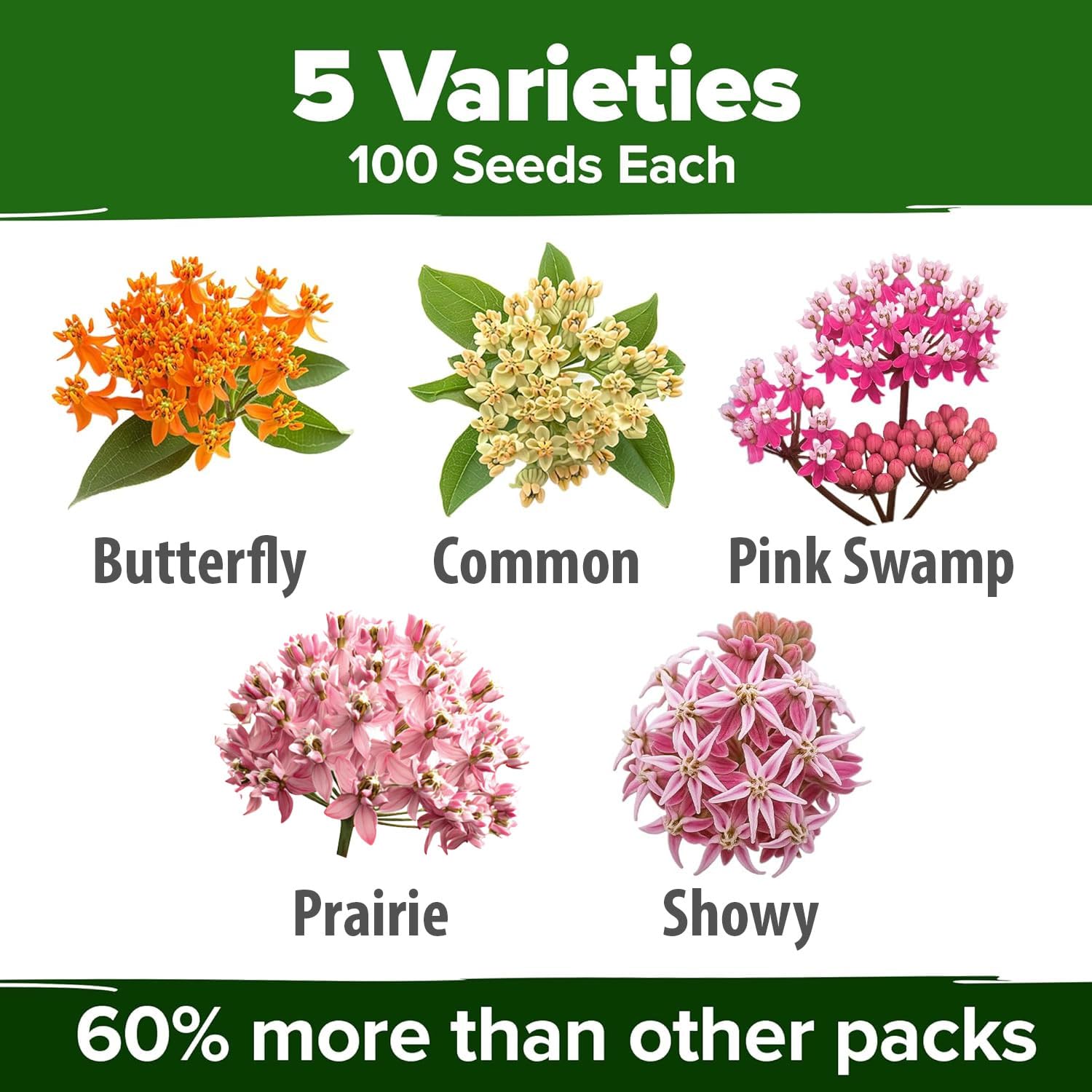 5 VARIETIES OF NATIVE MILKWEED - THE HEART OF YOUR POLLINATOR GARDEN. Supports the Monarch Life Cycle | Stunning Ornamental Contrast | Landscape Beauty. The most rewarding way to bring vibrant energy to your garden is by growing native milkweed from high-quality, fresh, Non-GMO American seeds. This curated collection includes over 500 seeds to ensure a lush, thriving habitat for seasons to come.