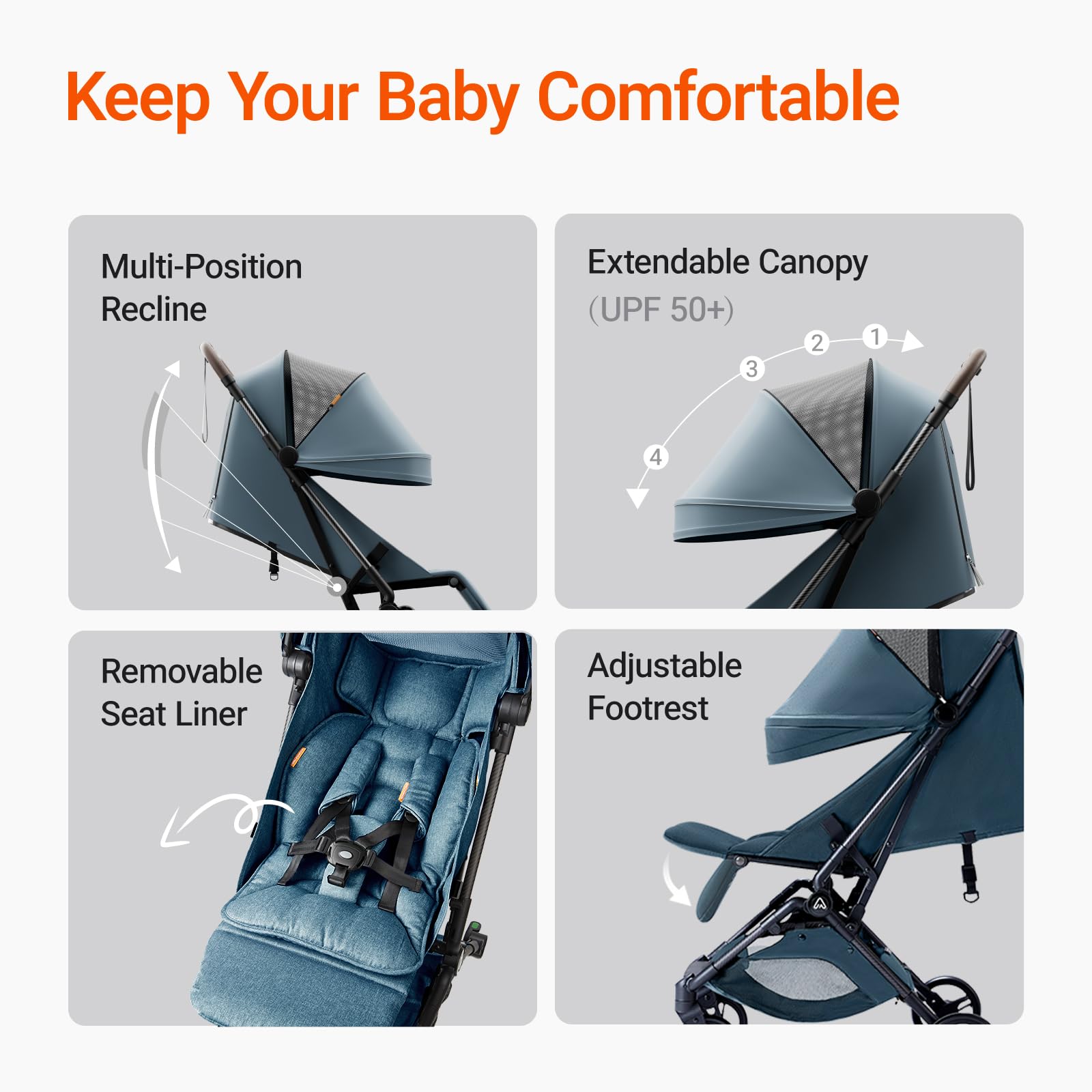 Sun Protection and Comfort: Your child's comfort and safety are our top priorities. The Ultra Air Stroller features a UV-protective canopy that shields your little one from harmful sun rays, providing a cool and shaded haven for them to relax in. The adjustable UPF 50+ canopy can be easily positioned to cater to different sun angles, allowing you to create the perfect shady spot as you explore outdoor locales.