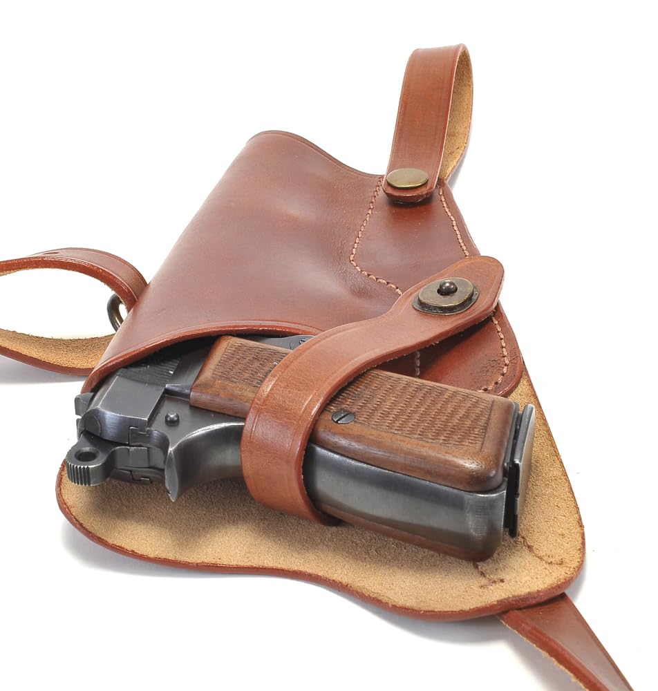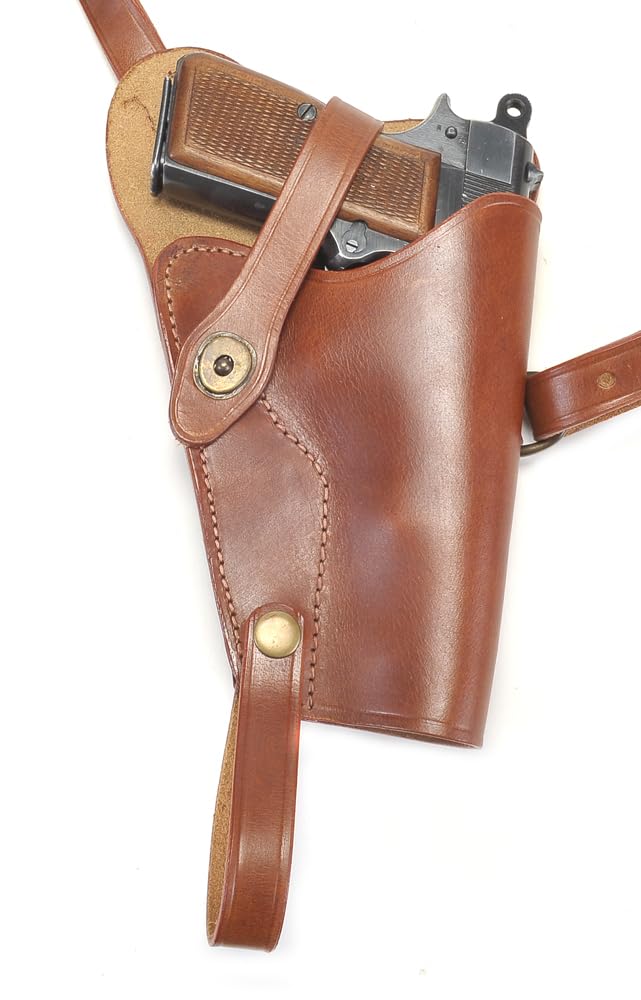 Premium Leather M3 Shoulder holster Fits Browning Hi Power Springfield Armory SA-35 EAA Girsan MC P35 This expertly handcrafted leather holster is a testament to traditional craftsmanship and attention to detail. Made from high-quality, full-grain leather, each holster is hand-cut, stitched, and formed for a secure, reliable fit. Designed to replicate the rugged functionality of wartime gear, it offers both authenticity and durability. Whether you're a reenactor, collector, or firearm enthusiast, this holster delivers classic style and dependable performance. The Hi Power is not included in the sale they are there to show the fit