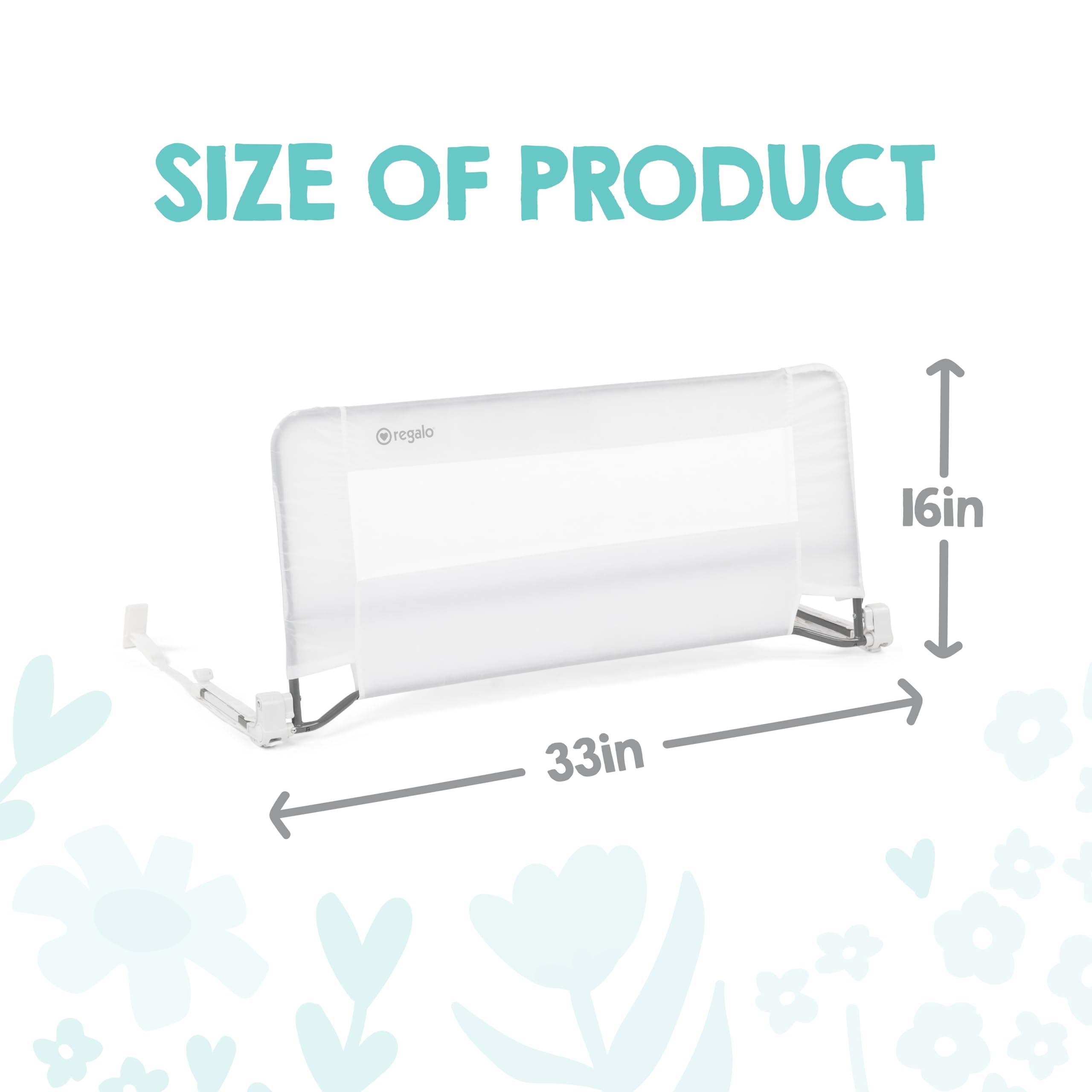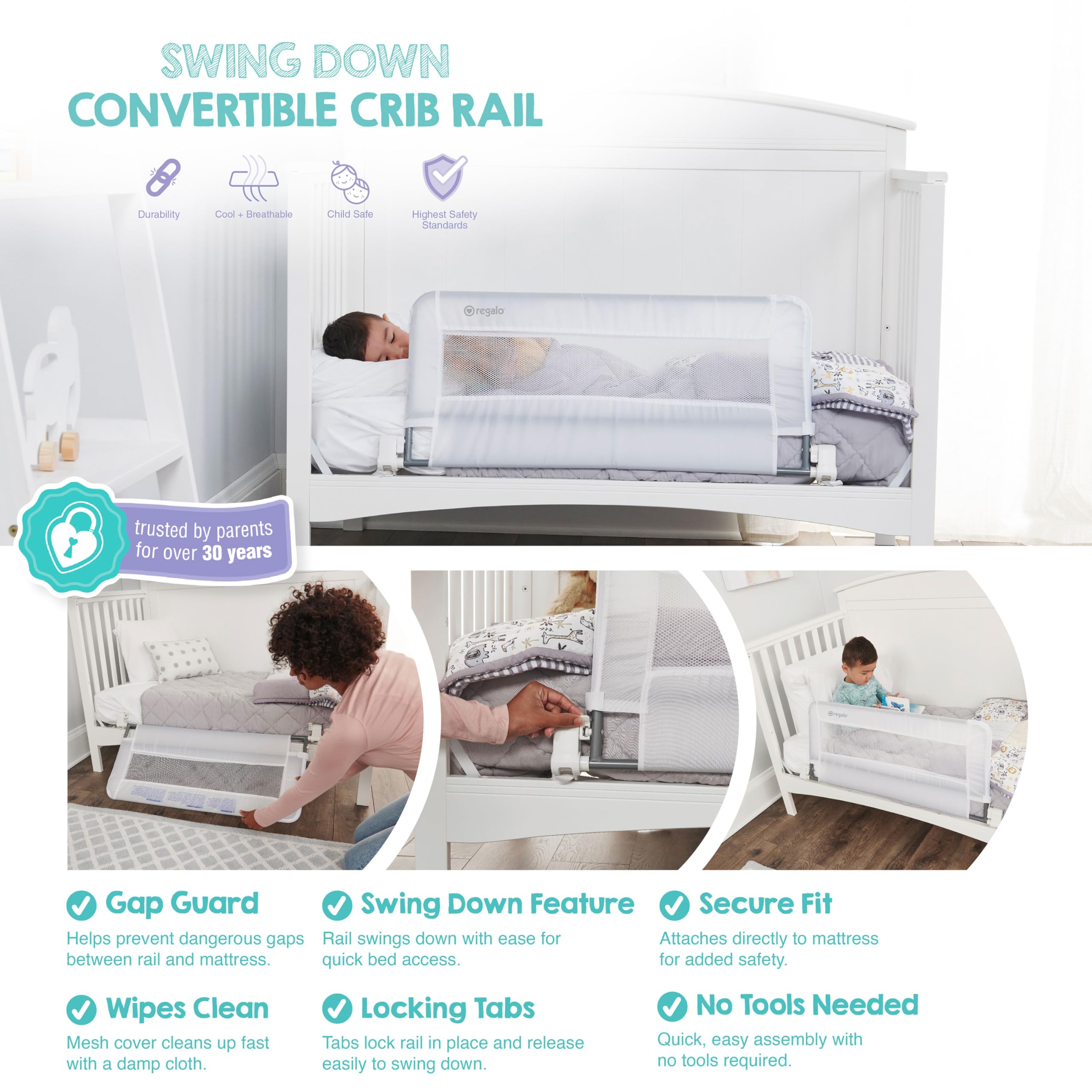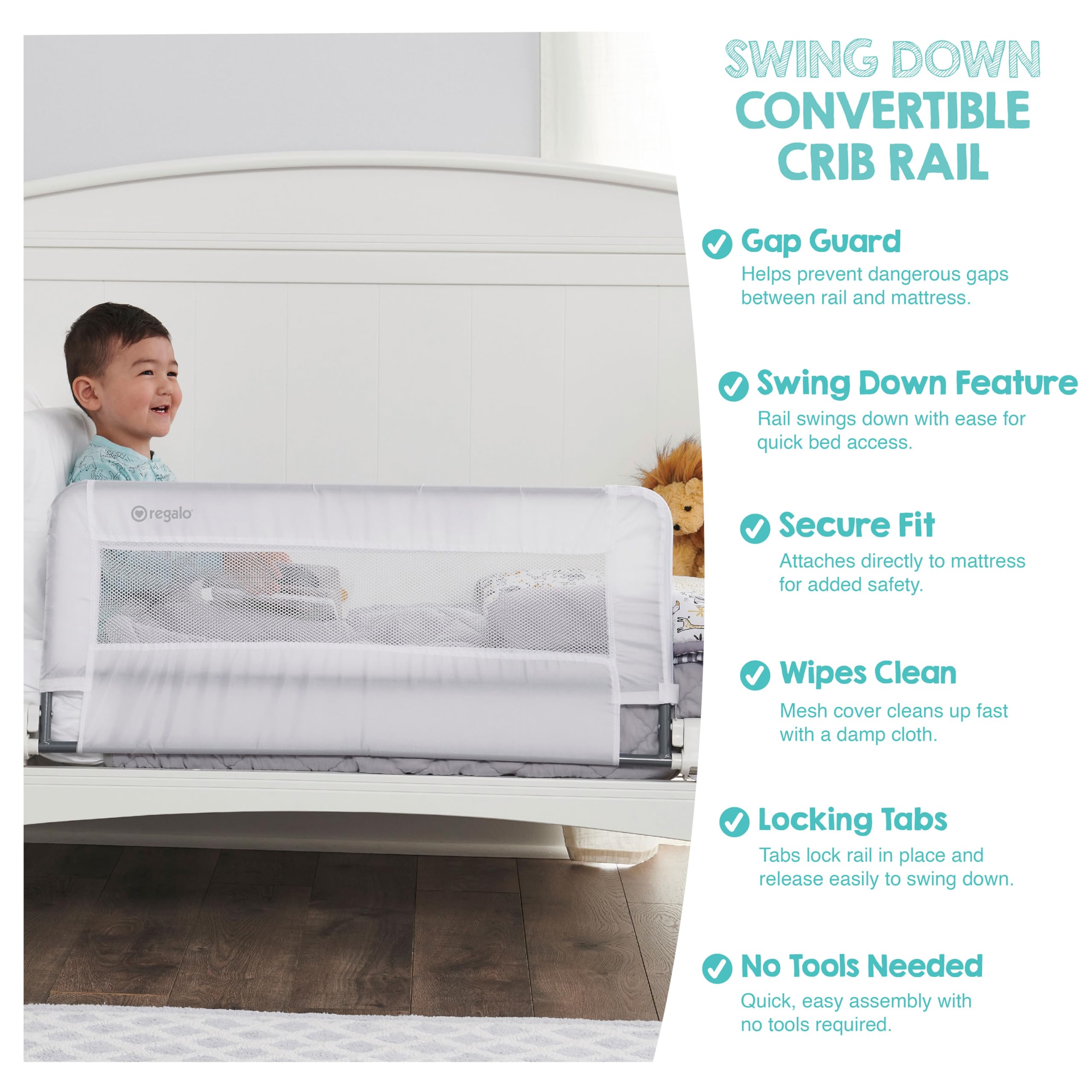 This Regalo Crib Rail is perfect for those restless little sleepers. The Regao Crib Rail has 16" tall sidewall and is 33" Long for added security. The Exclusive Gap Guard feature prevents your child from sliding between the mattress and crib rail. It's easy to set up with no-tool required. Only for use with a crib.