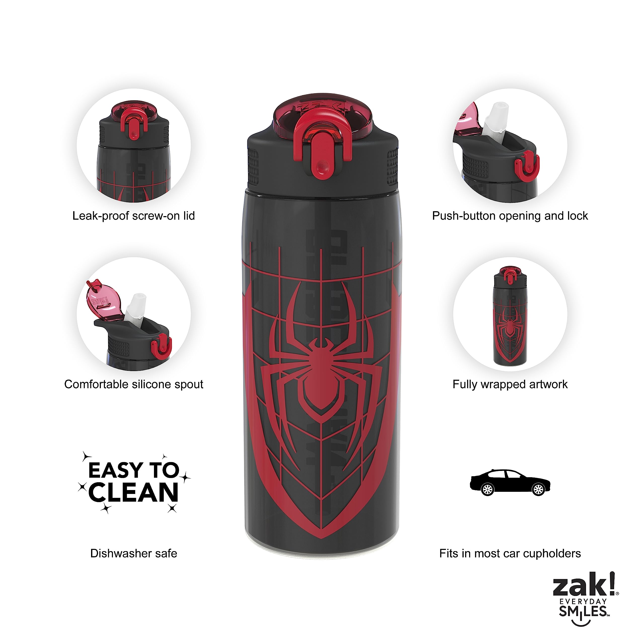 Make hydration easy and fun for Spider-Man fans with a reusable water bottle by Zak Designs! Reusable and Durable Material: Reusable water bottles will last wash after wash—good news for you and the environment! The 25 oz water bottle is made of PP plastic, durable enough to use every day and bring on any adventure. Leak-Proof Lid: The lid screws on securely and won't leak when the spout is closed, though water flows for easy drinking when the spout is open. The easy-open button has a flip-up lock to keep it from activating accidentally. On the Go: The water bottle has a built-in carrying loop on the lid for easy transportation, and with the spout cover to keep the spout clean and closed, it can be tossed into a bag for worry-free travel. Specifications: 25 oz capacity. Made of durable plastic. BPA-Free - Zak is committed to safety. Top Rack Dishwasher safe, do not microwave. Length: 4.23-inch, Width: 3.05-inch, Height: 8.54-inch. Character: Marvel Spider-Man.