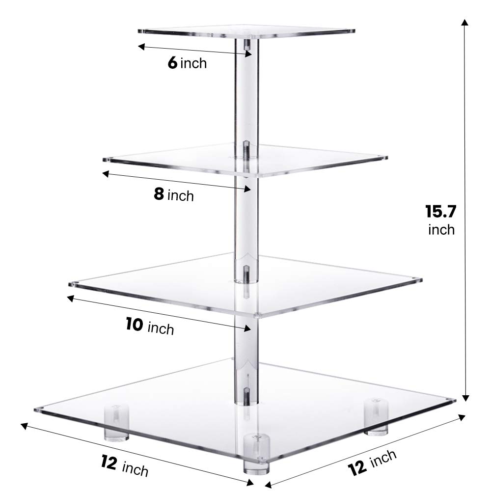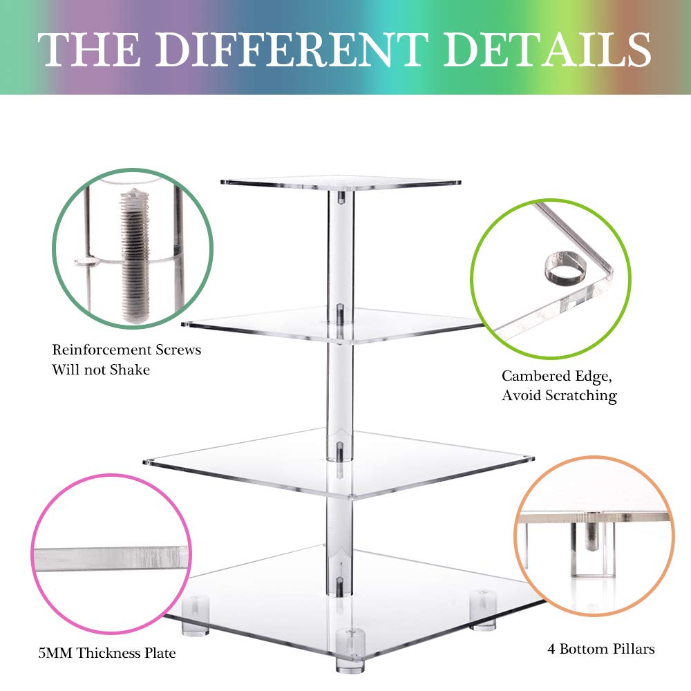 PREMIUM DESIGN: Our cupcake stand has four acrylic plates with 4” distance between them. You can remove any of the superior plates and reassemble them freely. Each pastry rack is made with premium 4 mm thick acrylic, being very durable and resistant