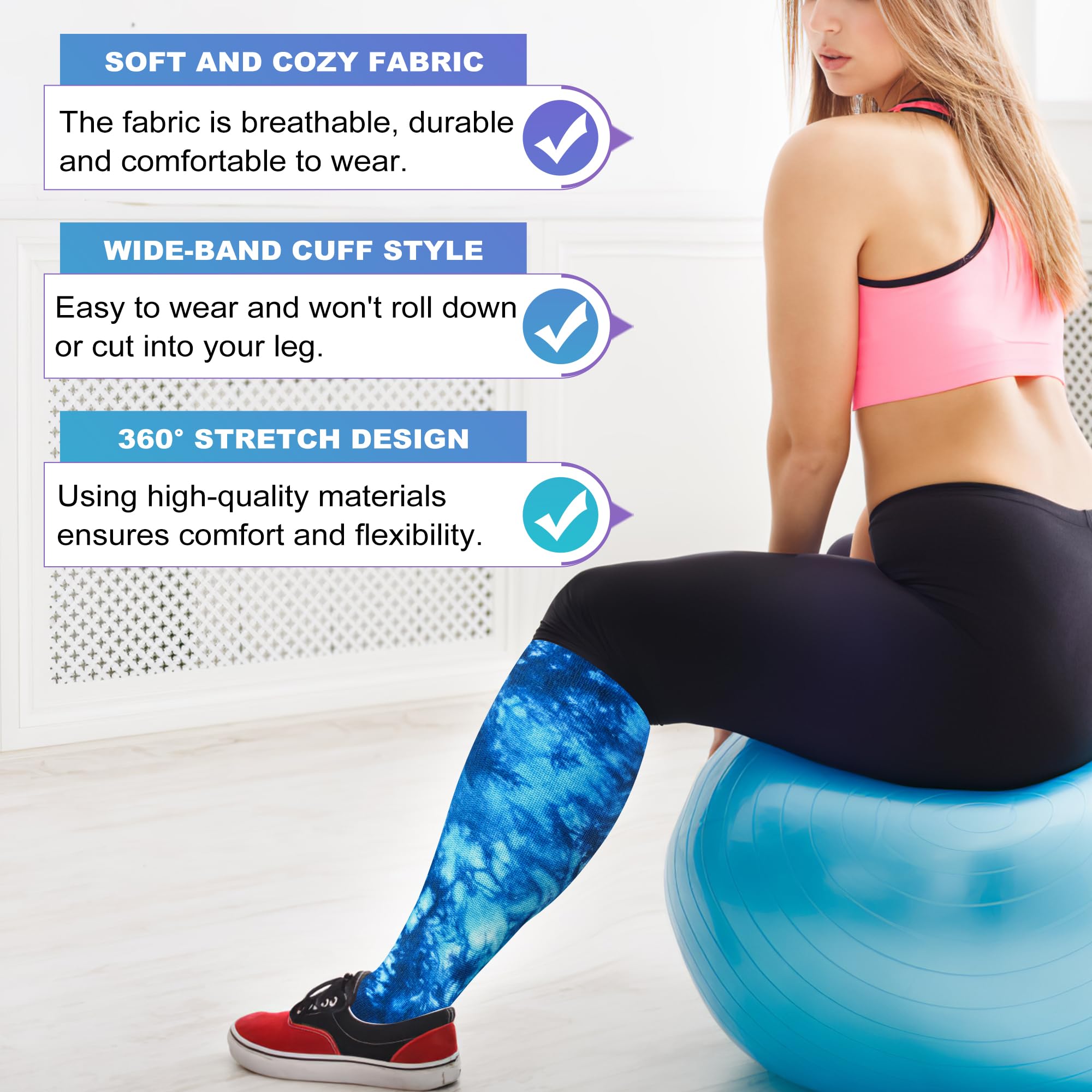 Plus Size Compression Socks Wide Calf: These wide calf compression socks are designed for people with wider calves, providing excellent leg support and long-lasting graduated compression. They are easy to put on and take off and won't roll down or cut into your leg due to their 360° stretchy and wide cuff. They are also durable and comfortable to wear.