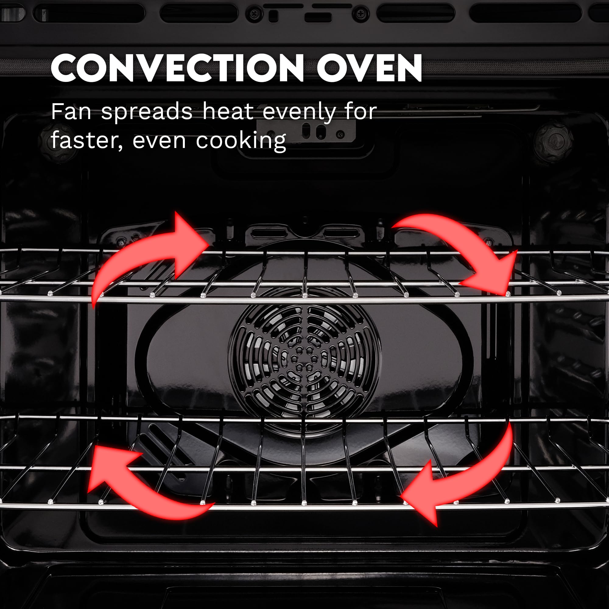CONVECTION OVEN: Spacious 5.0 cu. ft. oven features a fan to distribute heat evenly around the food and eliminate cold spots in the oven cavity, food cooks more evenly in less time and at a lower temperature than a standard oven