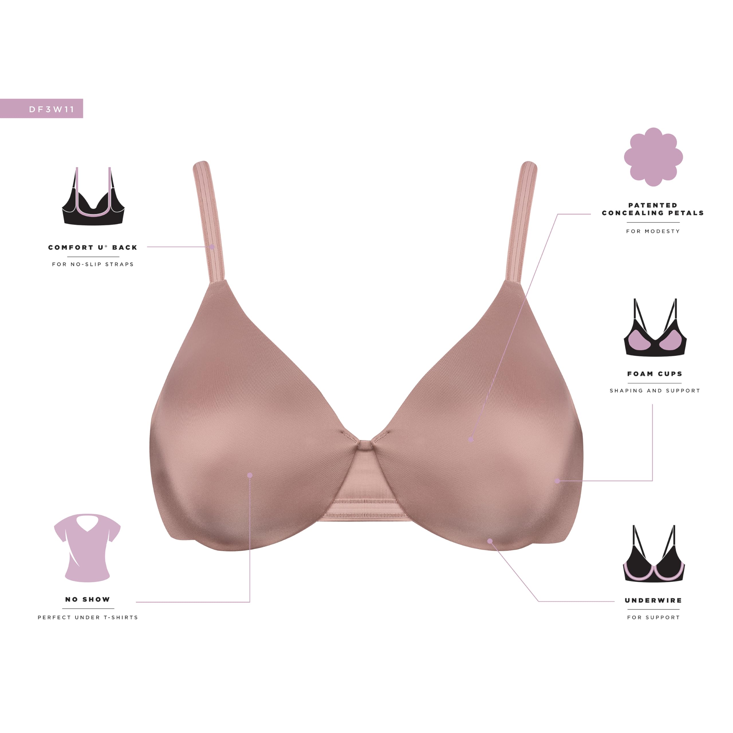 Description The Bali® One Smooth U® Underwire Bra for women is a full coverage bra designed to smooth, support, and shape while keeping you comfortable all day. This smoothing bra features petal-shaped concealing panels for modesty and seamless cups that deliver a flawless finish under tees, tops, and dresses—making it a go-to women’s t-shirt bra. The supportive underwire design provides shaping and lift, while the Comfort-U® back offers back smoothing and helps keep straps in place. Adjustable comfort straps create a secure fit that stays put, giving you confidence in a bra that looks invisible under clothes. Perfect for everyday wear, this underwire bra combines the sleek look of a smoothing t-shirt bra with the reliable comfort women want in their bras for work, weekend, or special occasions.