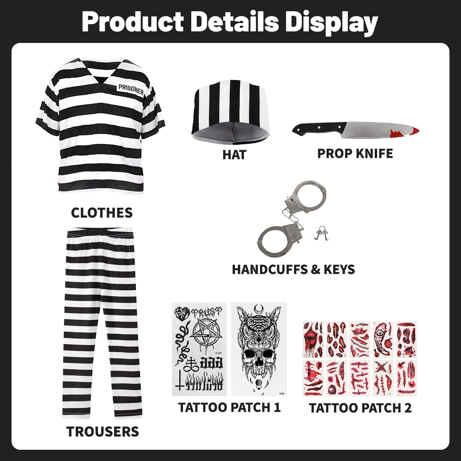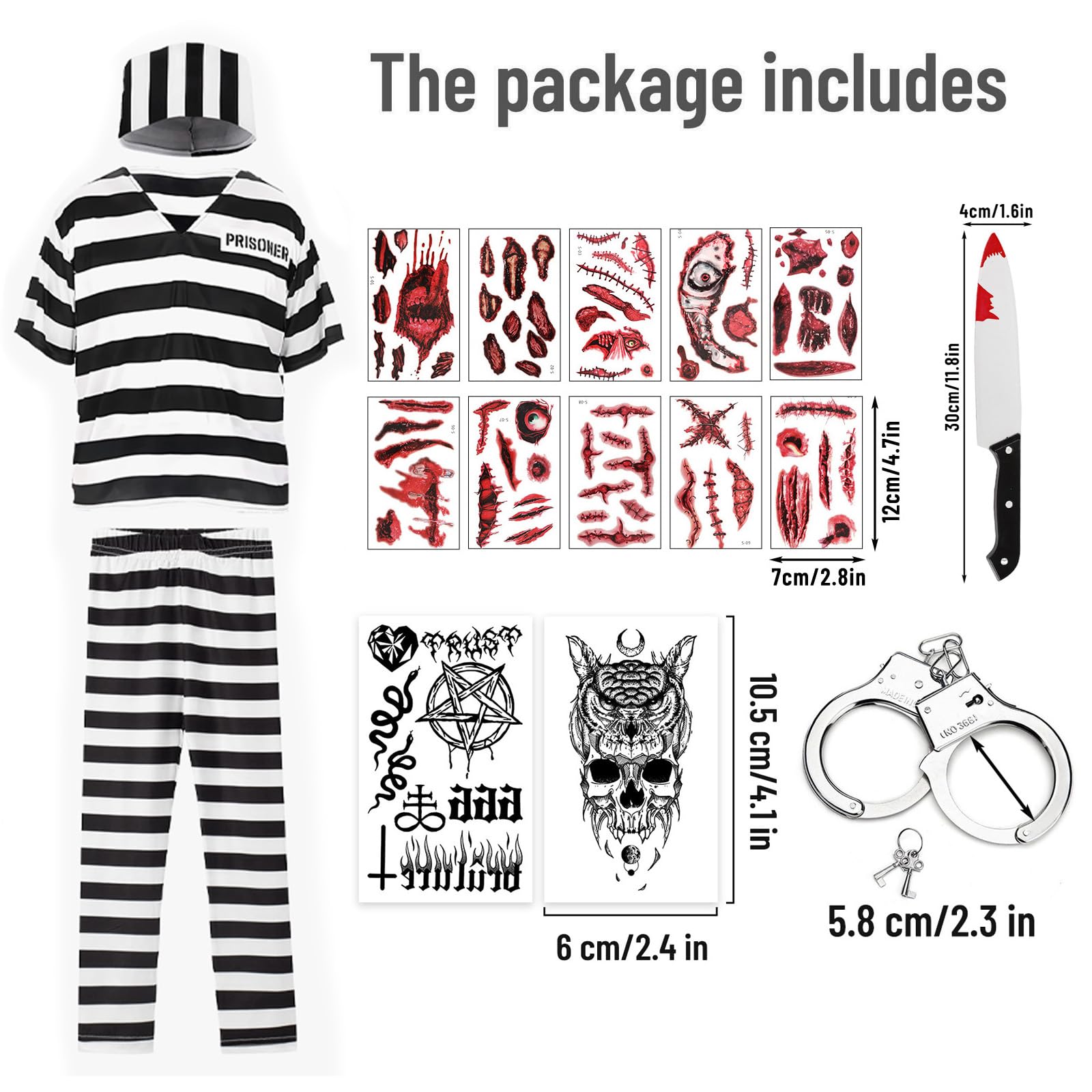 【Package List】: You will receive a complete adult prisoner jumpsuit, including 1 x prisoner costume set, 1 x fake plastic knife, 1 x prisoner accessories 4-piece set (1 pair of handcuffs, 1 x number sticker, 1 x tattoo sticker and 1 x name tag), and 10 x tattoo stickers helping you to transform into prison style of prisoners