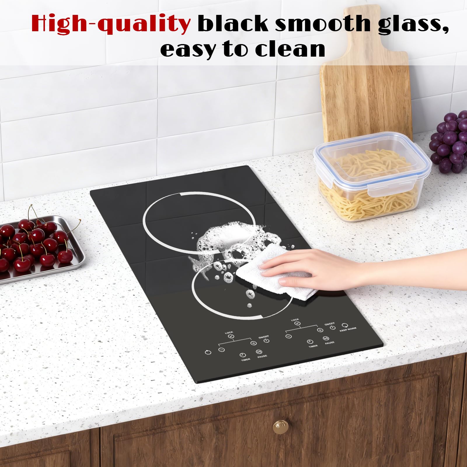 Upgrade your compact living space with the Karinear 12-Inch Electric Cooktop, where powerful performance meets a space-saving design. This built-in stove top is engineered to deliver a full kitchen cooking experience in apartments, tiny houses, without compromising on power or safety. Powerful & Precise Cooking in a Compact Size Experience fast and efficient heating with a total of 3000W power. The 2 burners electric cooktop includes a large 7.87" 1800W burner for your main pot and a 6.5" 1200W burner for sides or sauces. The 9 adjustable power levels for each burner provide the precision you need for everything from a gentle simmer to a rolling boil, making it a versatile kitchen hob for every meal. Smart, Safe, and Simple to Use Enjoy the sleek, modern look of touch sensor controls. Advanced safety features are built-in for your family's protection: the child lock function securely disables the control panel, the auto switch-off timer prevents overcooking, and the hot surface indicator light warns you of residual heat. It's the perfect safe stove for busy households. Designed for Effortless Maintenance and Broad Compatibility The sleek black glass surface is not only stylish but incredibly easy to clean. A free scraper is included to tackle any stubborn residues. As a radiant electric cooktop, it works with any pot and pan you own—cast iron, aluminum, ceramic, you name it. Installation Note: This cooktop requires a 240V hardwired connection and professional installation. Stovetop Size: 20.47" x 11.4"; Cut-out Size: 19.3" x 10.63" x 1.7".
