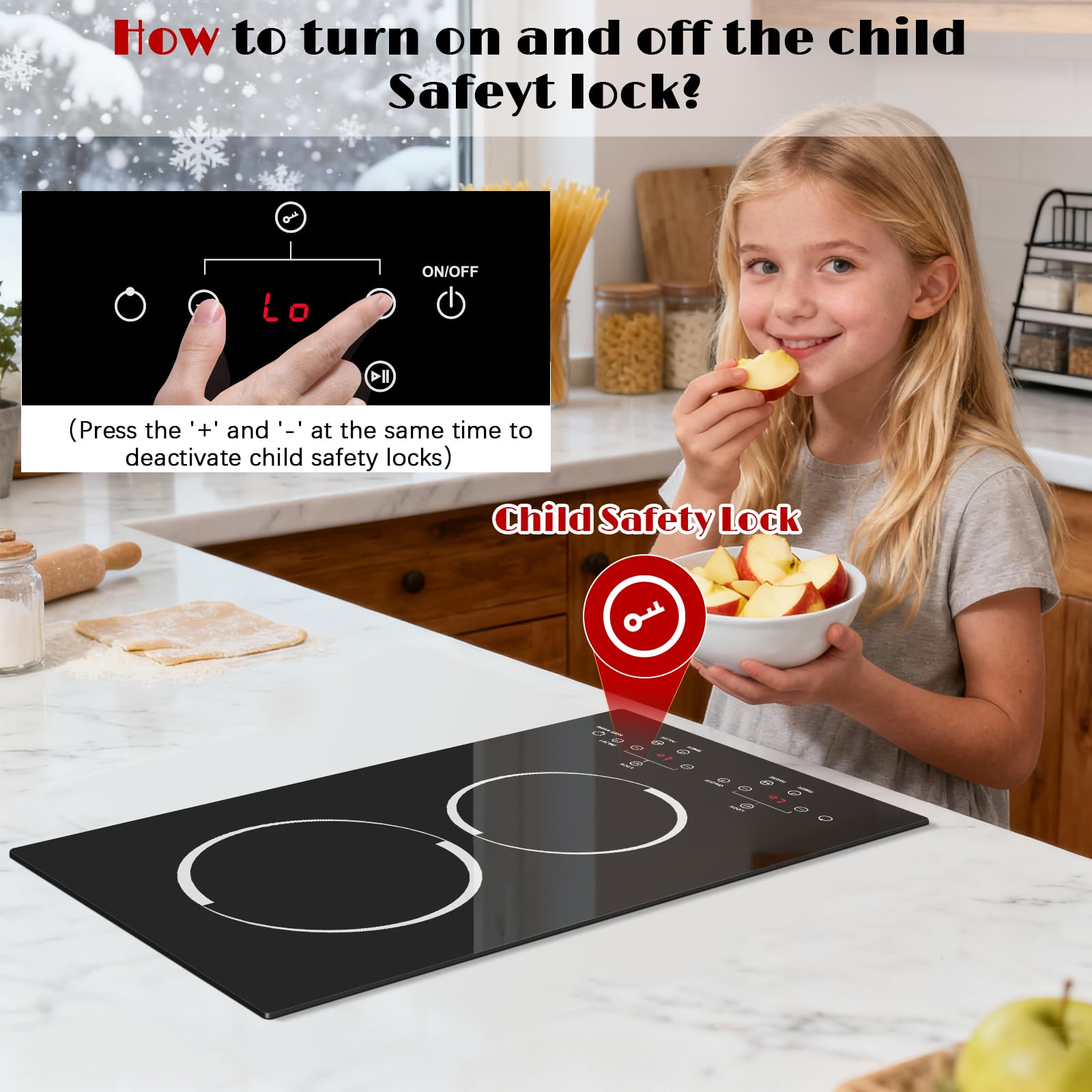 【Advanced Safety for Peace of Mind】 Your family's safety is our priority. The child safety lock is easily activated/deactivated by pressing '+' and '-' simultaneously, locking the controls (display shows "Lo"). This safety electric cooktop also includes a 99-minute timer with auto shut-off, residual heat indicator, and over-temperature protection.