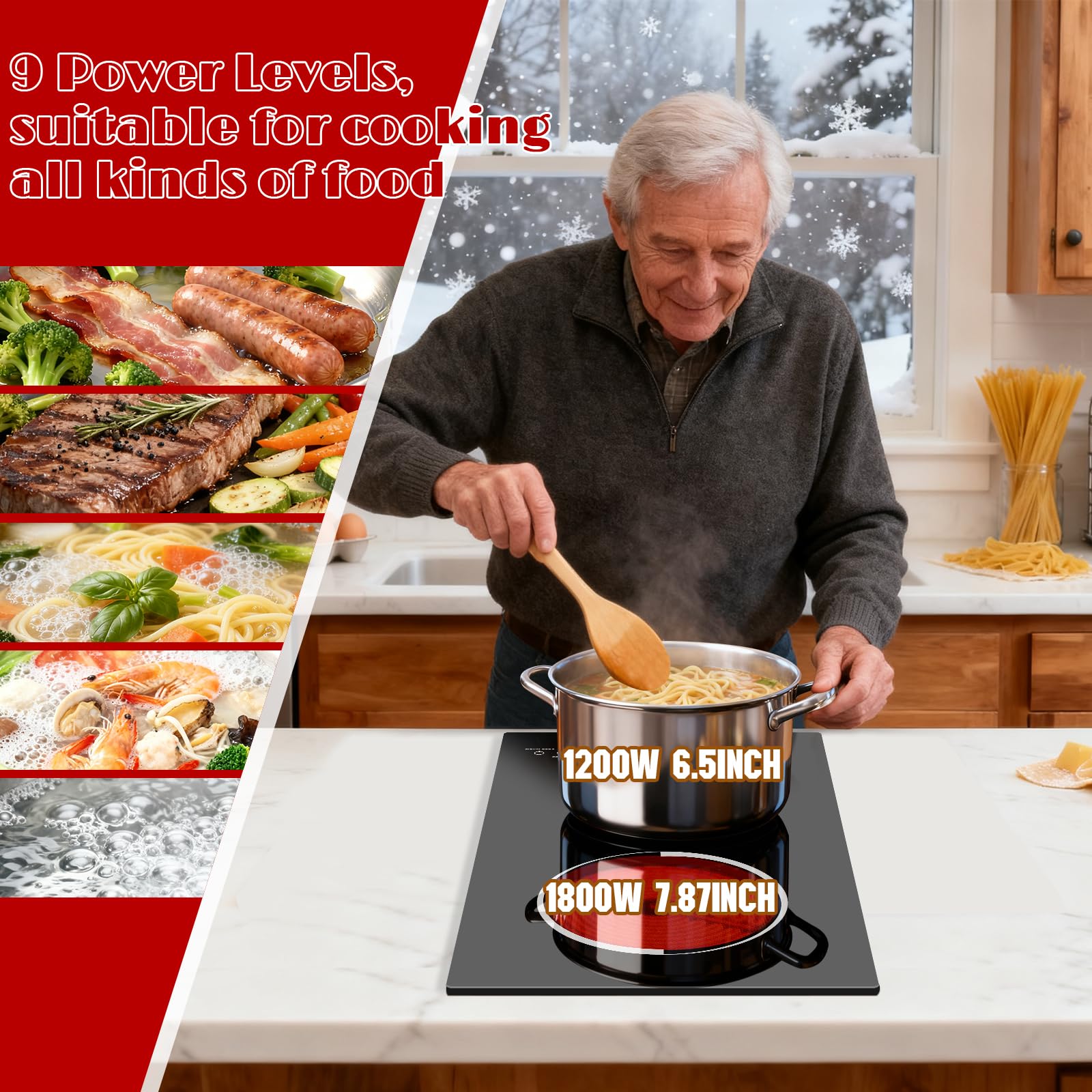 【Smart Touch Control & 9 Power Levels】 Enjoy modern and effortless control. This 12" electric ceramic cooktop features a sleek touch control panel for a seamless look. Electric cooktop 2 burner offers 9 precise power levels, giving you ultimate control from a gentle melt to a vigorous boil, perfect for cooking all kinds of food with precision.