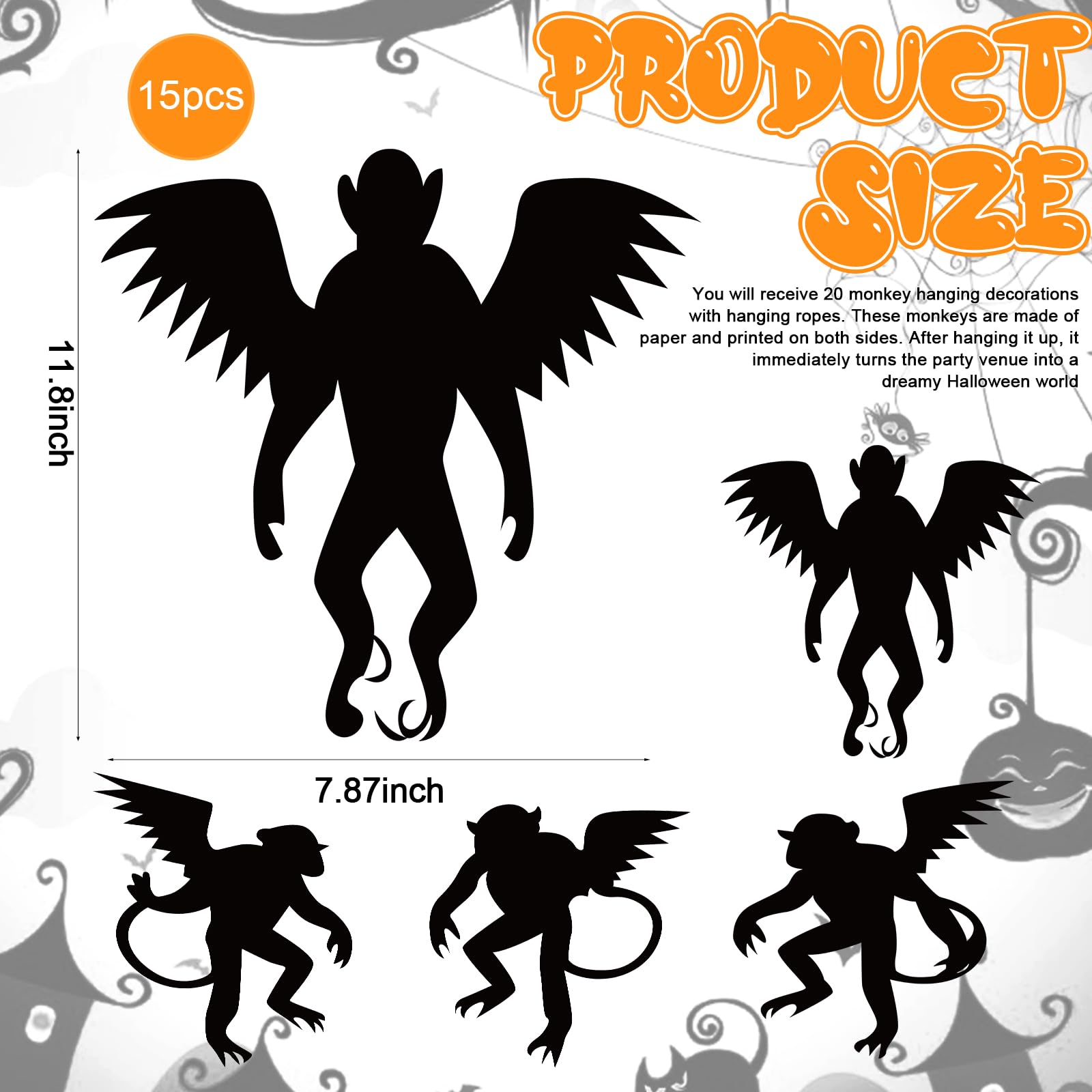 Features: Decoration technique: The distance between our hanging monkeys can be adjusted, and you can add other decorations in the middle. In addition, you can match LED lights, balloons, banners, and various photo props on this background to create a beautiful atmosphere! Multi functional decoration: This black hanging monkey banner offers a variety of Halloween decoration options. Use it to decorate walls, trees, windows, furniture, doors, or as a background for a photo booth, through the doorway, or as a centerpiece decoration on a party table. Its flexibility allows seamless integration into any Halloween theme or scene. Specifications: Material: paper Color: black and red Size: 30 x 20 cm Package includes: 15 Monkey hanging decorations with hanging ropes Notes: Manual measurement, please allow slight errors on size. The color may exist a slight difference due to different screen displays