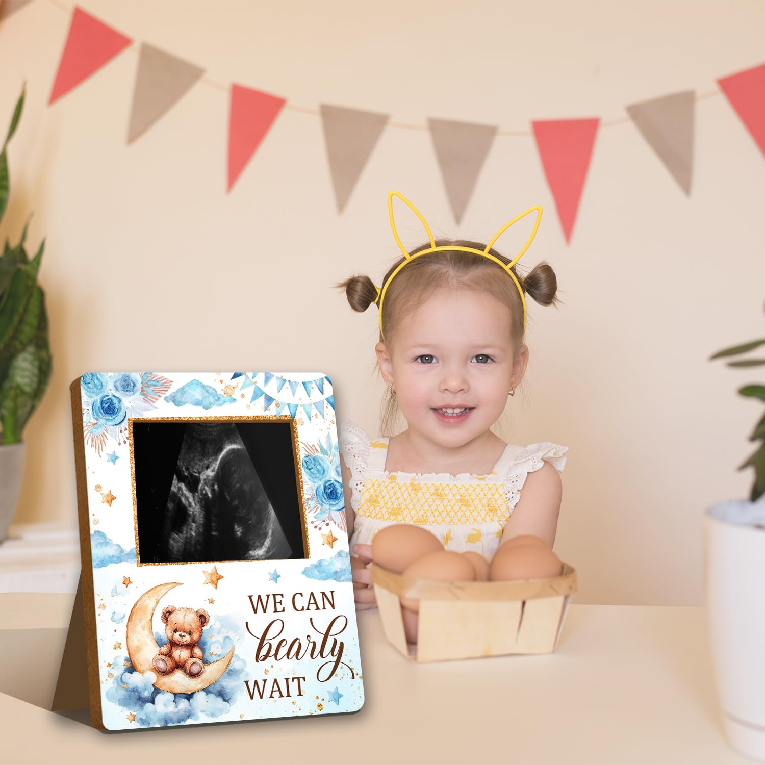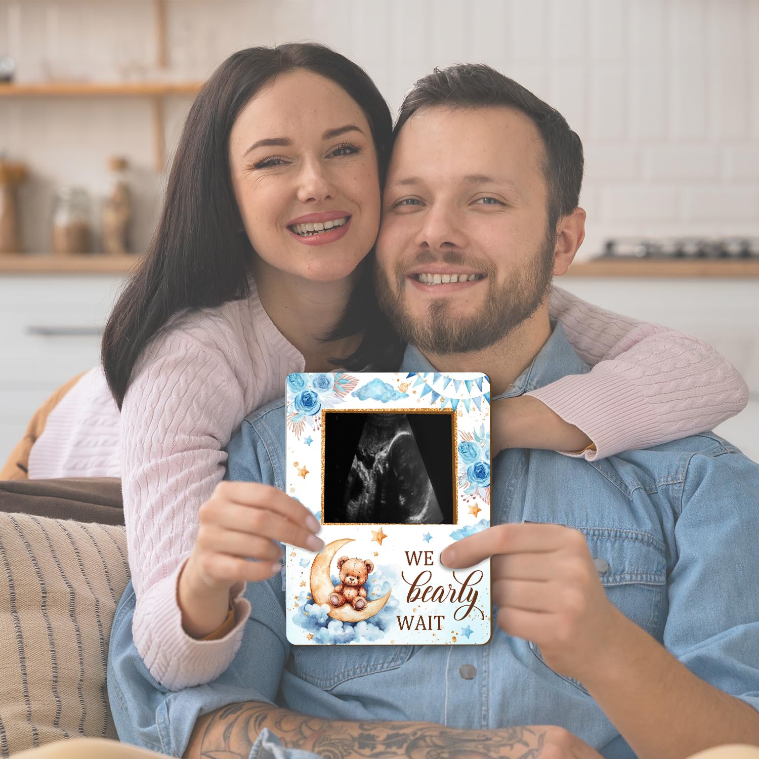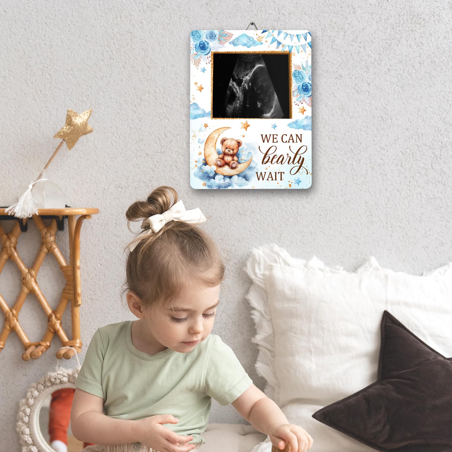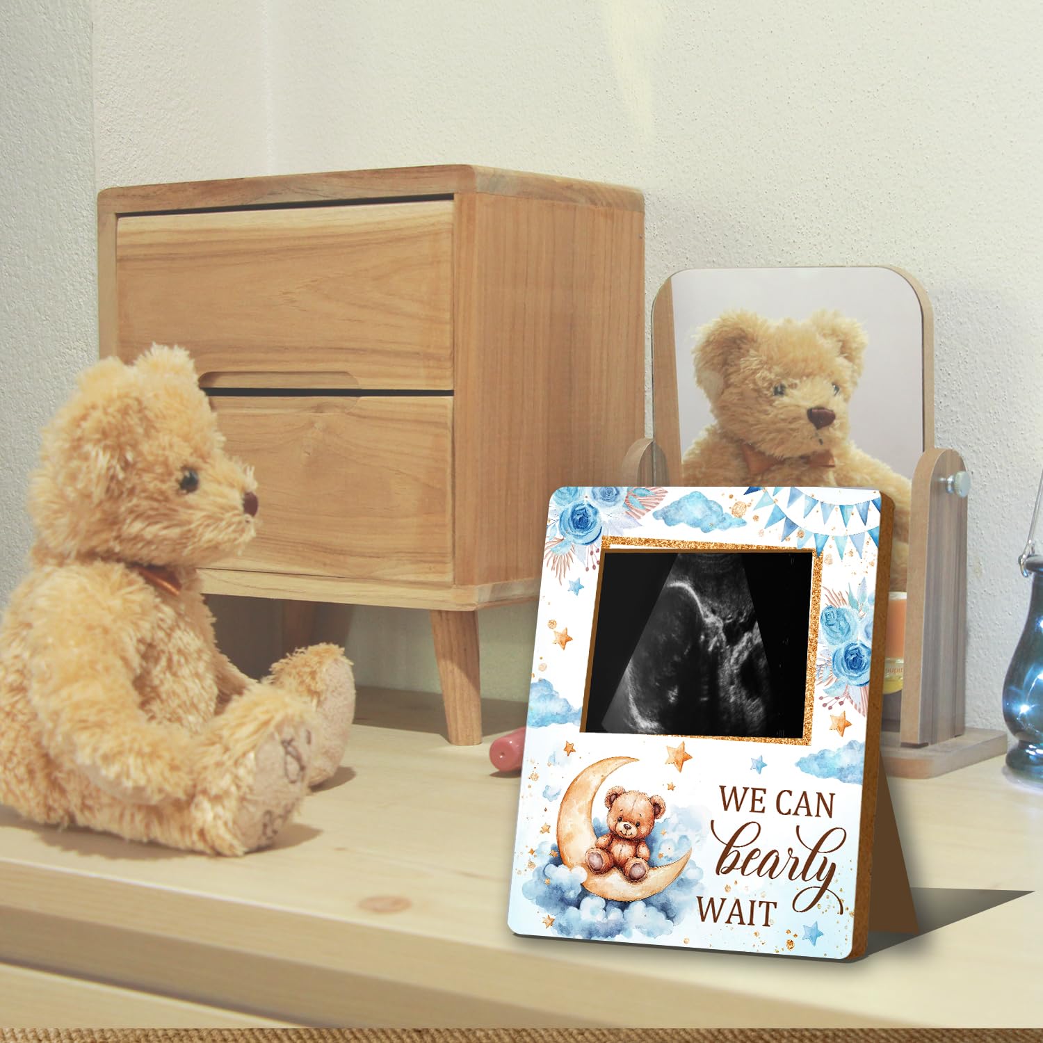 Material: This Bear baby ultrasound photo frame for expectant parents, has clear printing and is made of wood material. It is sturdy and not easily damaged and can be used by you for a long time.