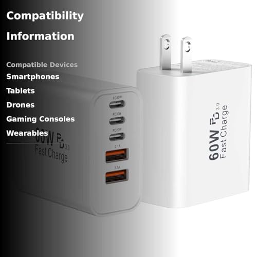 Compact and Portable Phone Charger Brick: Designed with the pocket-friendly compact body and 5-port charging adapter, the USB C box is integrated to charge multiple devices at home, office and travel. Small size saves you space and fits perfectly into pockets, handbags, travel cases. Packaged with dual 60W 5-port usb c wall chargers (cable not included). If you have any problems with the c type charger block, please contact us