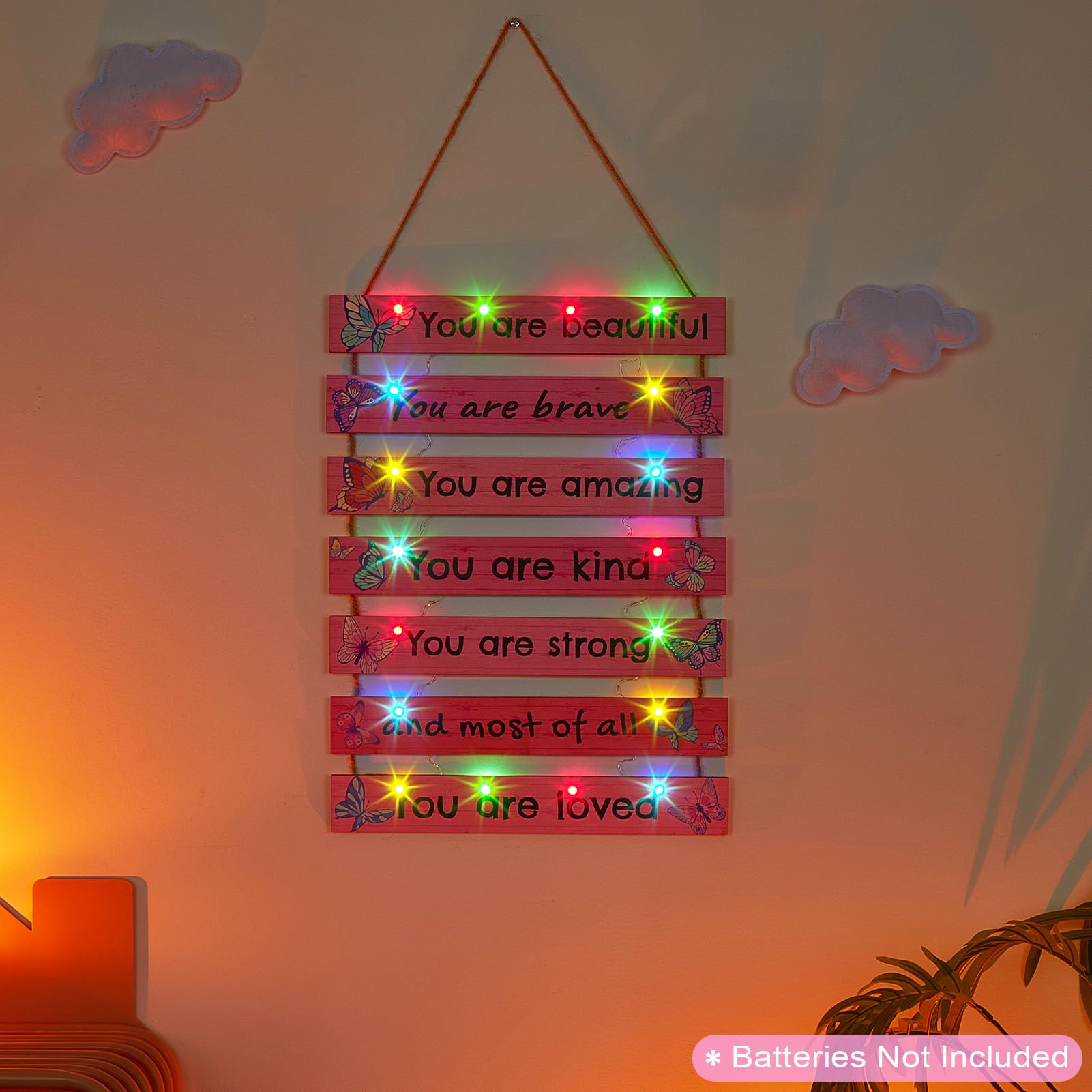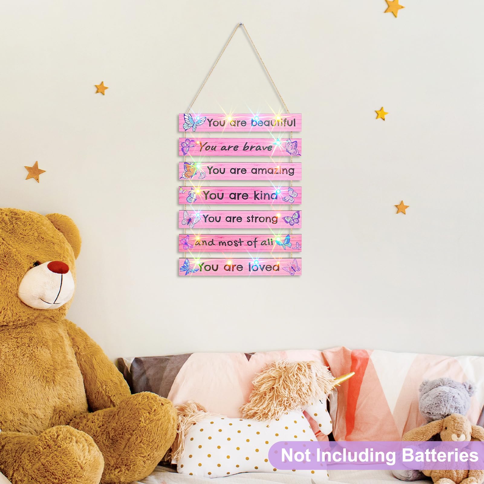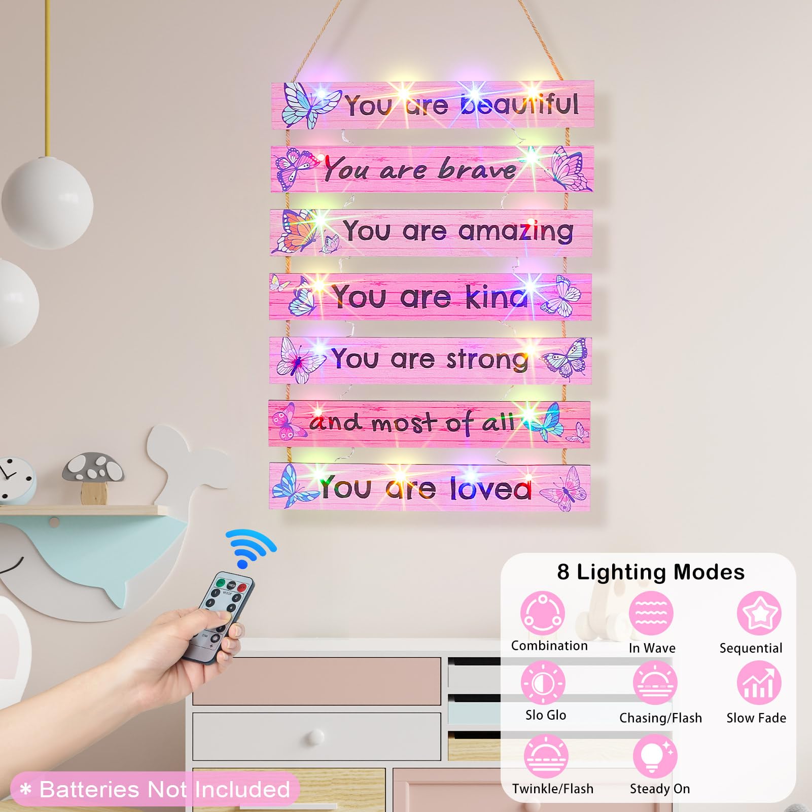 Package: The play room decor for kids package includeds 1 pcs girls room decor board, 1 pcs LED light with empty battery box (not including batteries), 1 pcs remote control (not including batteries), both do not including batteries, need to be purchased by customers themselves