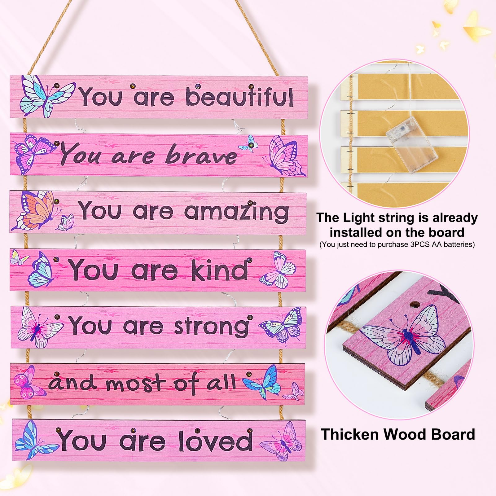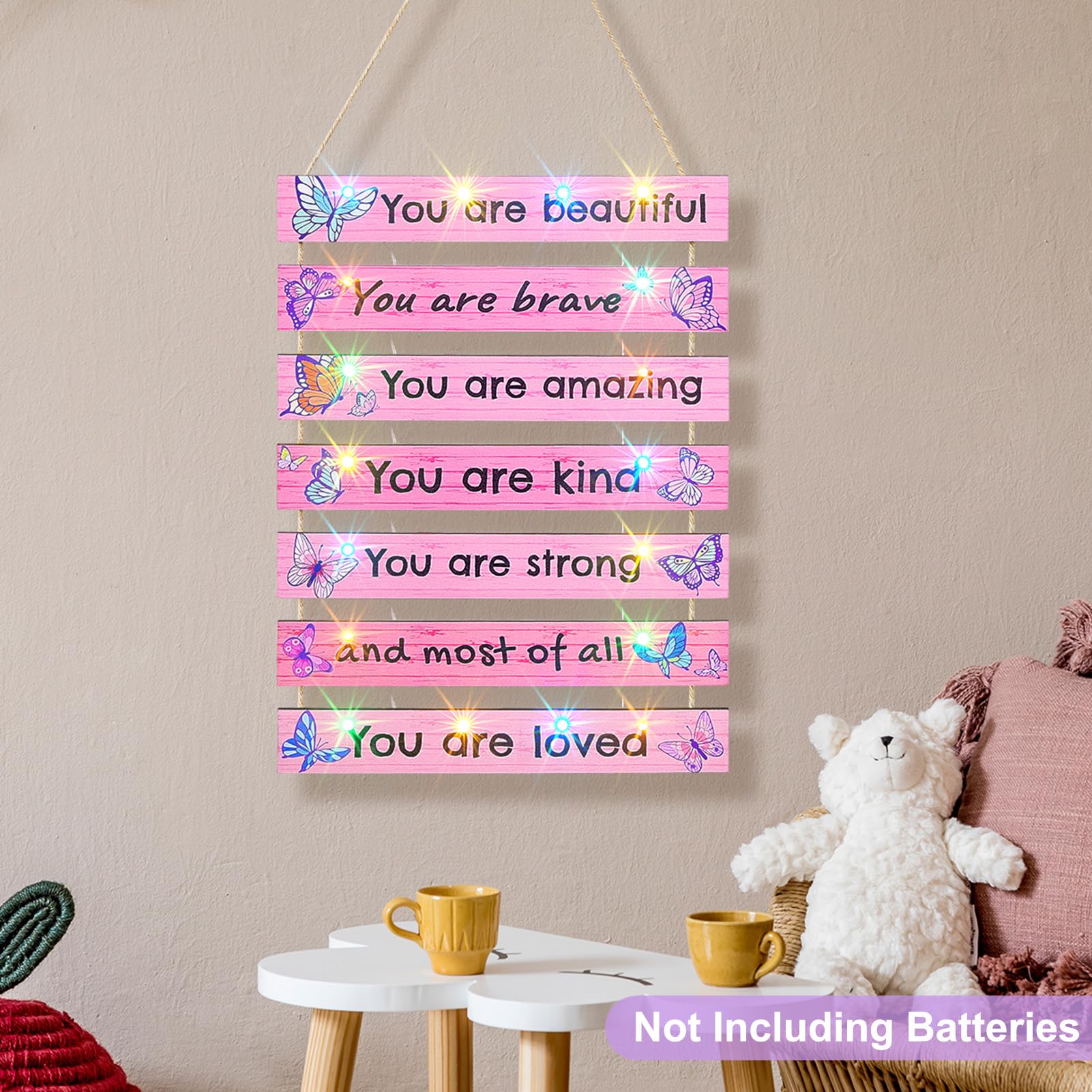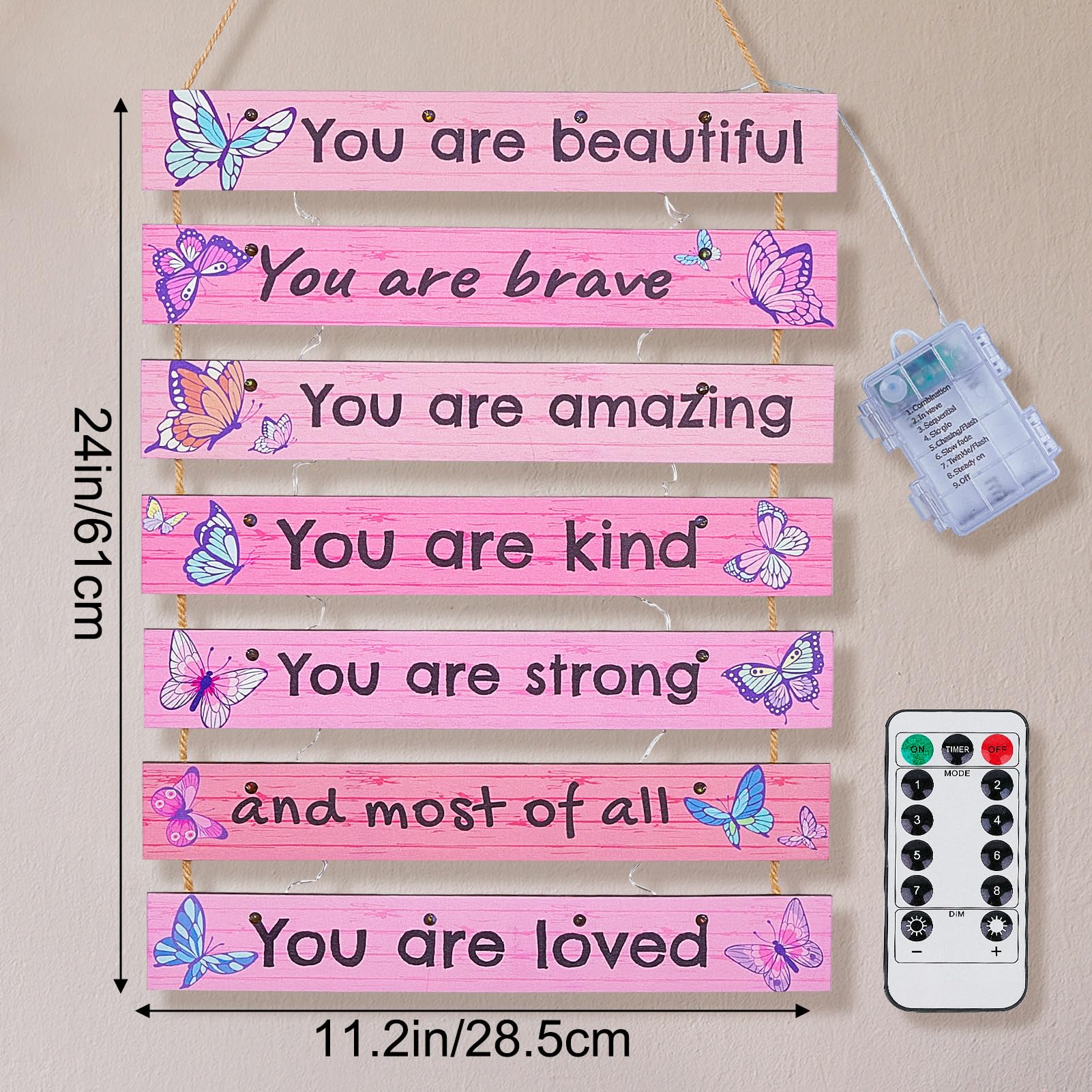 Package: The play room decor for kids package includeds 1 pcs girls room decor board, 1 pcs LED light with empty battery box (not including batteries), 1 pcs remote control (not including batteries), both do not including batteries, need to be purchased by customers themselves