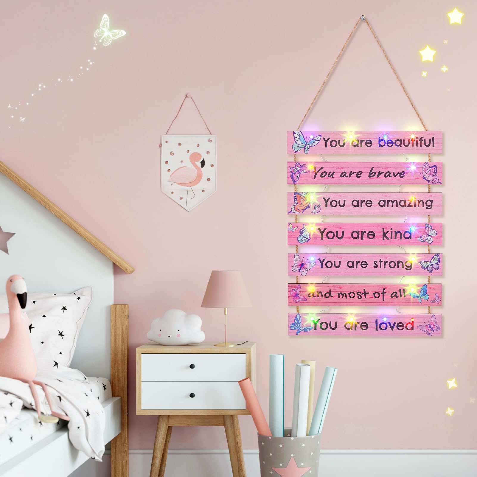 Easy to Hang: It is easy to hang the nursery decor on the wall, with long hemp string for hanging, no installation required; It is convenient for your kids to decorate their bedroom; Ideal for baby girls or kids' bedrooms, nursery, kindergarten, living room, play room