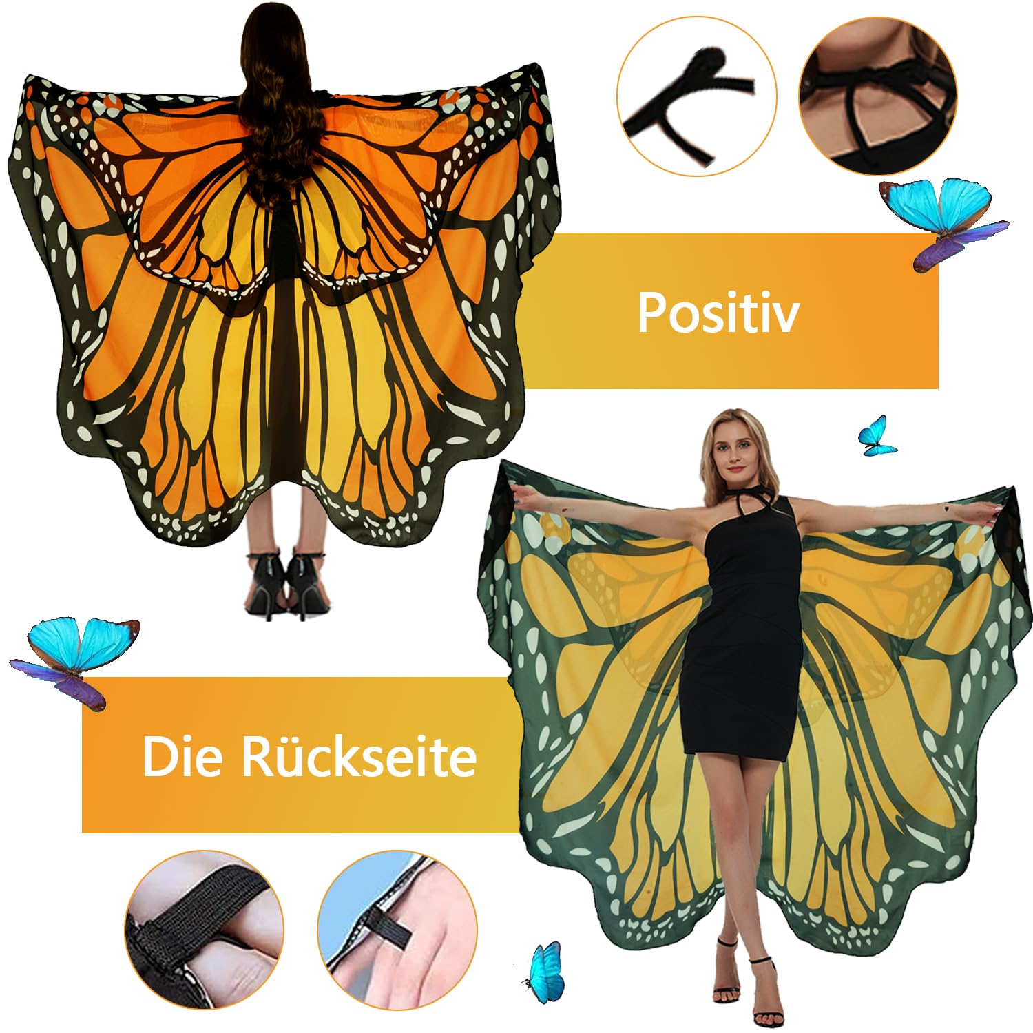 🦋【Two Layer Butterfly Wings Design】:24 years newest butterfly costume women monarch butterfly wings with double layer styling design, made of soft breathable chiffon fabric; double layer adult butterfly costume women with unique styling, the small butterfly on the top layer can be worn flexibly in a variety of shapes, and it can be used as a silk scarf, necklace and other decorative uses.