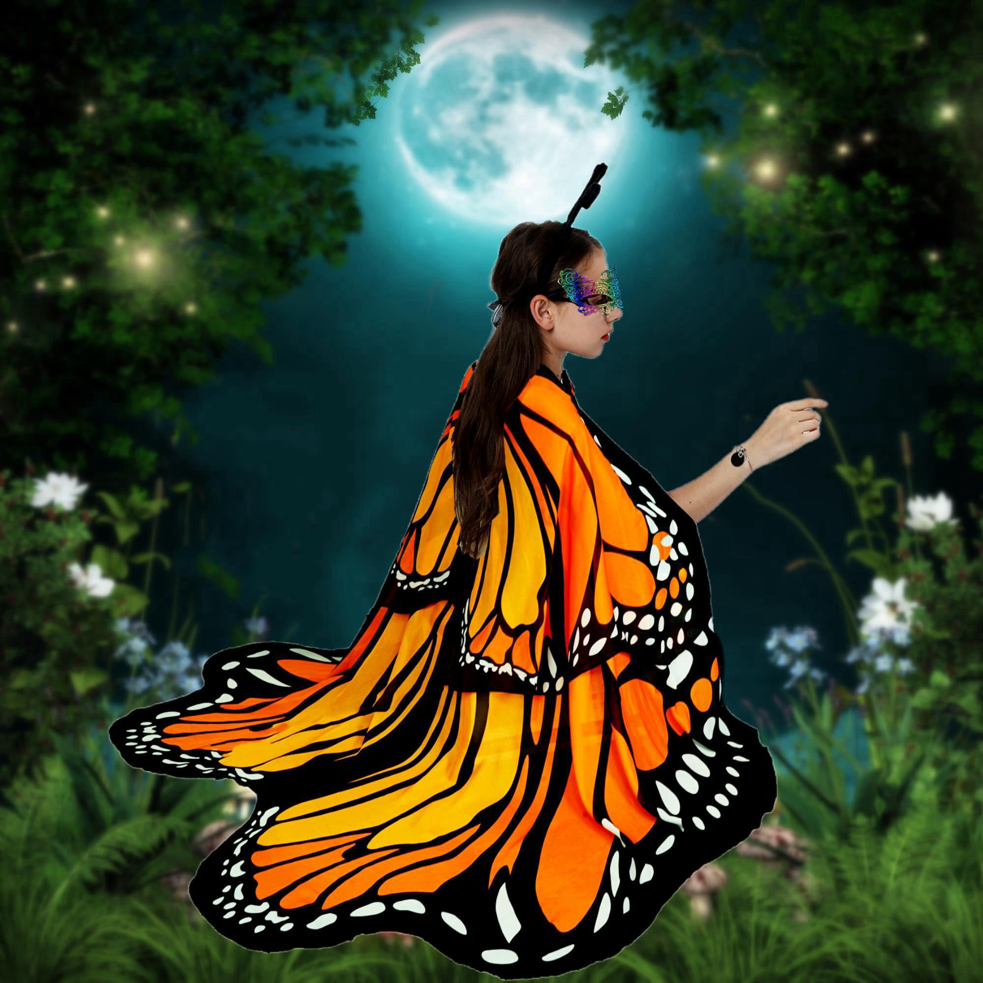 🦋【Butterfly Costume Adult 3 Pieces】:This Adult Butterfly Costume Women consists of one two-layer butterfly Wings cape, 1 butterfly hairband and 1 colorful and charming lace mask; Butterfly Wings for Adults Size: 198cm/78inch*140cm/55inch, with a freely adjustable sized drawstring elastic band around the neckline, and a hand clasp end for the Butterfly Costume Women's Costume There is a hand clasp.