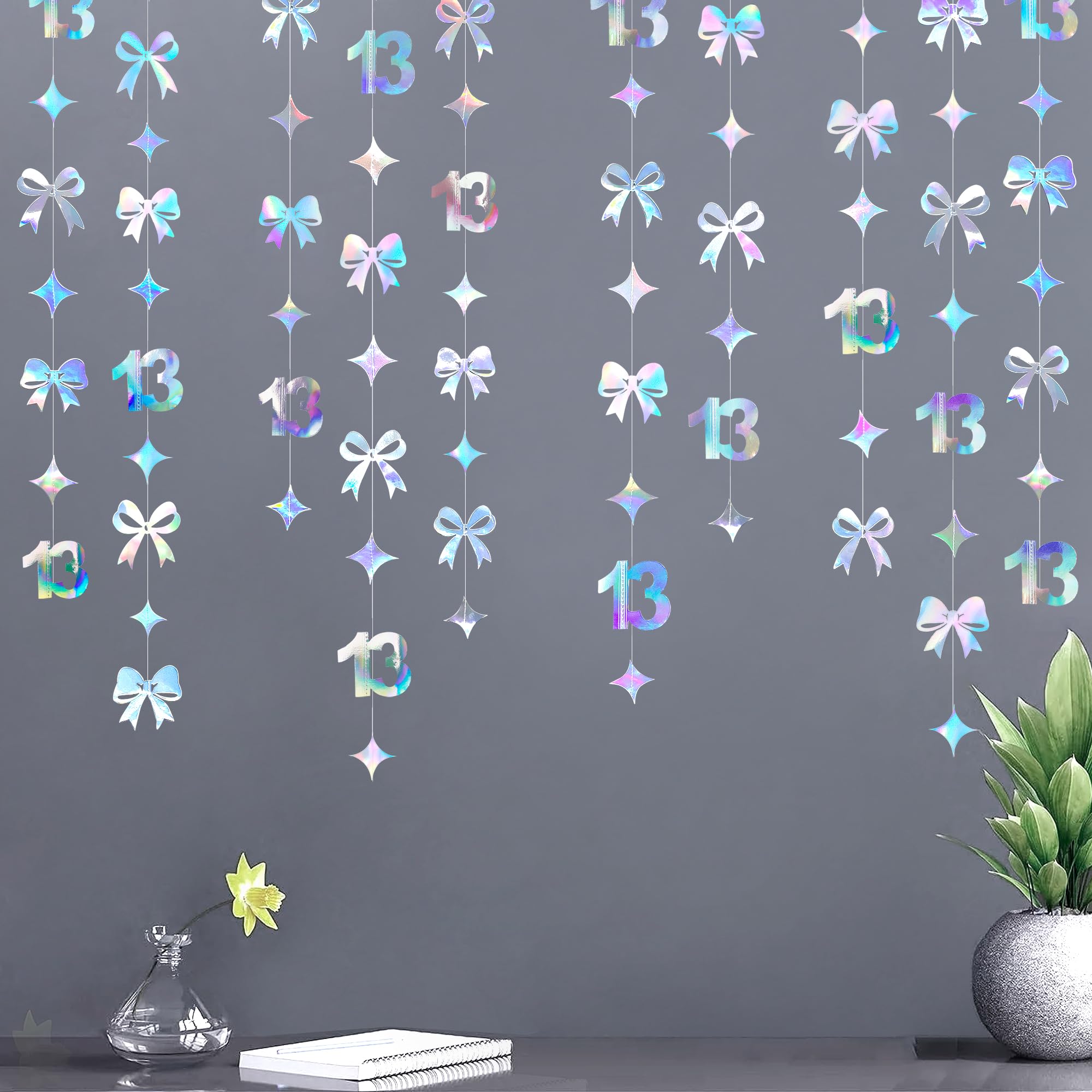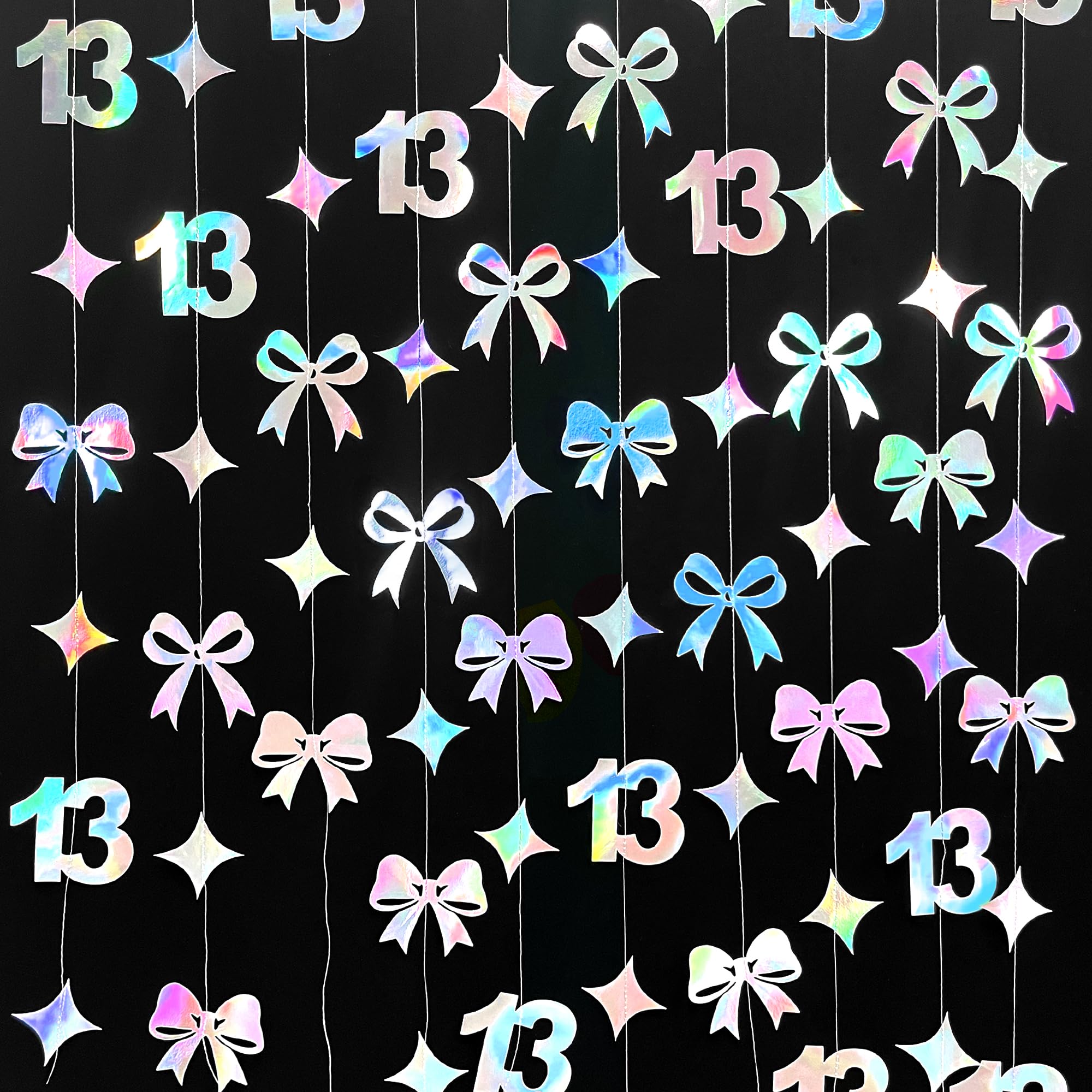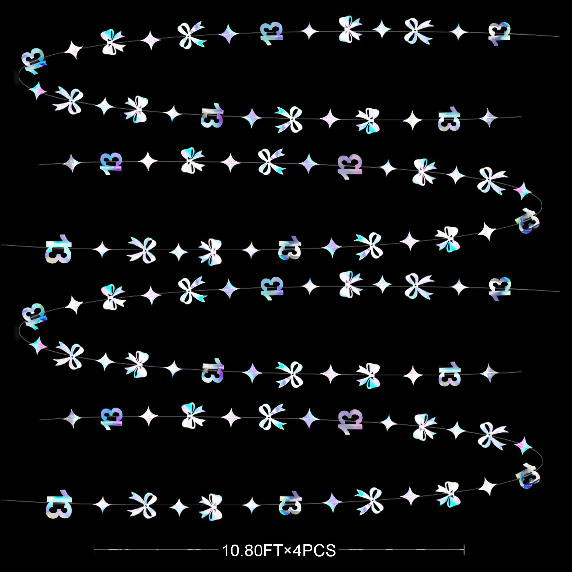 👍 Package includes - 4 strings of 10.8 feet/3.3 meters iridescent number 13 and conquette bow with sparkling twinkle star and circle dots garlands , totally is 43.2 feet/13.2 meters
