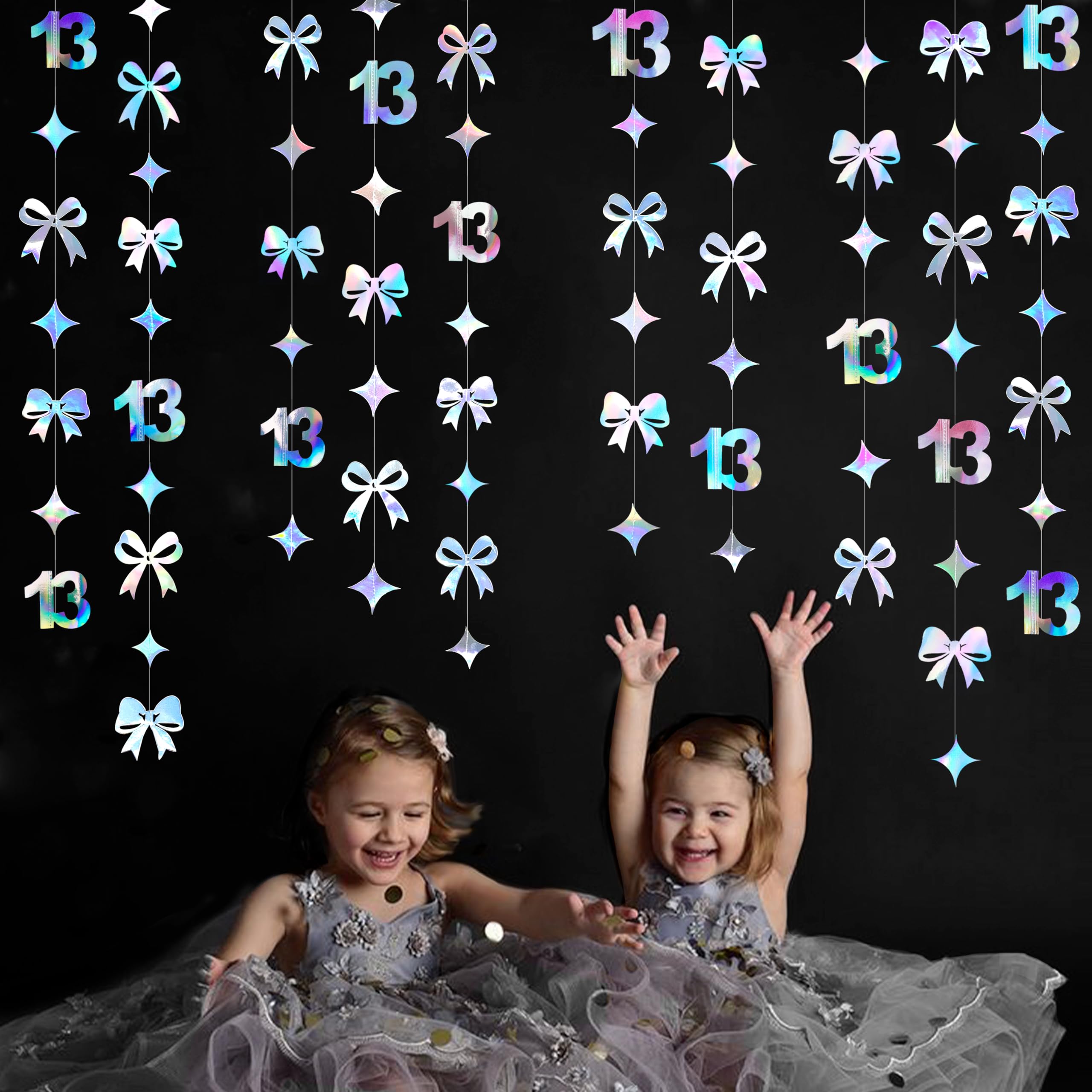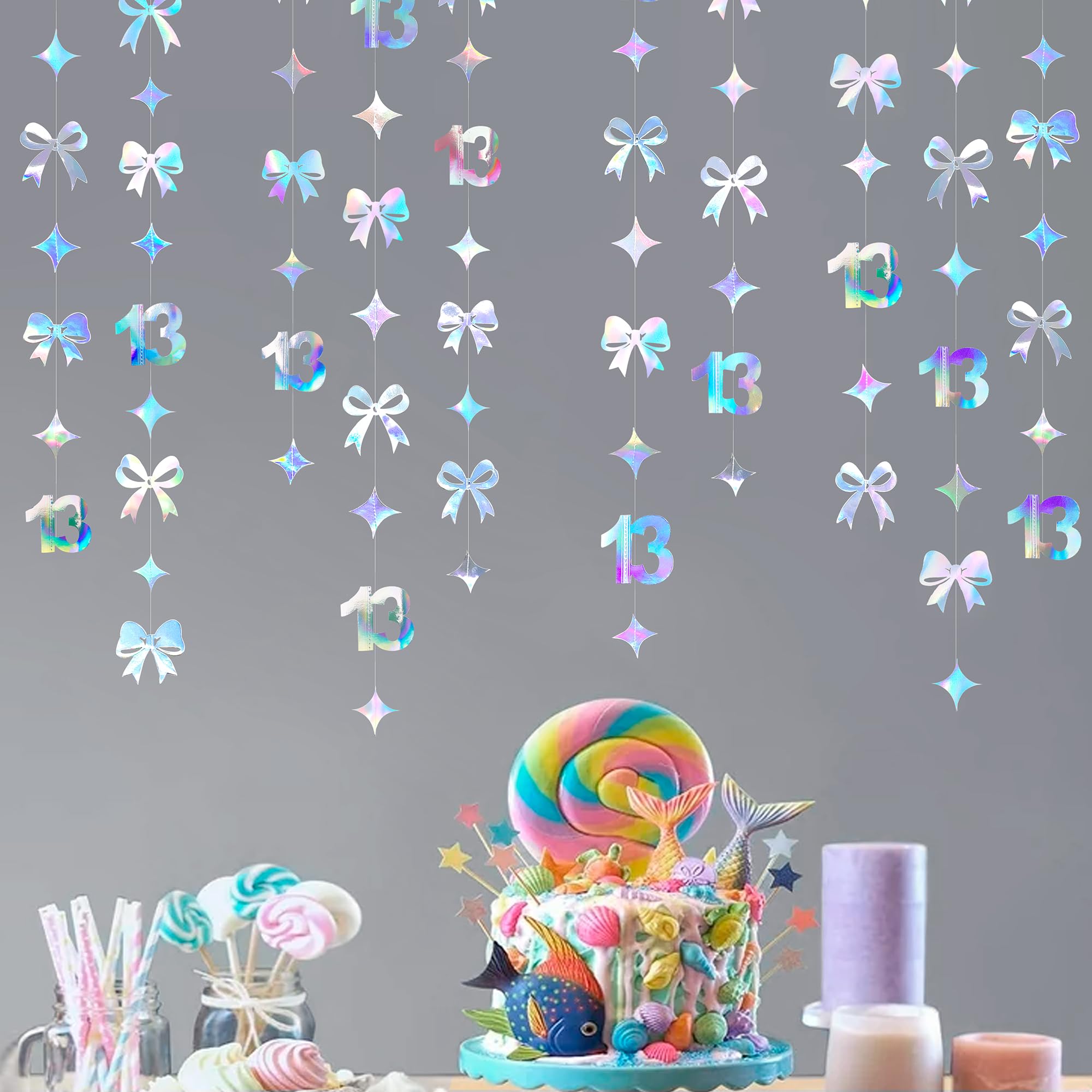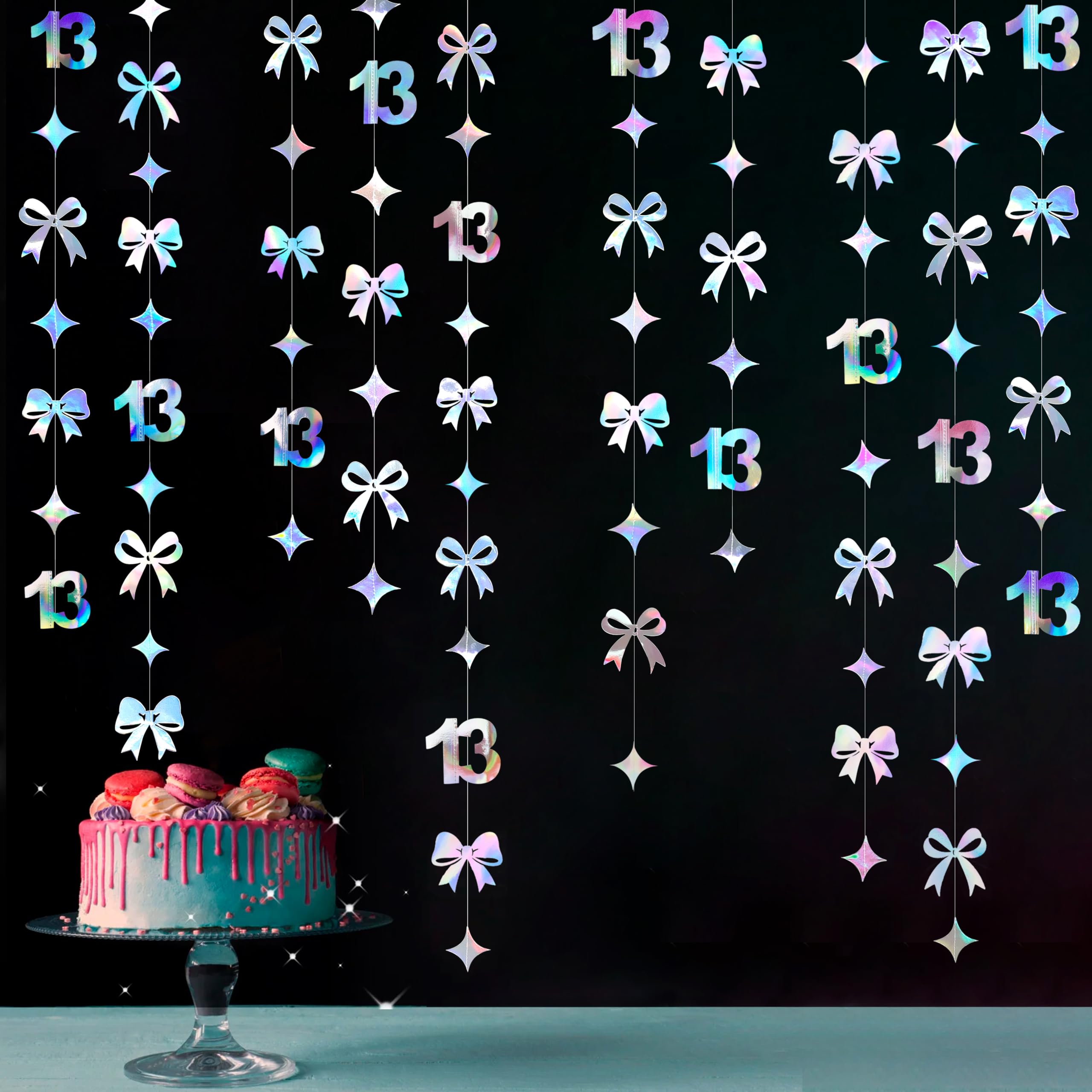 👍 Package includes - 4 strings of 10.8 feet/3.3 meters iridescent number 13 and conquette bow with sparkling twinkle star and circle dots garlands , totally is 43.2 feet/13.2 meters