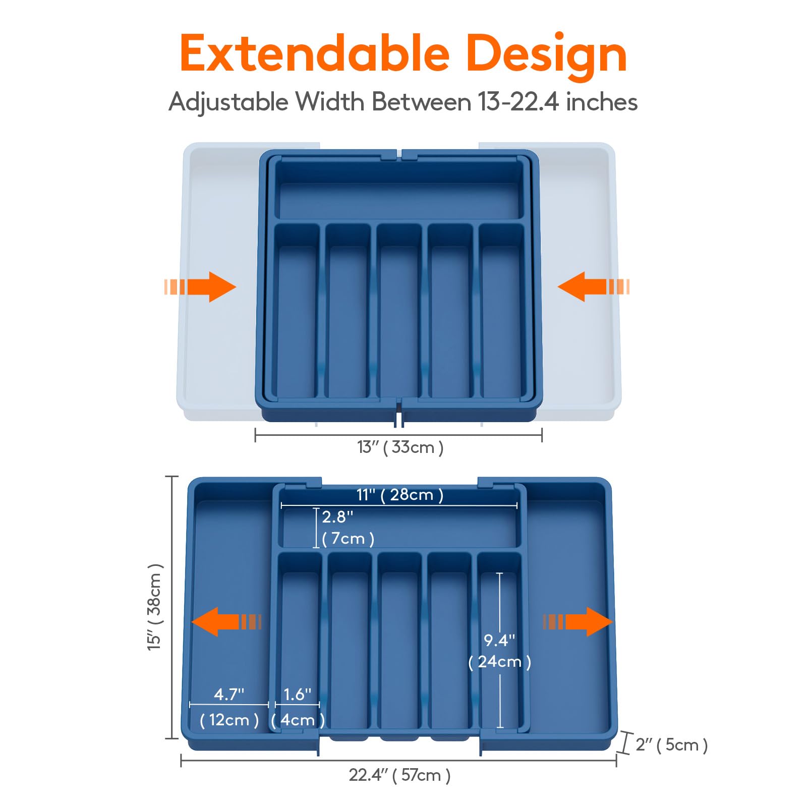 Adjustable Design: With its retractable design, The Lifewit silverware organizer fits drawers of various sizes and shapes. It measures 13'' wide when folded while reaching 22.4'' when fully expanded. This universal utensil drawer organizer helps you maximize storage space efficiently while keeping your utensils neatly organized and easily accessible